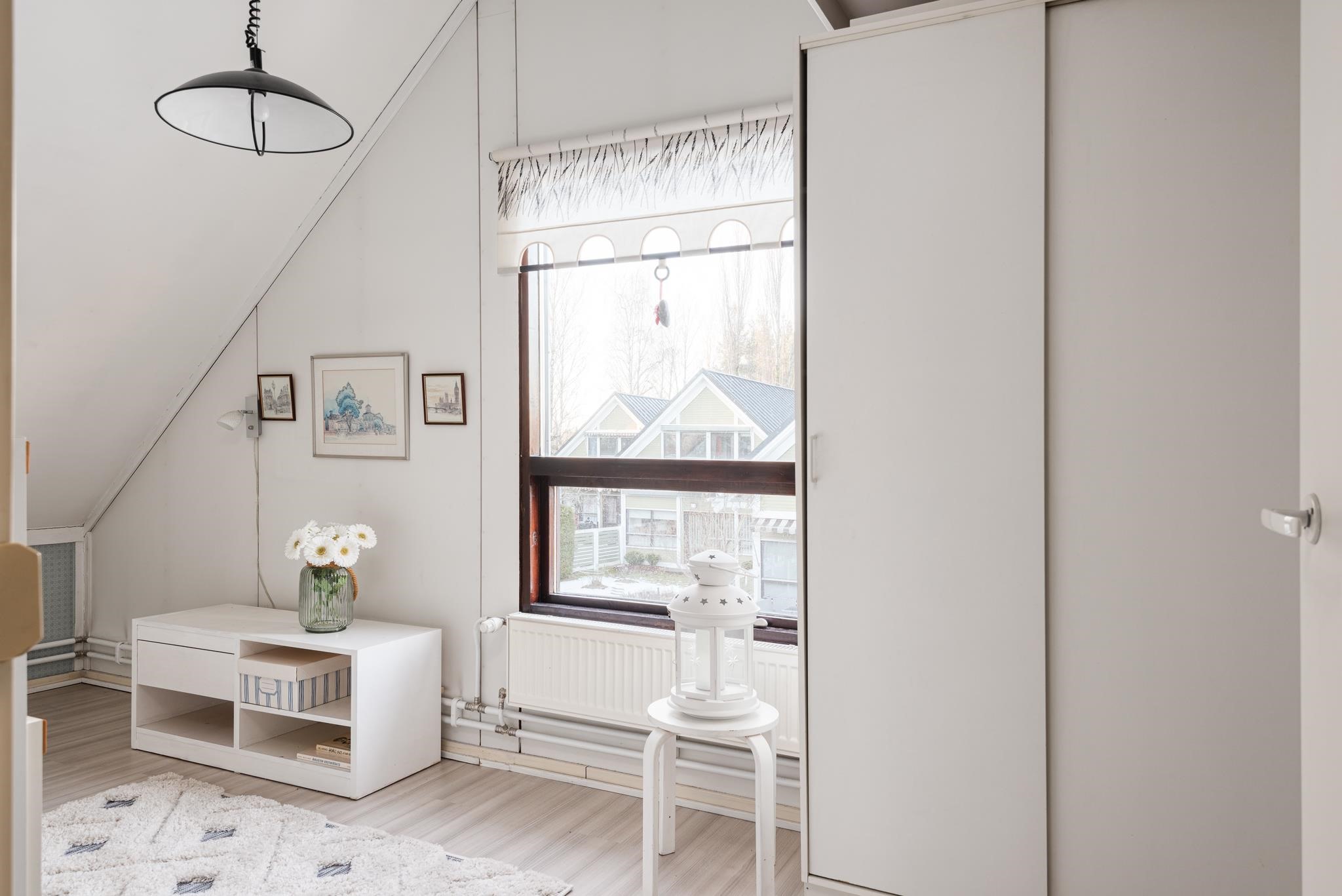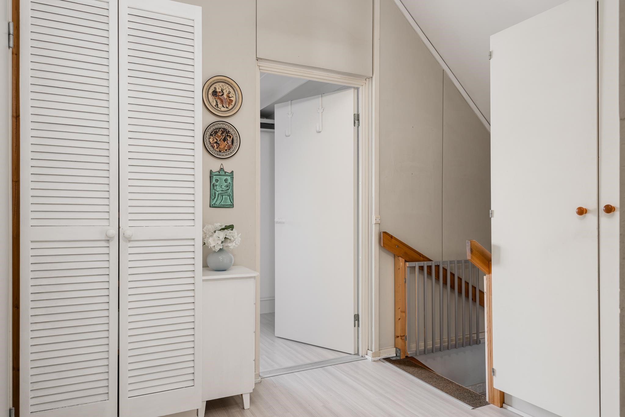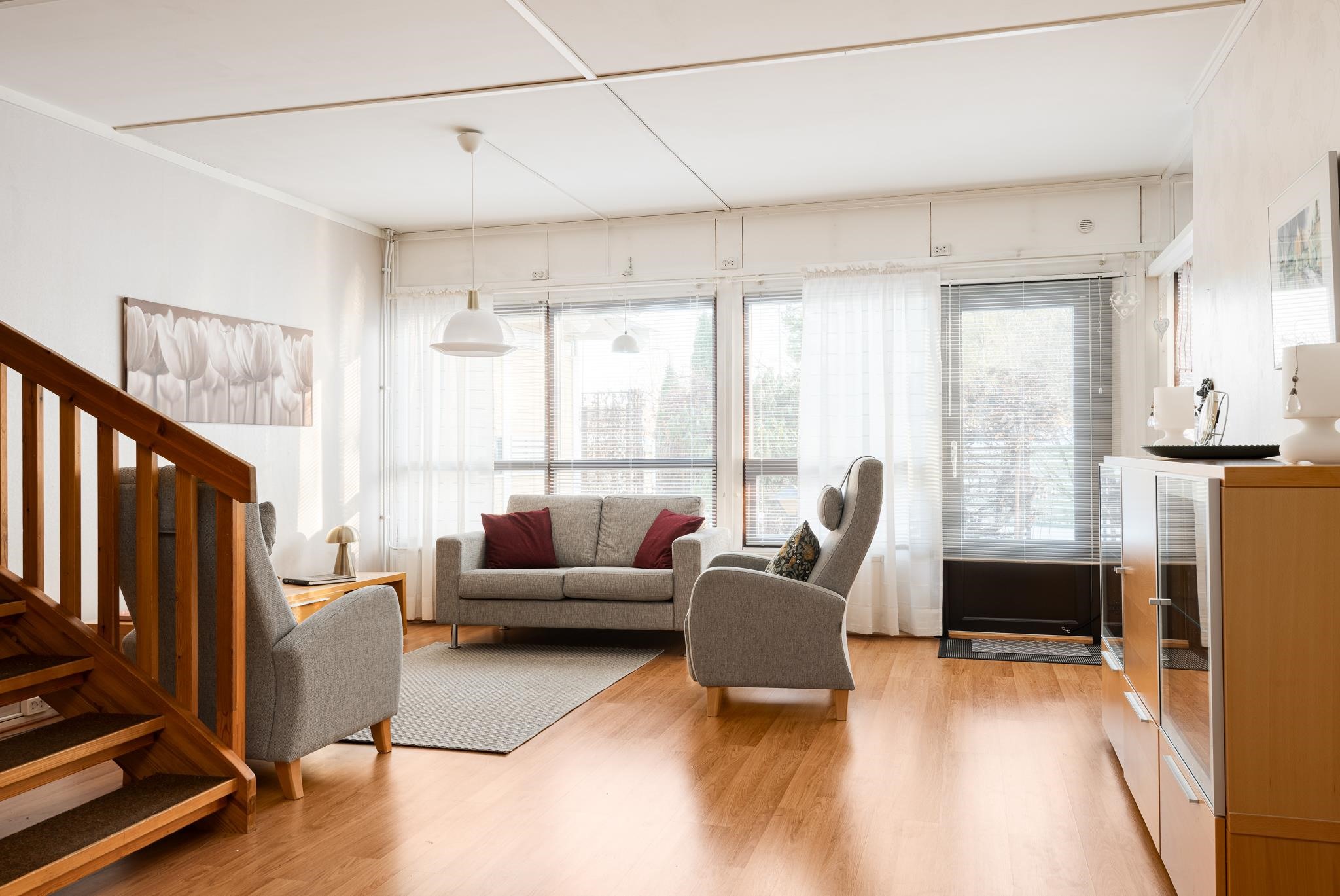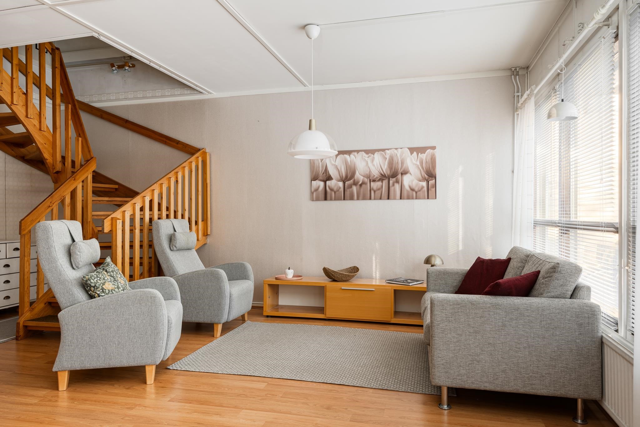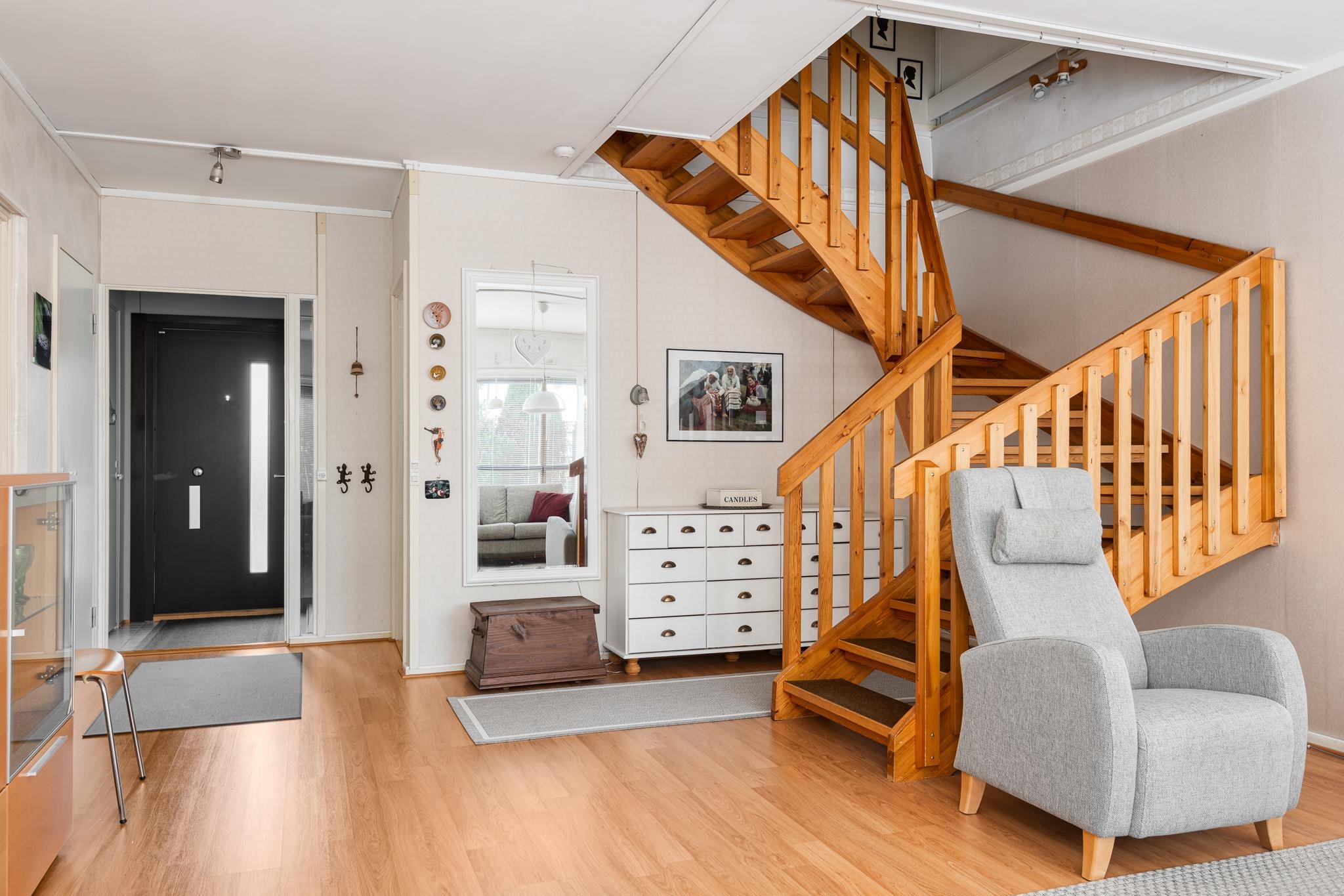 Keittiö: Laatta, laminaatti. Olohuone: Laminaatti. Makuuhuone 1: Muovimatto alakerrassa. Makuuhuone 2: Laminaatti. Makuuhuone 3: Laminaatti. Sauna: Laatta, paneeli. Kylpyhuone: Laatta. Eteinen: Laatta. Wc: Muovimatto. Makuuhuone 3: Laminaatti.