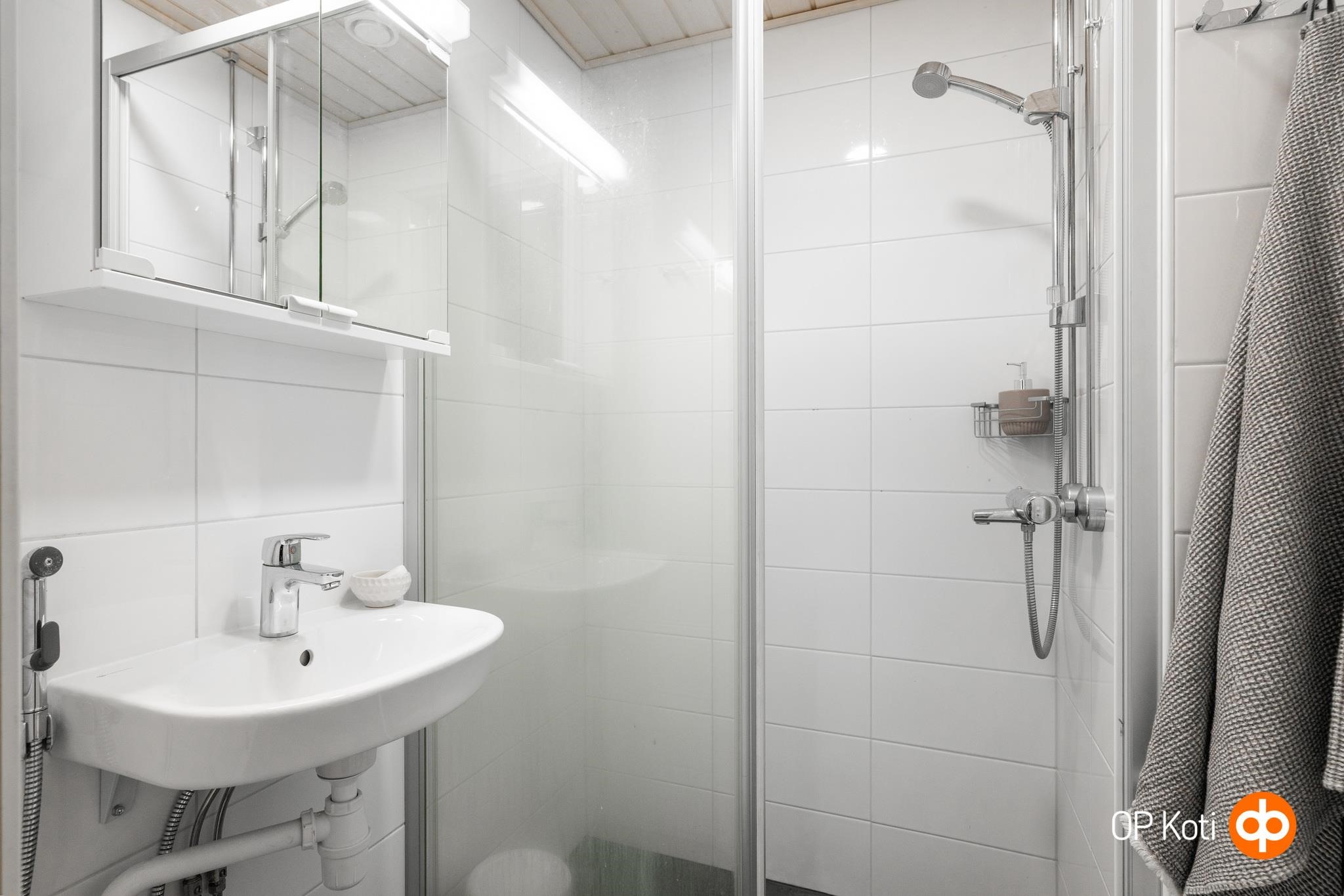 - Kylpyhuone, suihkuseinä, peilikaappi, kiinteät valaisimet. Remontoitu linjasanerauksen yhteydessä