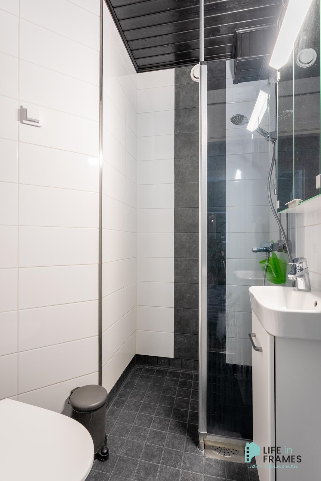 - Kylpyhuone, suihku, suihkuseinä, peilikaappi, allaskaappi, lattialämmitys, kiinteät valaisimet.
