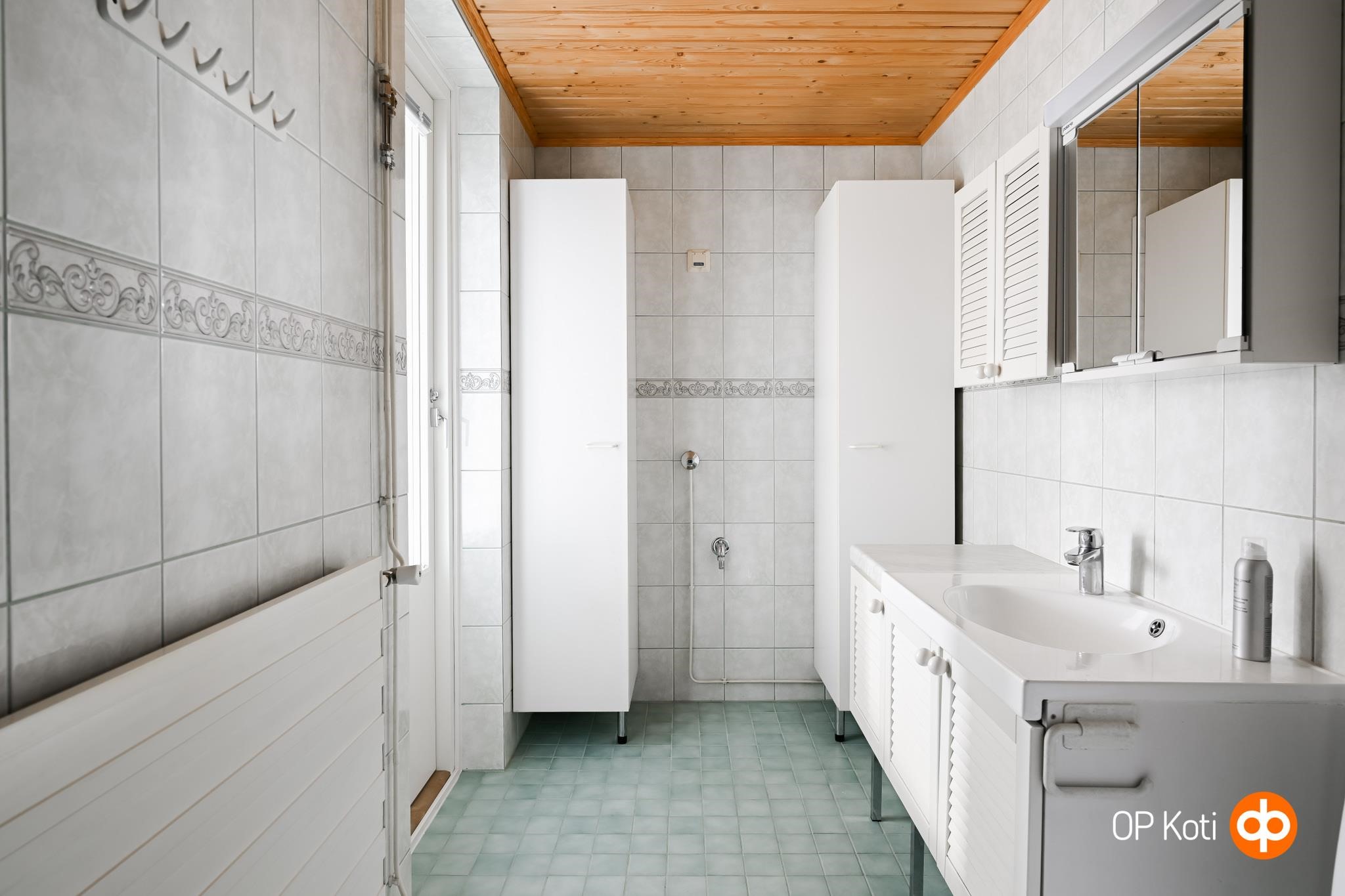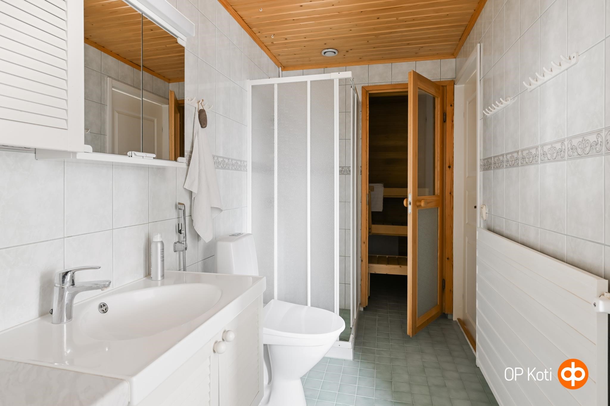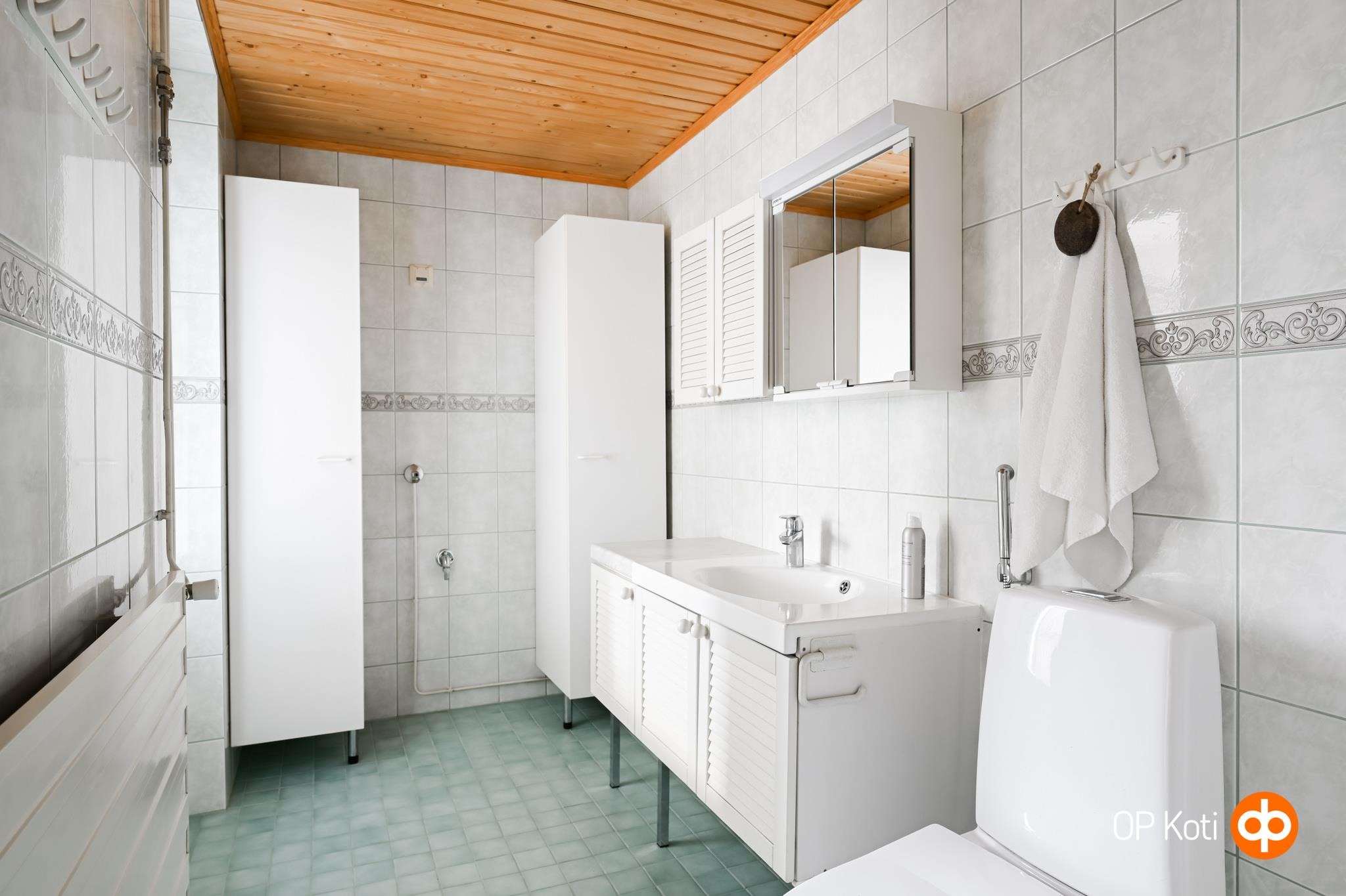 - Sauna, sähkökiuas, kylpyhuone, suihku, suihkukaappi, peilikaappi, allaskaappi, pesukoneliitäntä, kiinteät valaisimet.