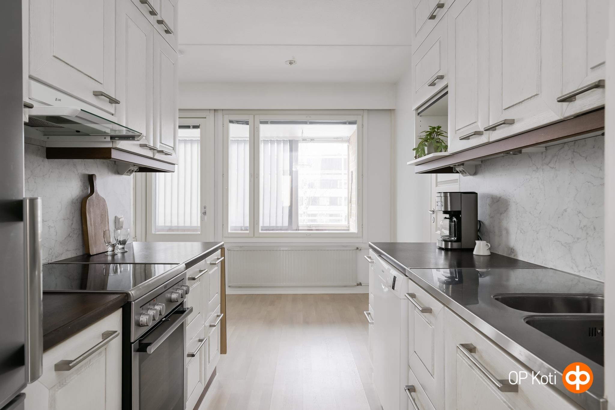 - Jääkaappipakastin, induktioliesi, liesikupu, astianpesukone, kaapistot, kiinteät valaisimet.