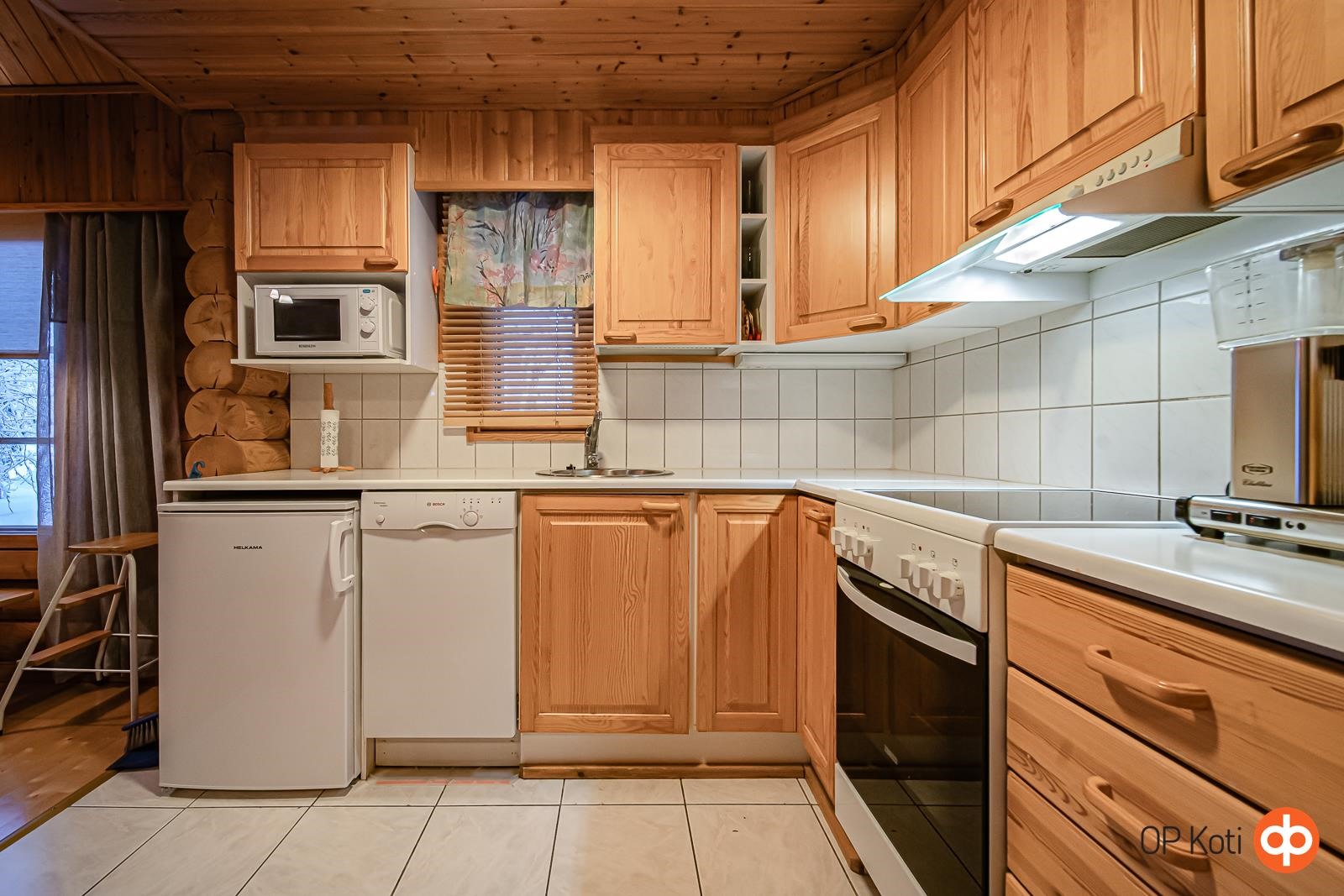 - Jääkaappi Pakastelokerolla, keraaminen liesi, liesituuletin koneellinen poisto, mikroaaltouuni, astianpesukone, kaapistot, kiinteät valaisimet.