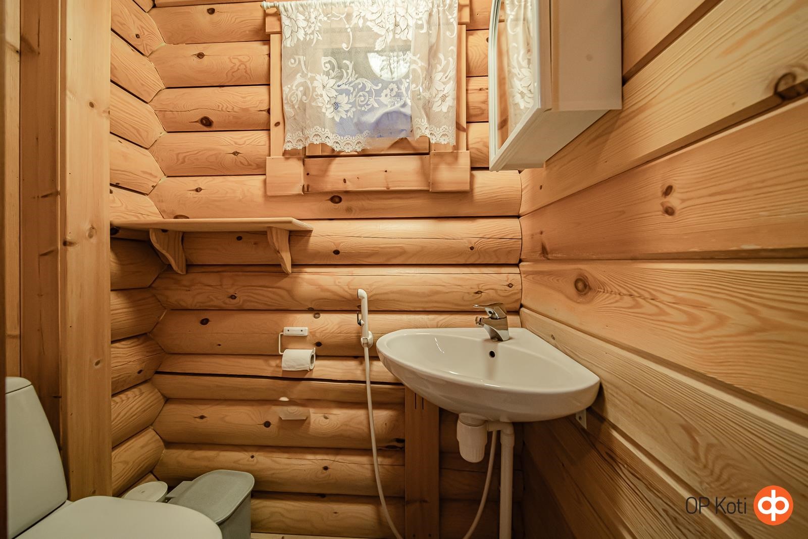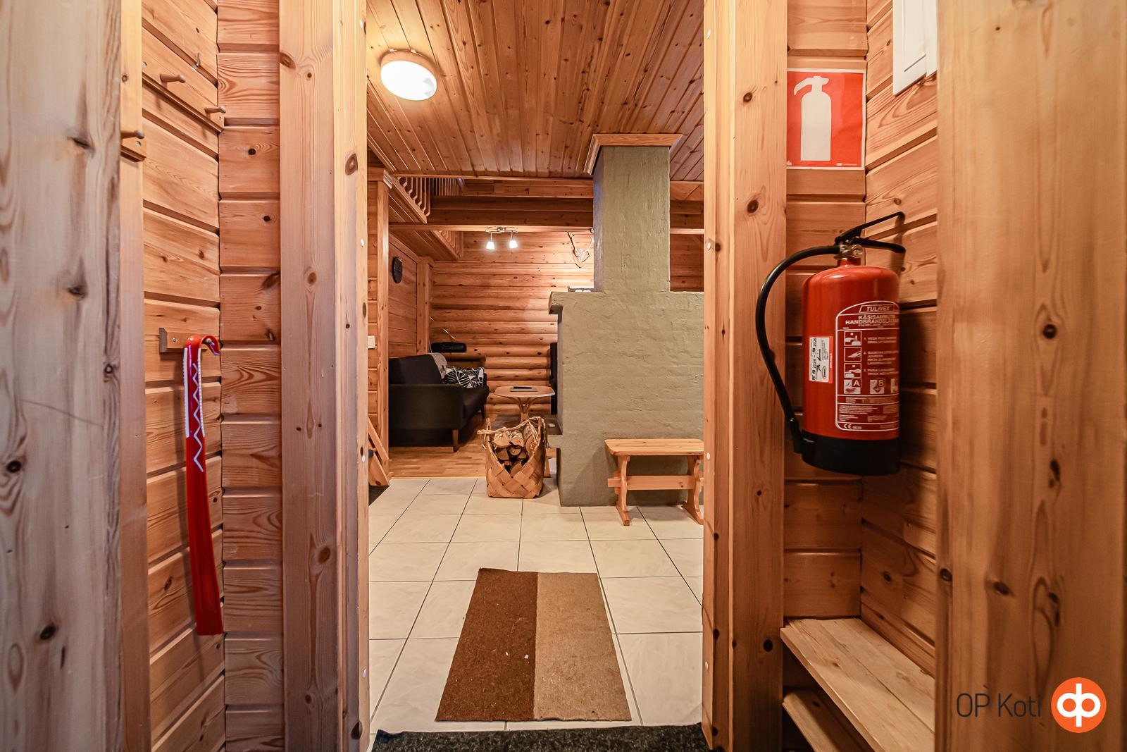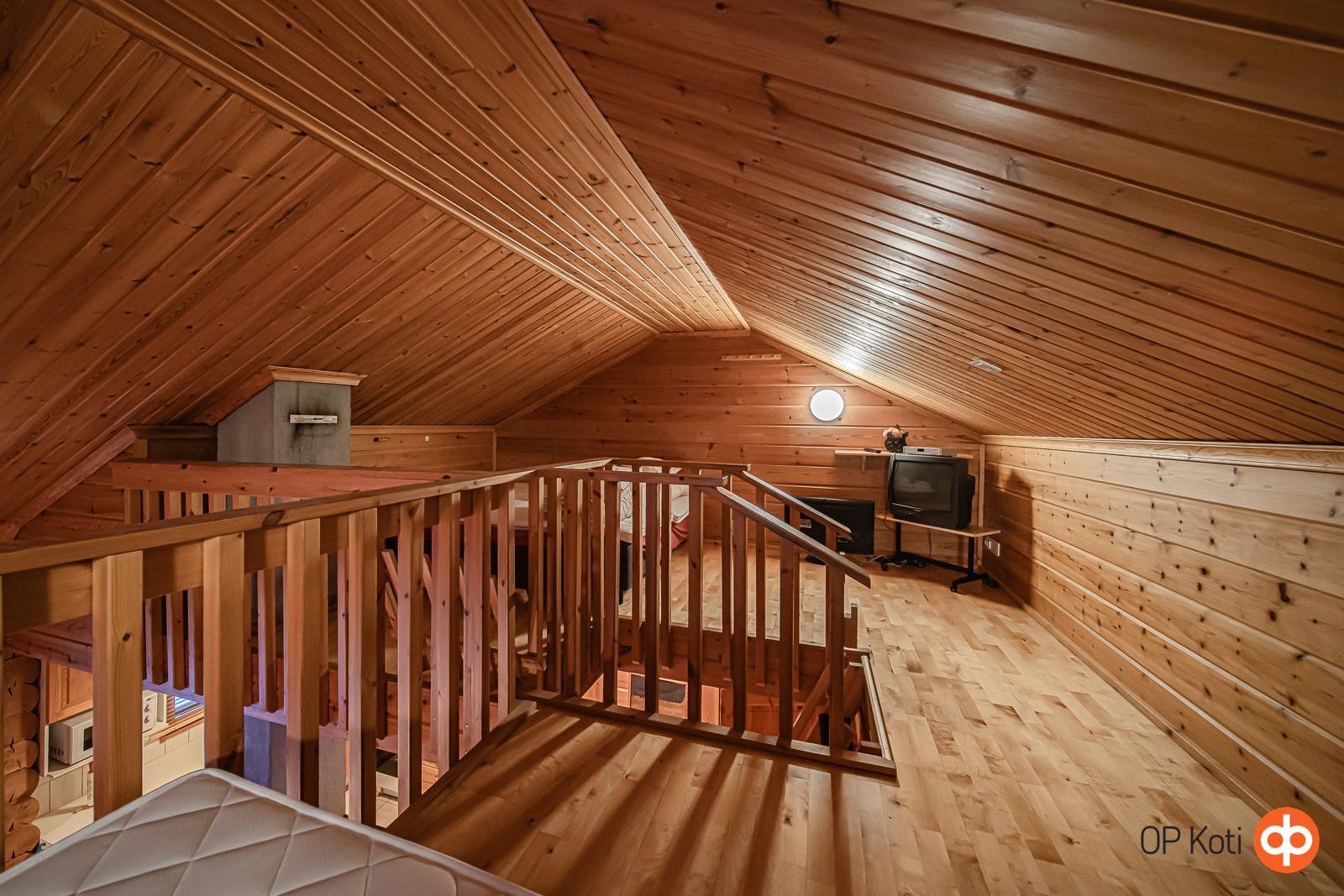 Keittiö: laatta/välitilassa laatta. Olohuone: parketti/hirsi. Makuuhuone 1: parketti/hirsi. Sauna: laatta/hirsi/paneeli. Kylpyhuone: laatta / laatta. Eteinen: laatta/paneeli. Wc: laatta/hirsi. parvi: parketti/hirsi.