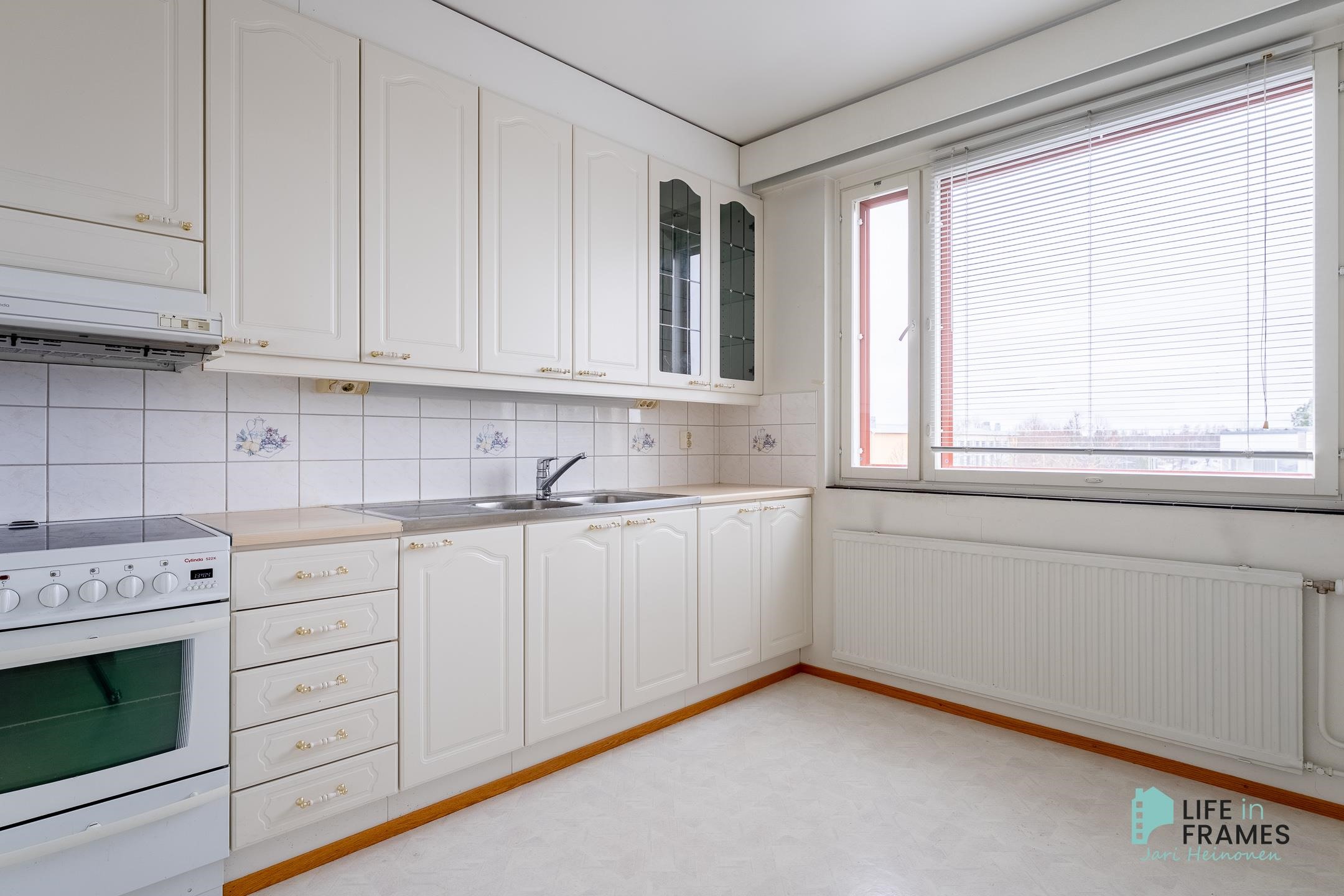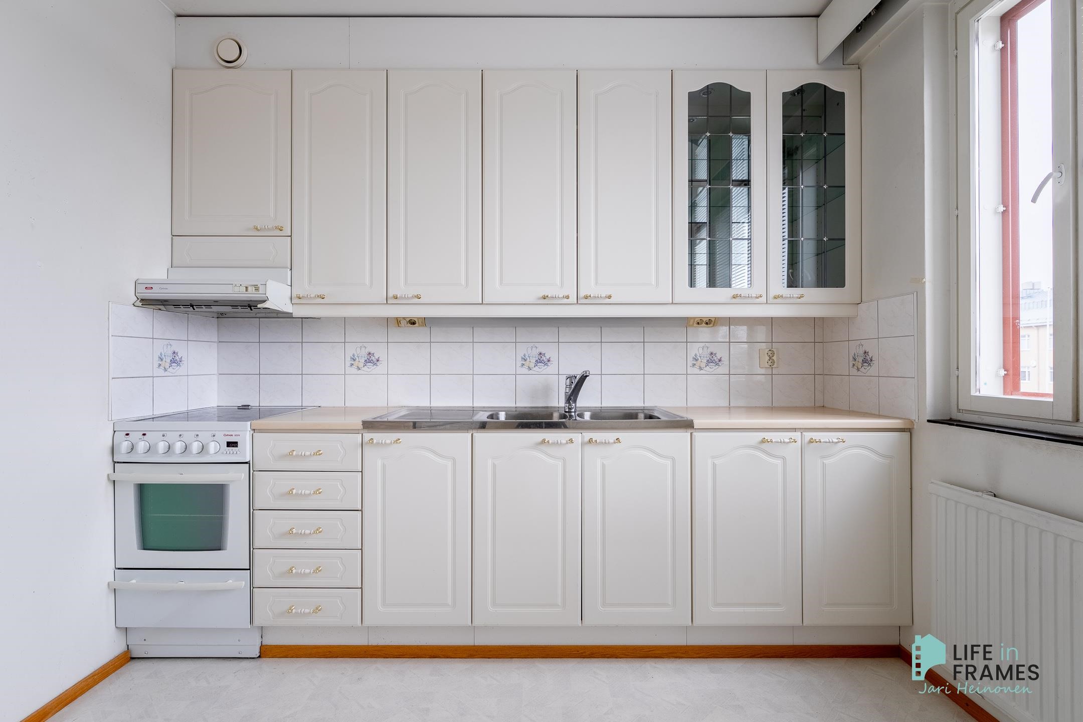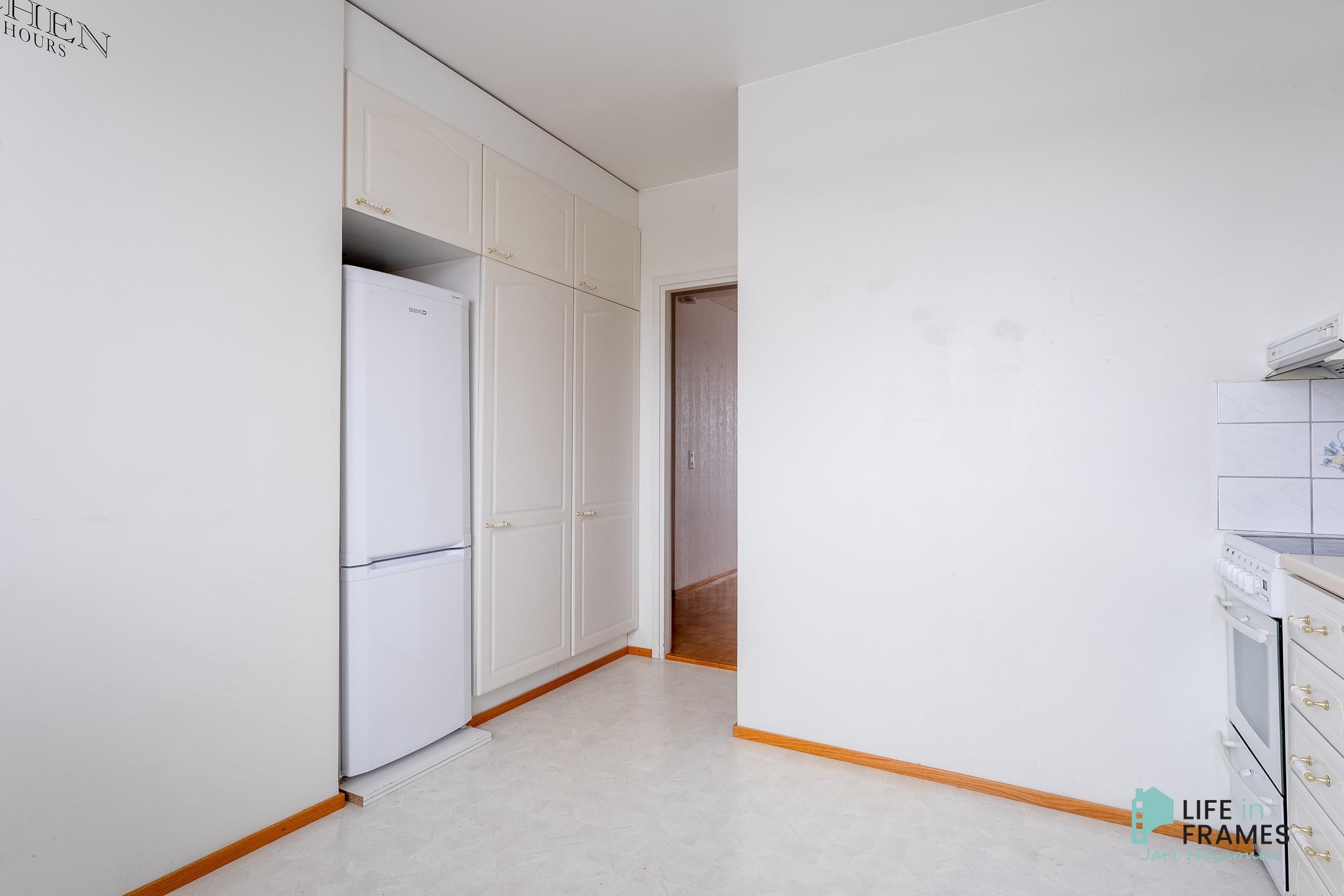 - Jääkaappipakastin, lattialiesi, sähköliesi, keraaminen liesi, liesituuletin, kaapistot, kiinteät valaisimet.