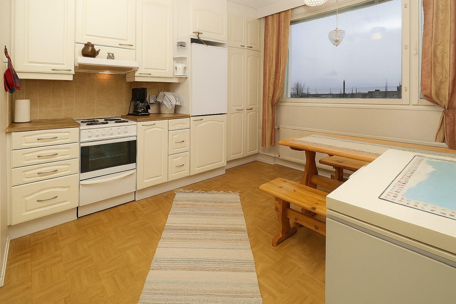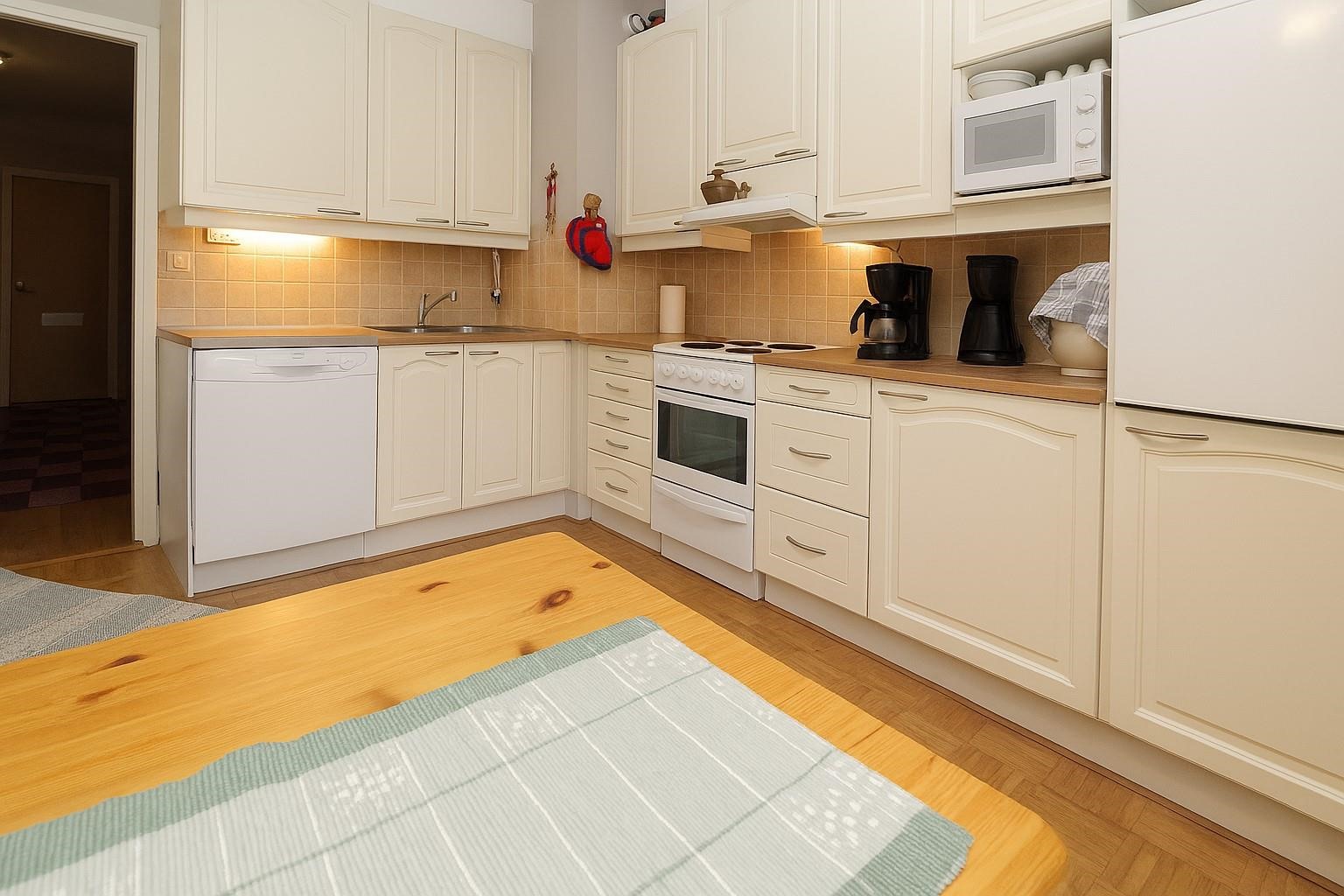 - Jääkaappi, sähköliesi, liesituuletin, astianpesukone, kaapistot 2011 uusittu, NELKO, kiinteät valaisimet.