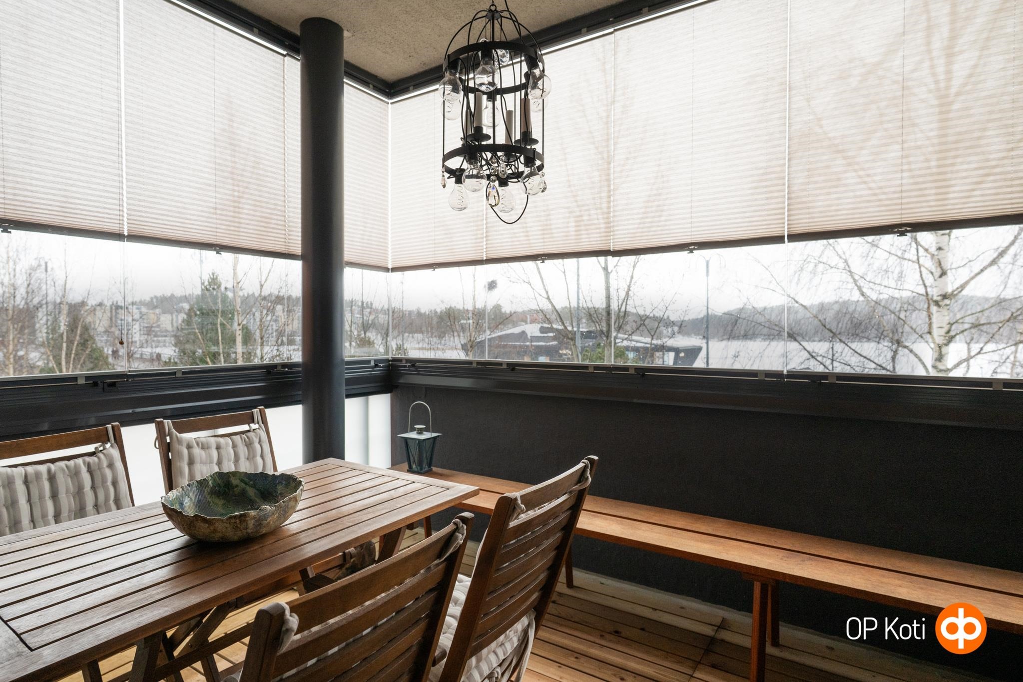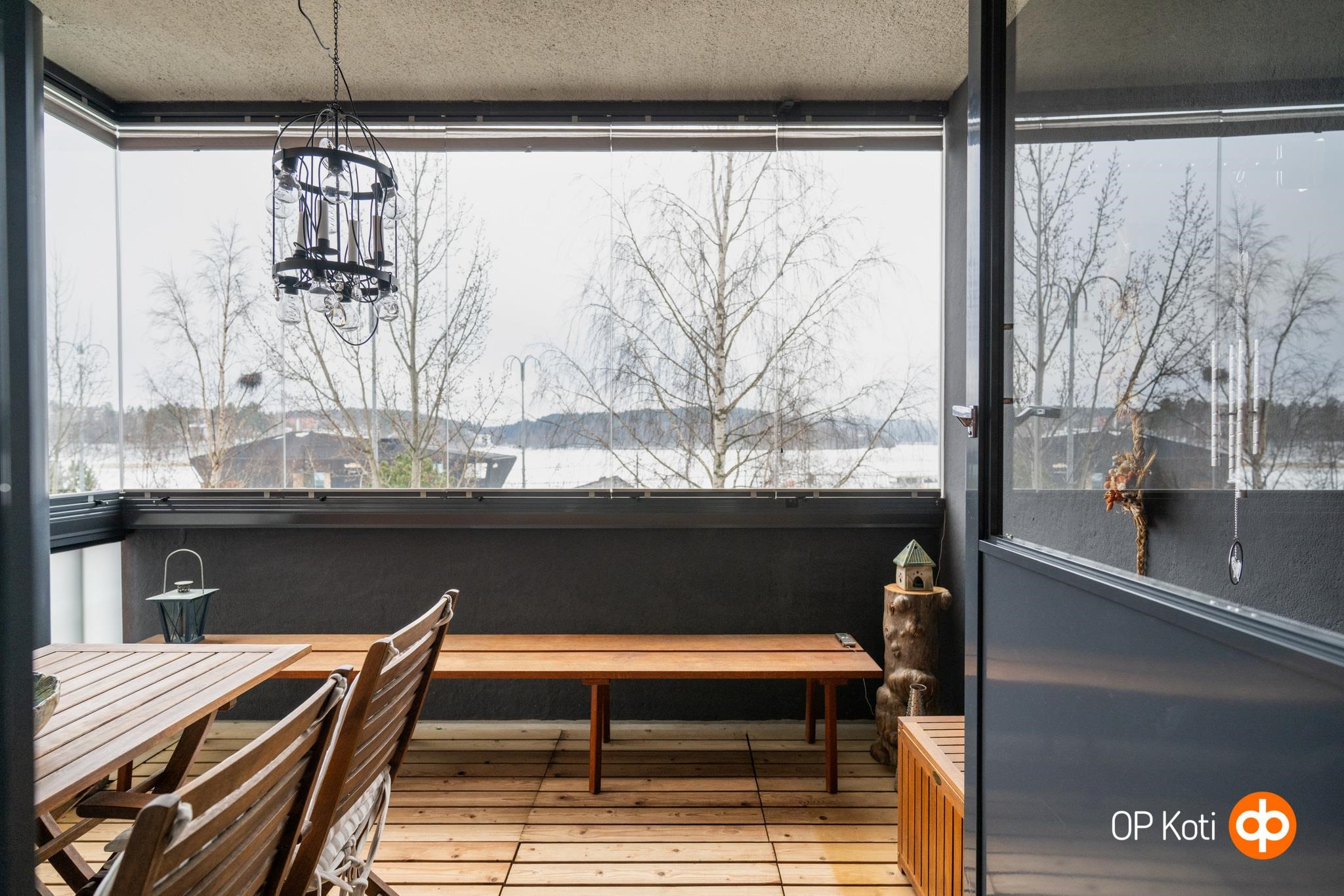 Tämä neljännen kerroksen valoisa kolmio sijaitsee erinomaisella paikalla Lutakossa. Asunnon lasitetulta parvekkeelta avautuu upea järvinäköala sataman yli. Maisema, josta voit nauttia ympäri vuoden. Parveke toimii viihtyisänä lisähuoneena aikaisesta keväästä pitkälle syksyyn. Lasituksen lisäksi siellä on kestopuulattia ja parvekekaihtimet.