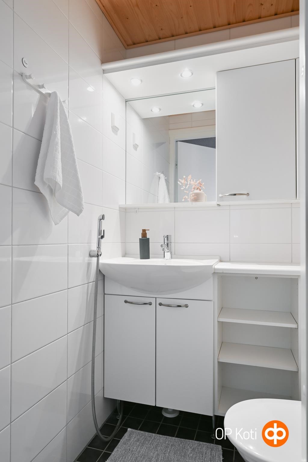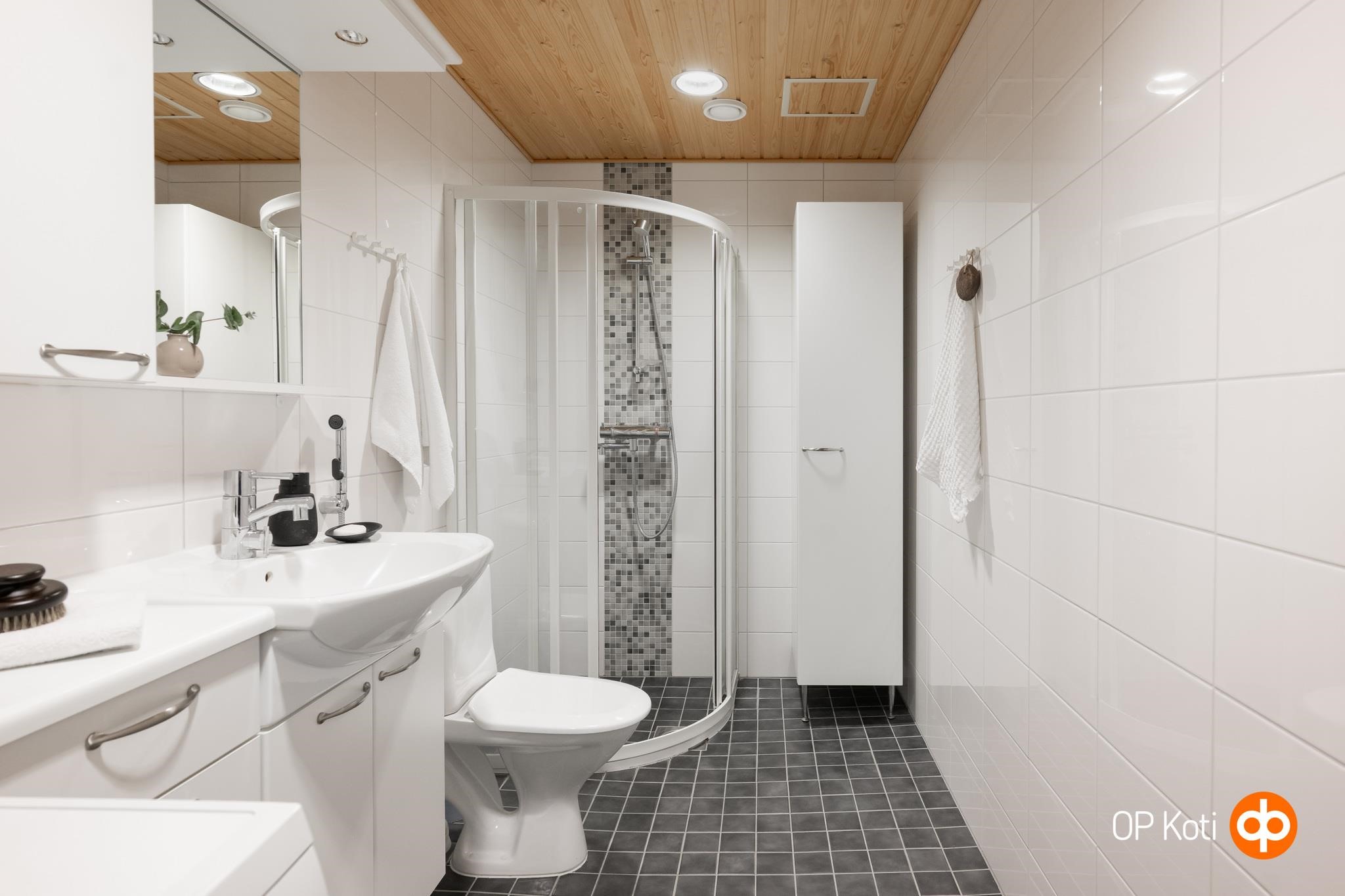 - Kylpyhuone, erillinen wc, peilit, kaapit, allaskaappi, pesukoneliitäntä, lattialämmitys, kiinteät valaisimet. Suihkunurkka, pesukone
