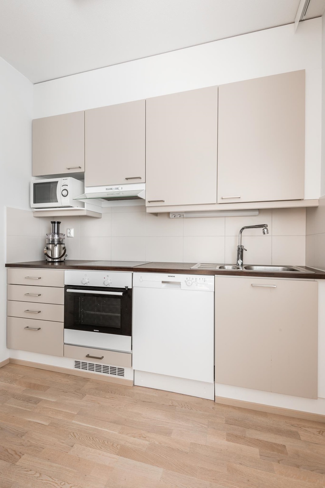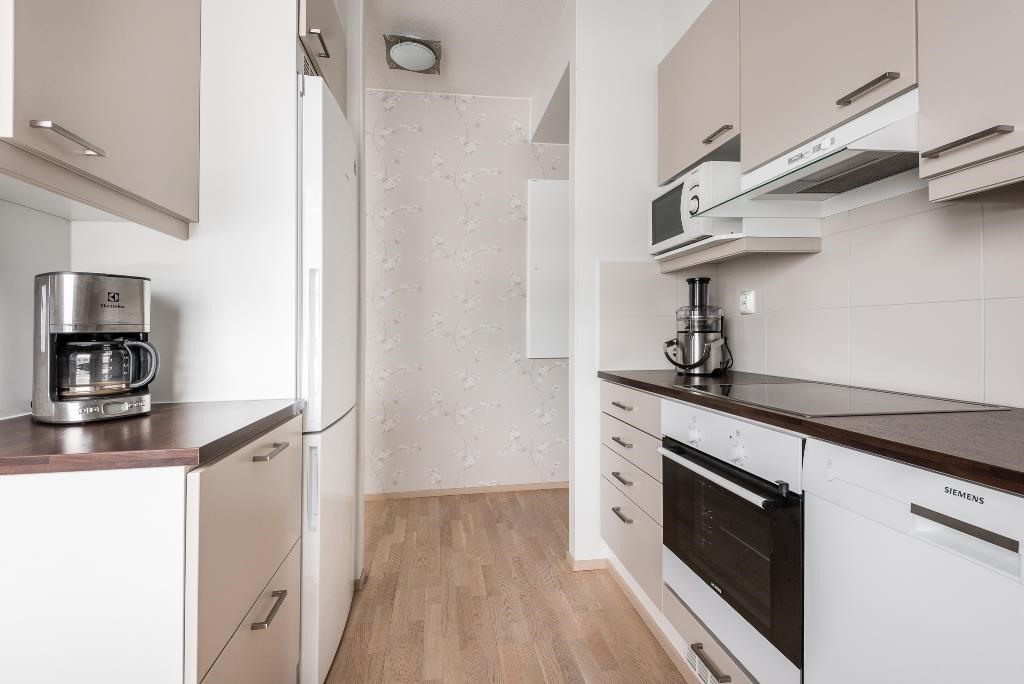 - Jääkaappipakastin, keraaminen liesi, liesituuletin, astianpesukone, kaapistot, kiinteät valaisimet.