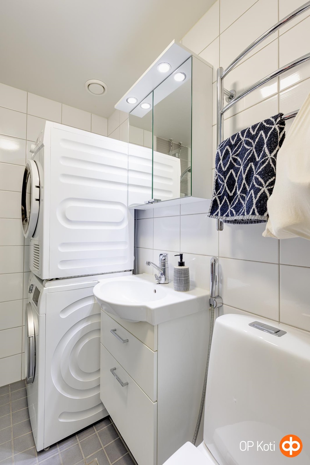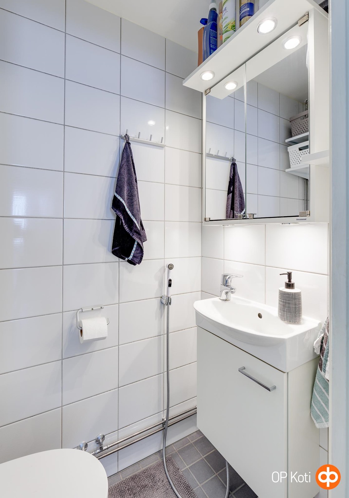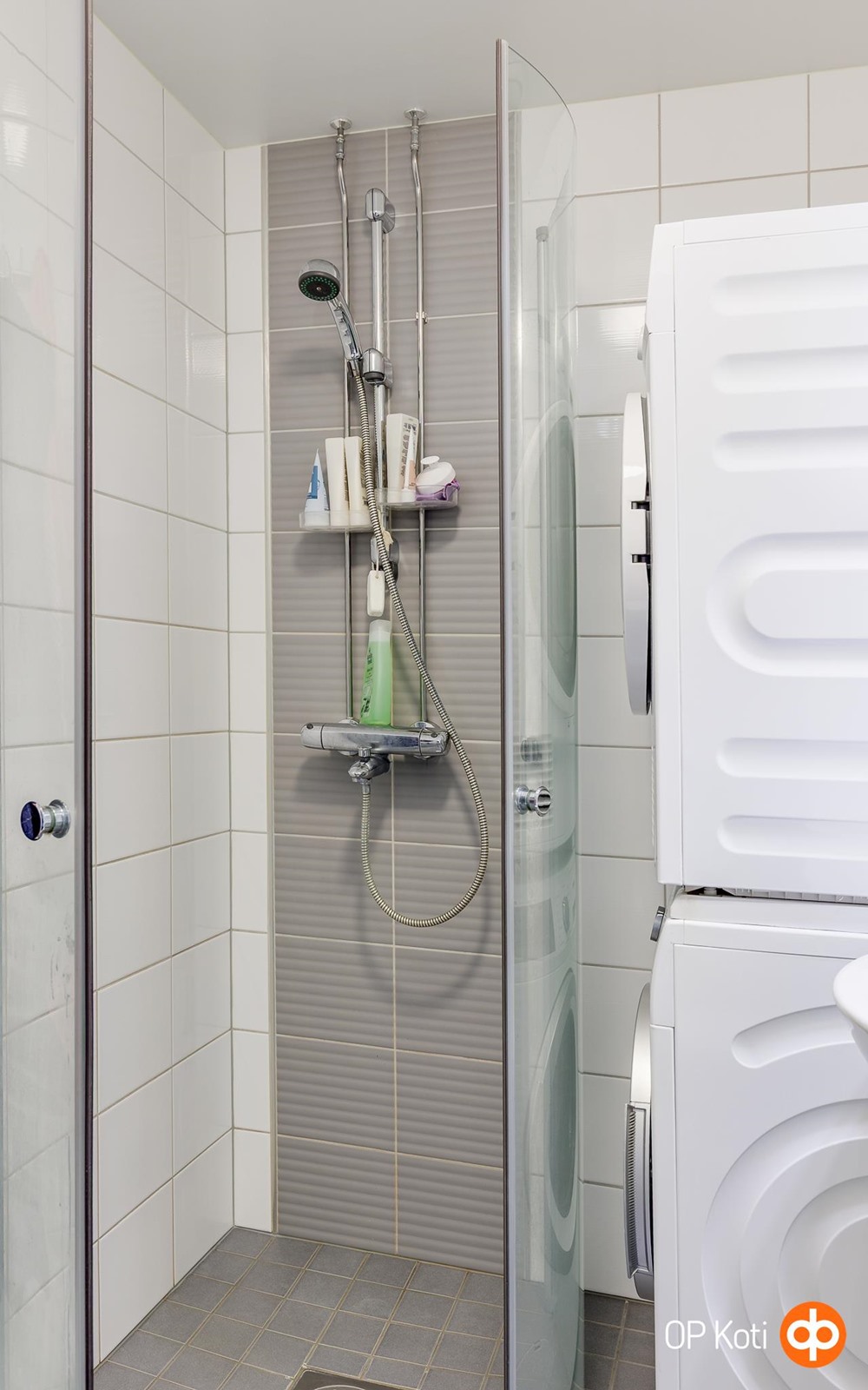 - Kylpyhuone, erillinen wc, suihku, peilikaappi, allaskaappi, pesukoneliitäntä, lattialämmitys, kiinteät valaisimet.