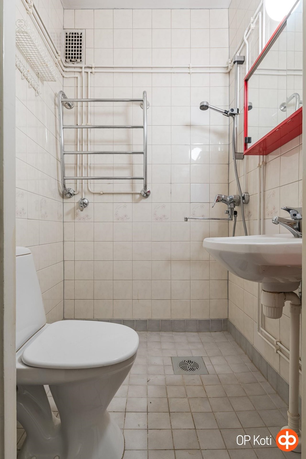 - Kylpyhuone, suihku, peilikaappi, pesukoneliitäntä. pyyhekuivain (vesikiertoinen, vanha)