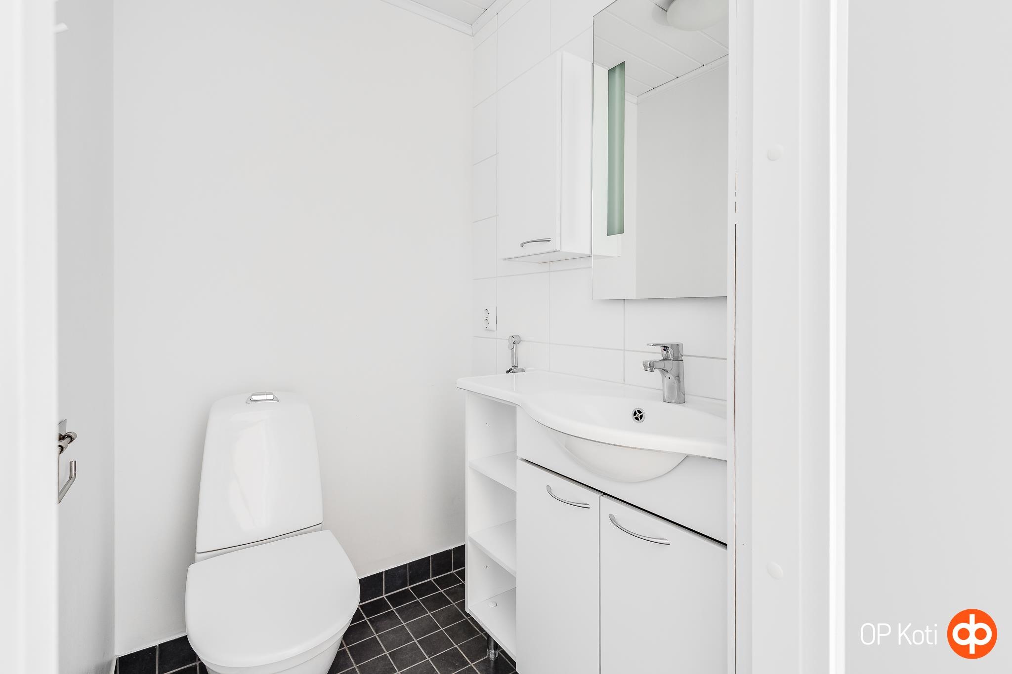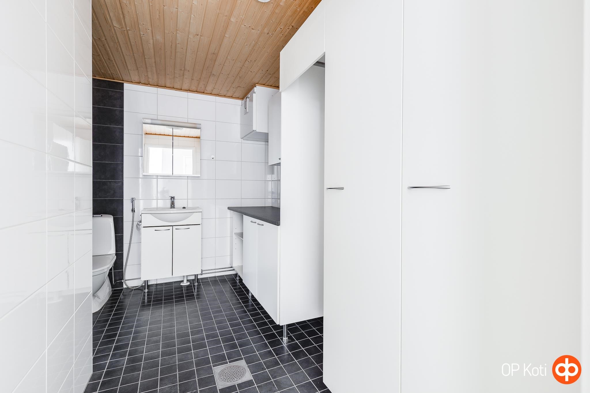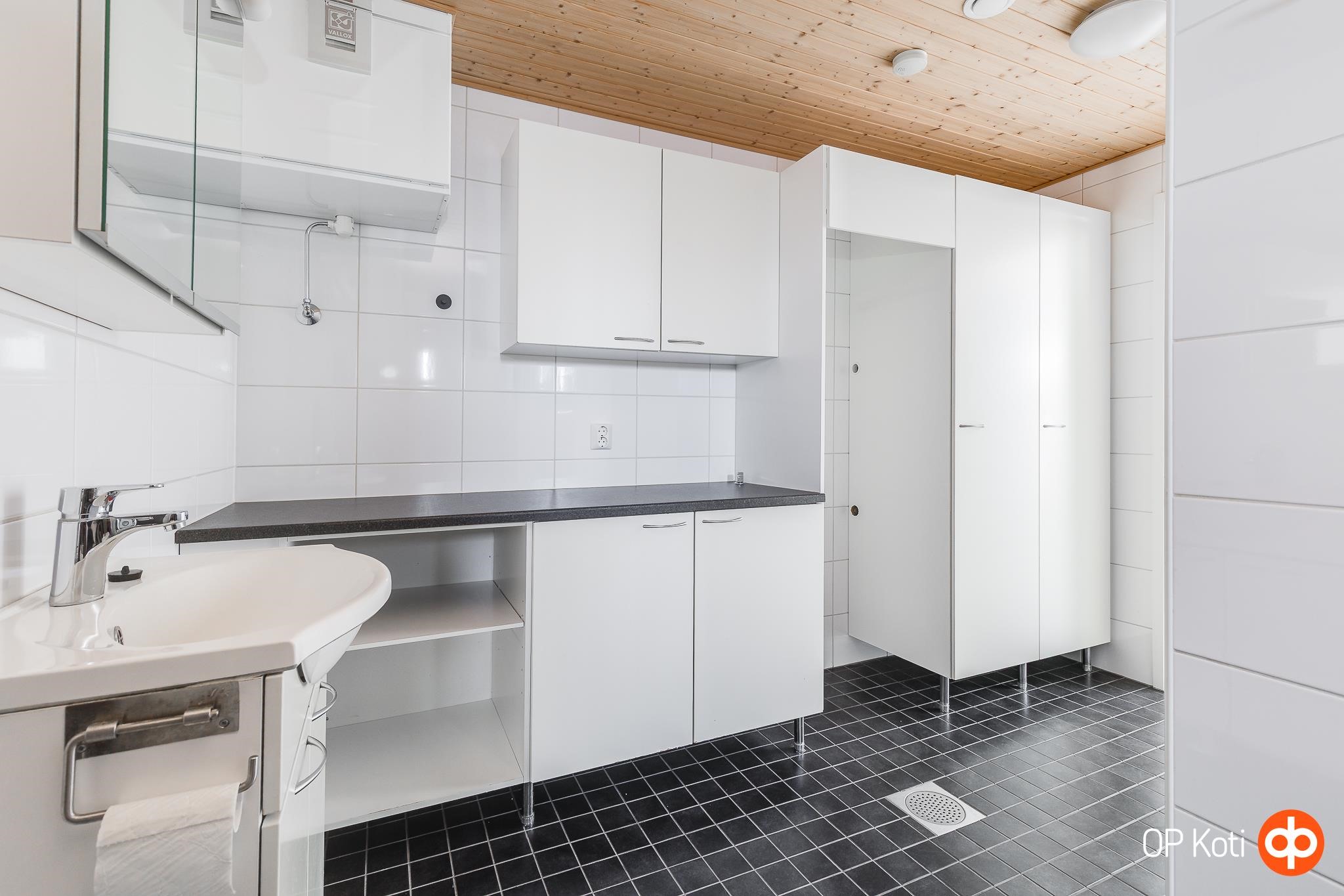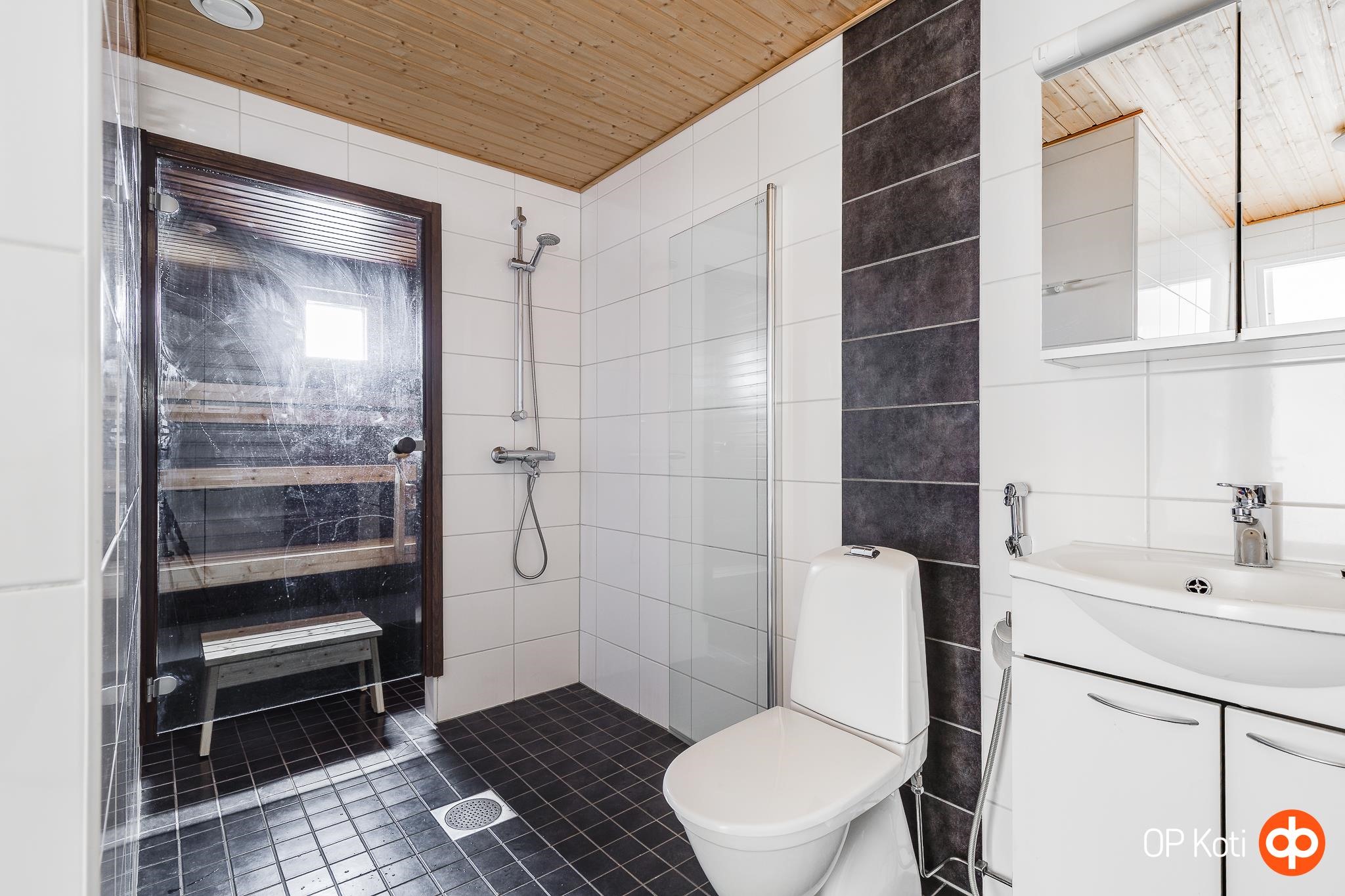 - Sauna, sähkökiuas, kylpyhuone, erillinen wc, suihku, suihkuseinä Uusittu 2025, peilikaappi, kaapit, allaskaappi, pesukoneliitäntä, lattialämmitys, kiinteät valaisimet.