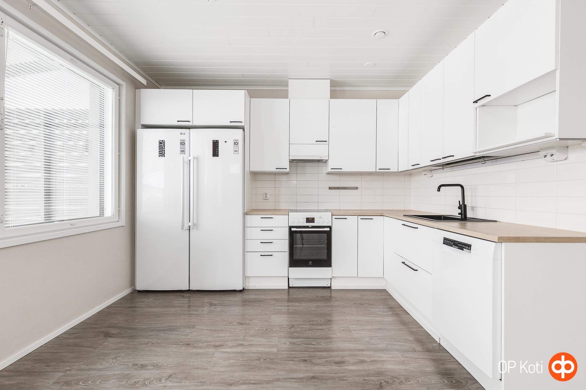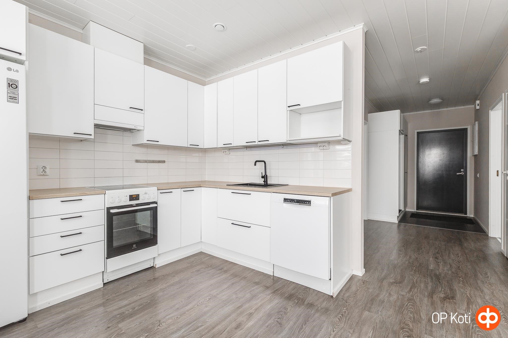 - Jääkaappi, pakastekaappi, keraaminen liesi, liesituuletin, astianpesukone, kaapistot. Työtasot, allas, hana uusittu ( tarkka aika ei ole vielä tiedossa) Kylmälaitteet uusittu ja astianpesukone ( tarkka aika ei ole vielä tiedossa)