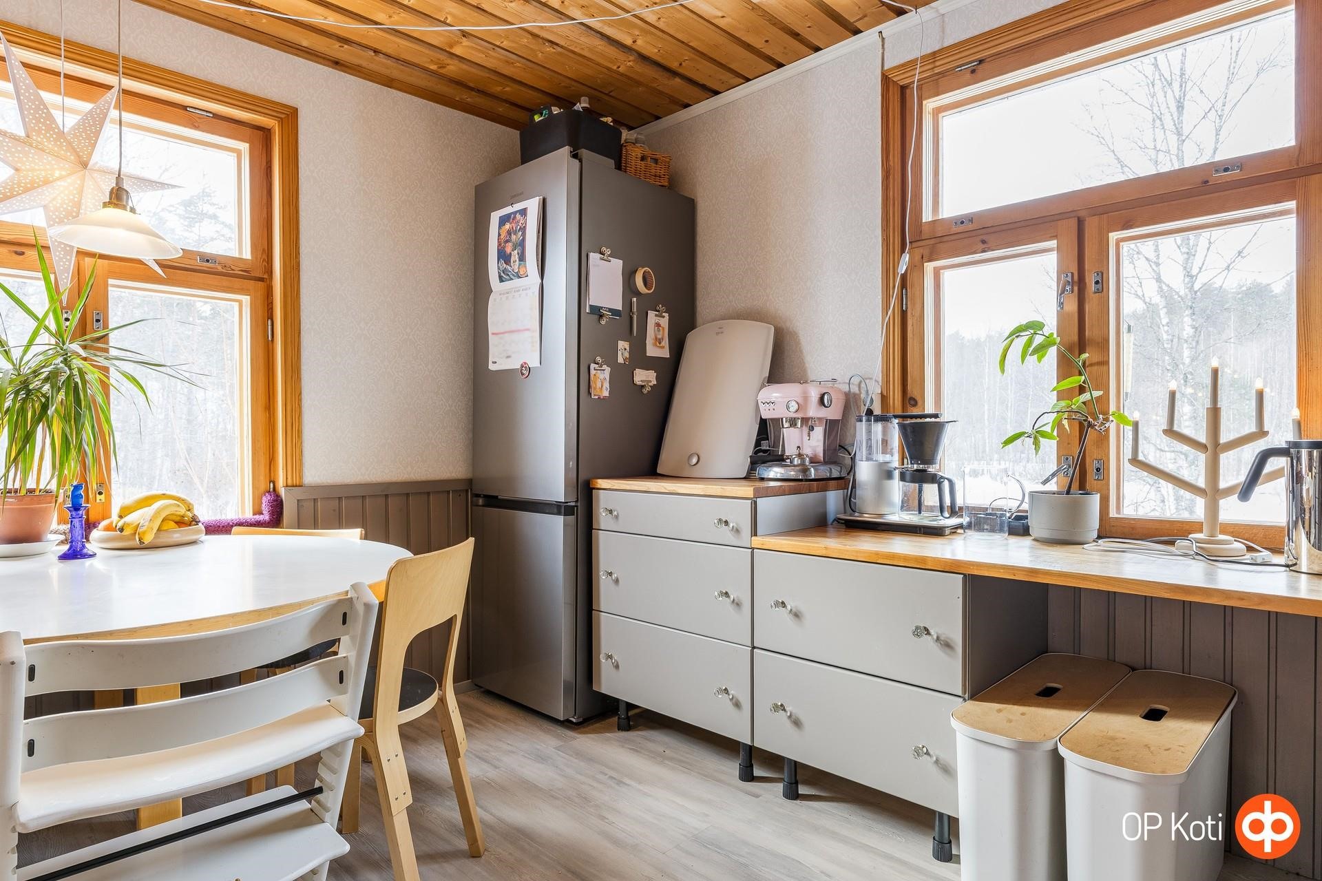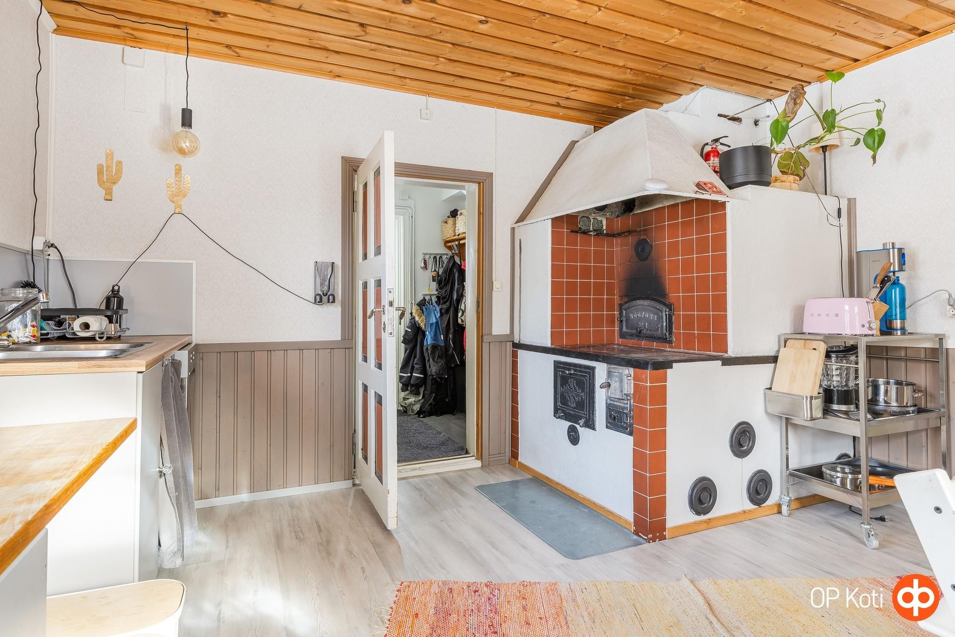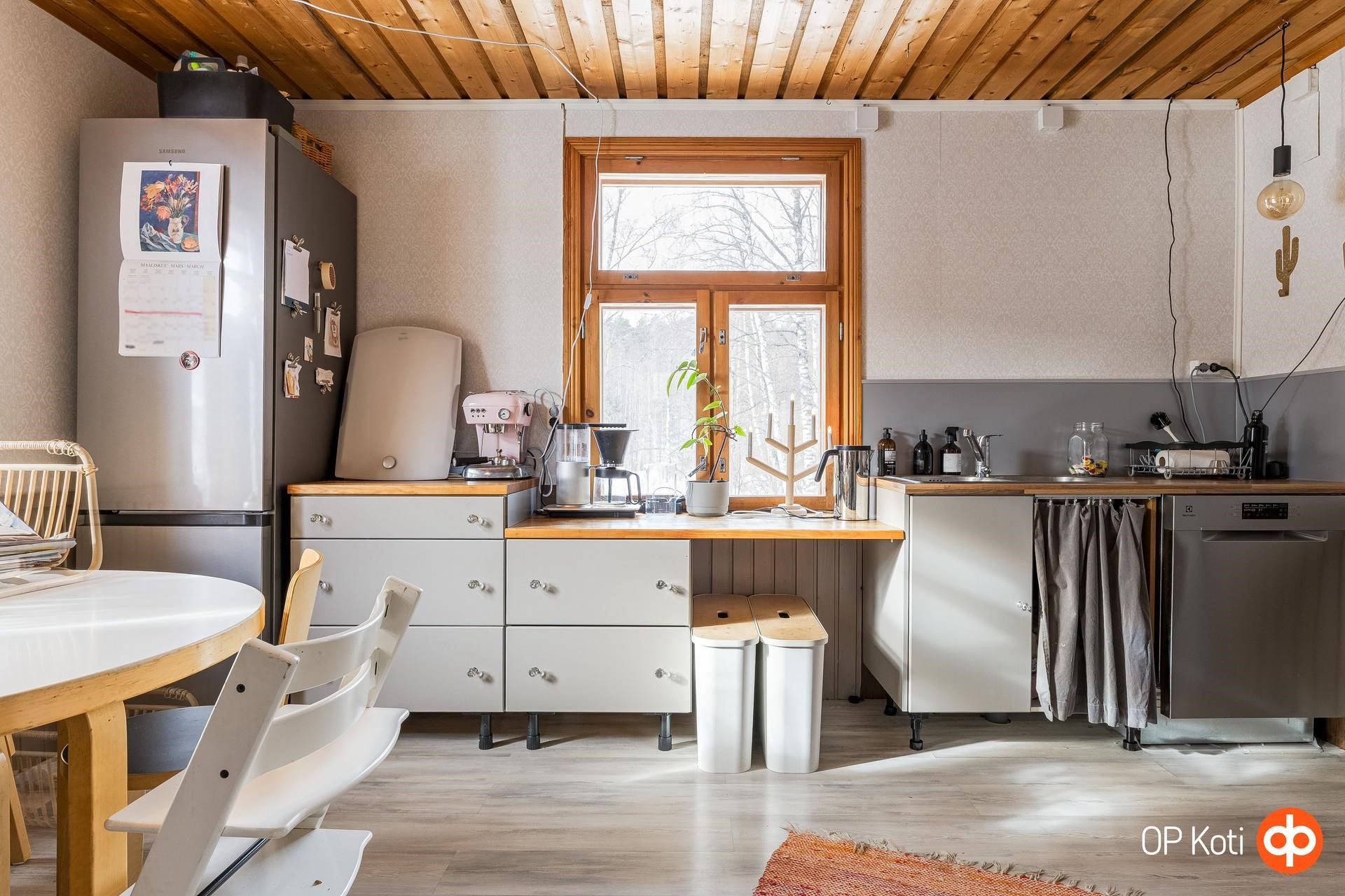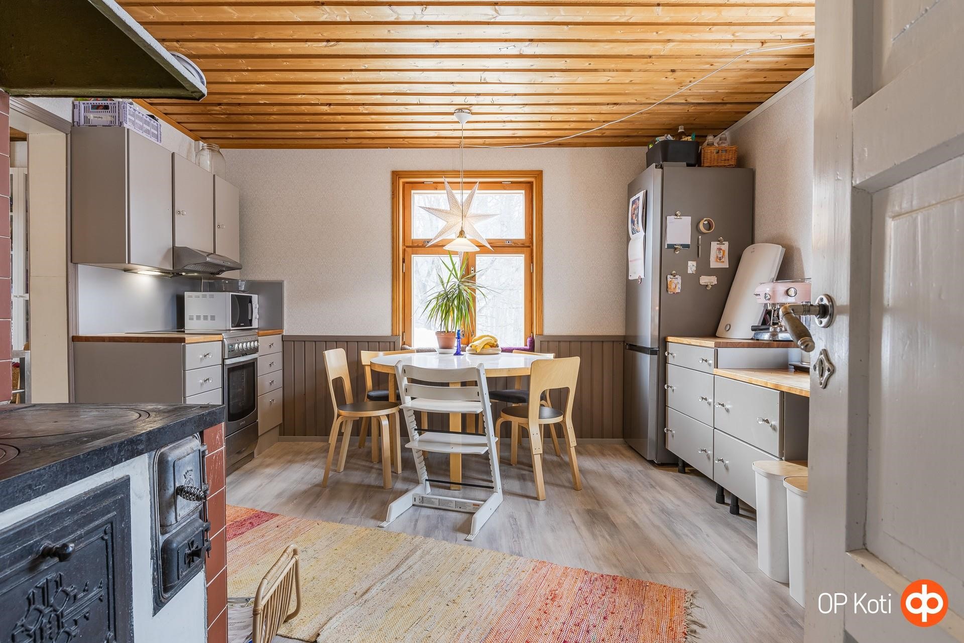 - Jääkaappipakastin, keraaminen liesi, liesituuletin (suodatin), leivinuuni, astianpesukone, kaapistot, pöytätasojen materiaali (massiivipuutasot). Keittiö remontoitu 2020.