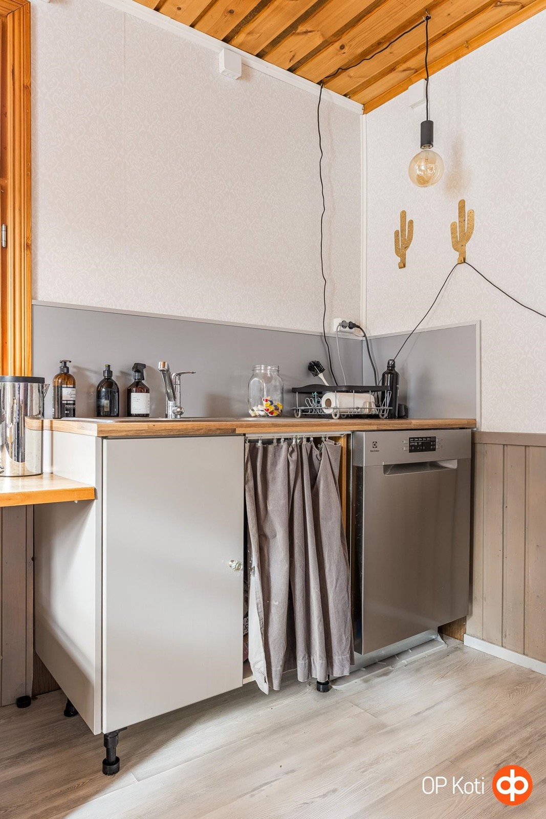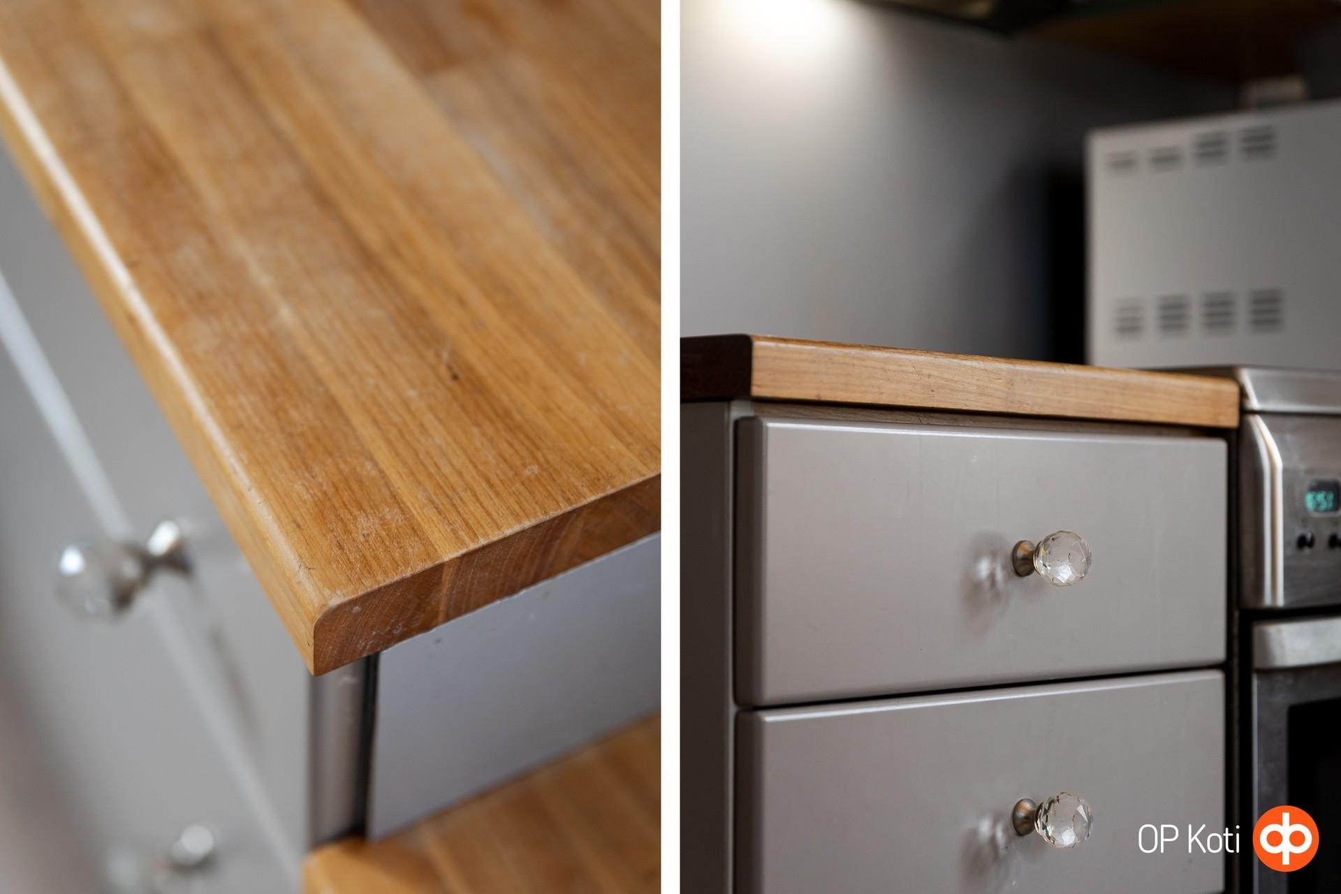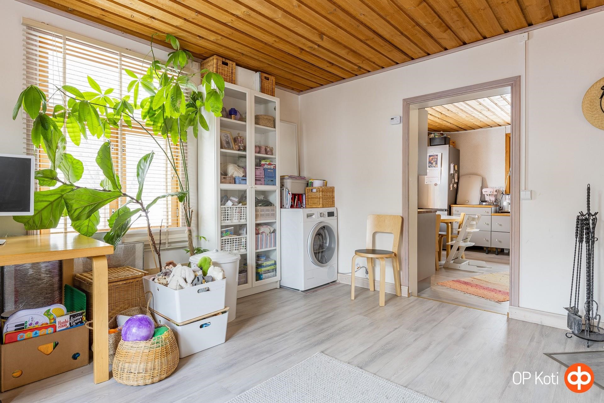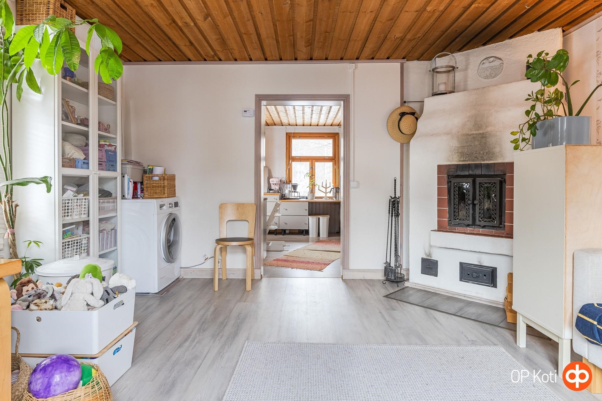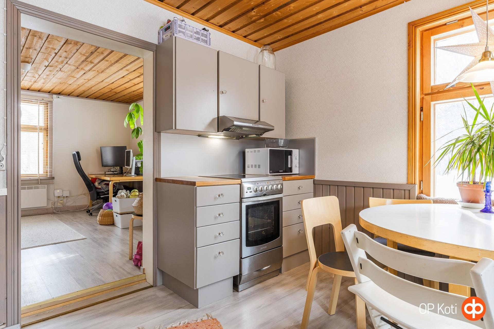 - Jääkaappipakastin, keraaminen liesi, liesituuletin (suodatin), leivinuuni, astianpesukone, kaapistot, pöytätasojen materiaali (massiivipuutasot). Keittiö remontoitu 2020.