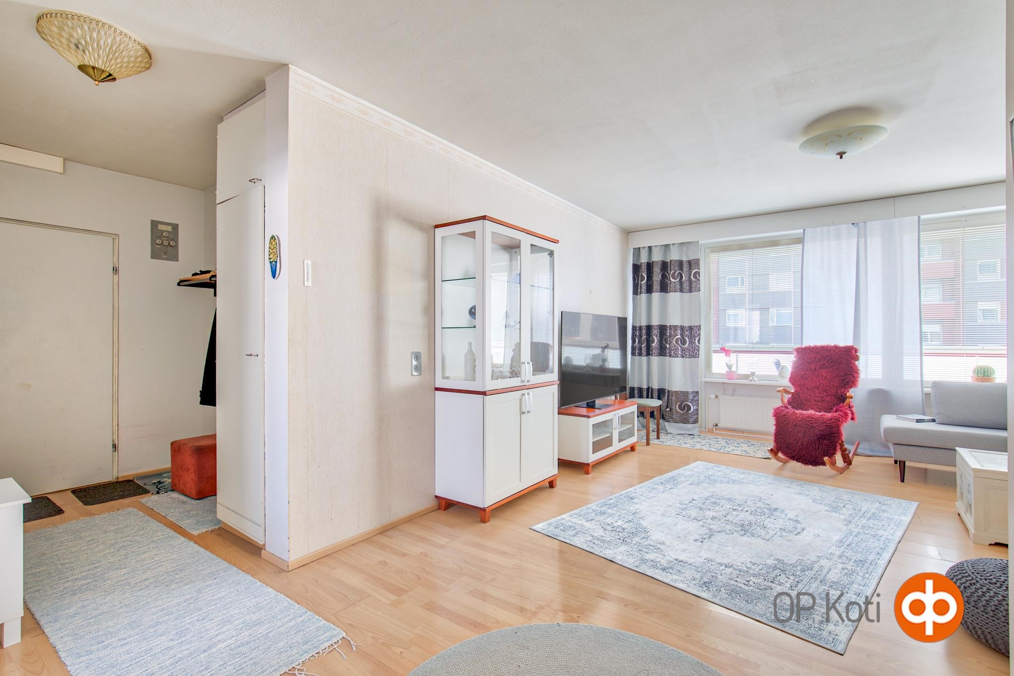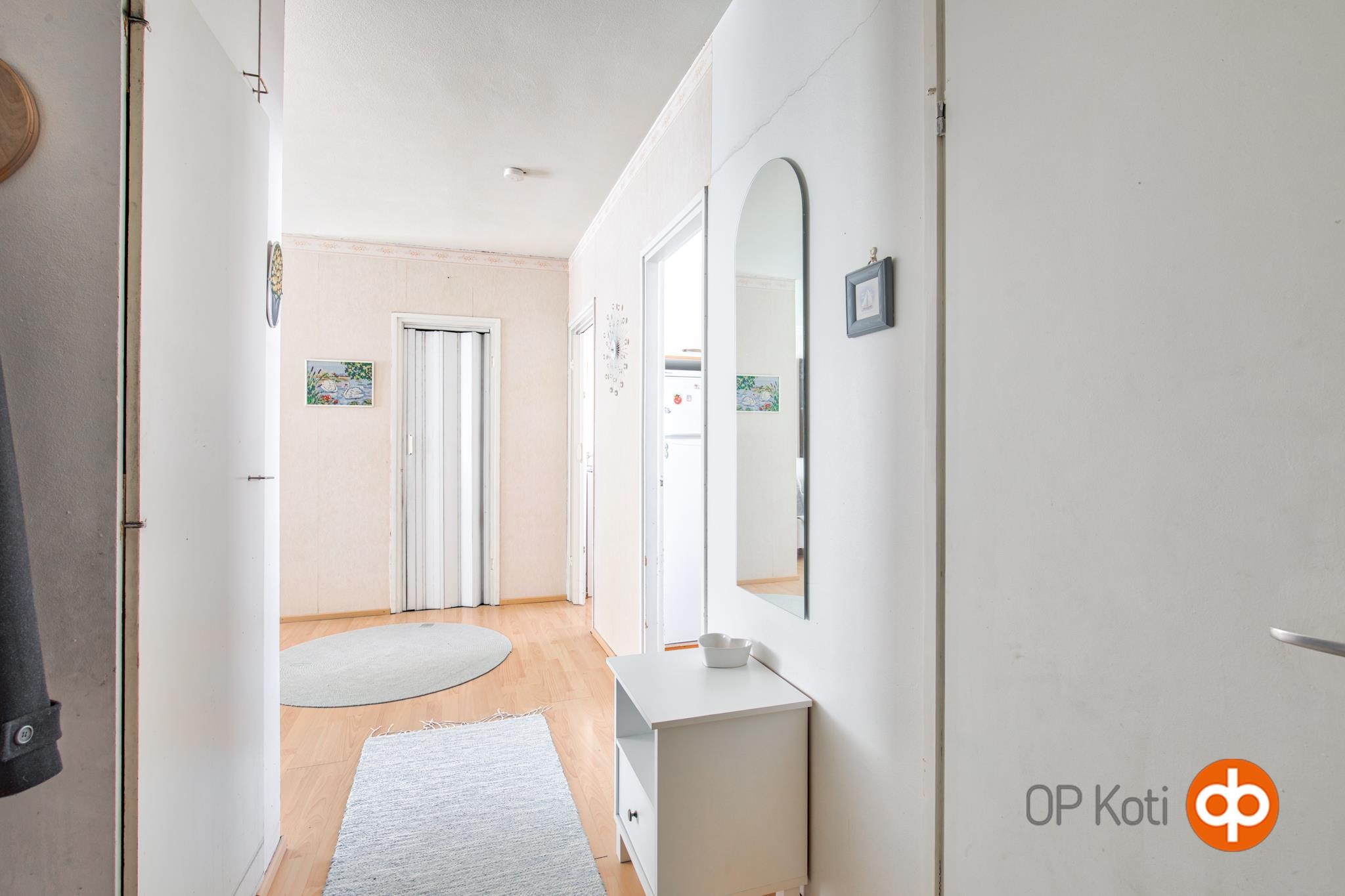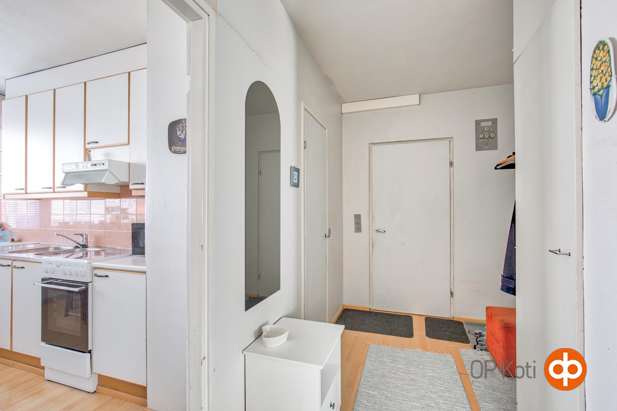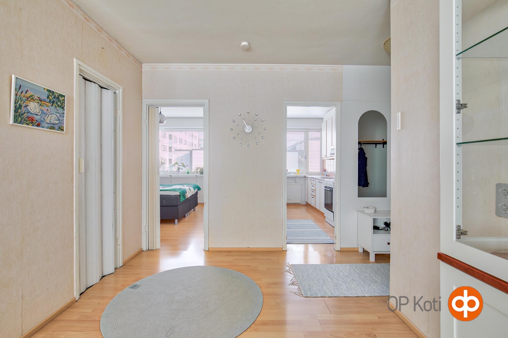 Ovesta sisään astuessa vastaan tulee avara eteisaula, josta on käynnit keittiöön, makuuhuoneeseen, kylpyhuoneeseen sekä tilavaan olohuoneeseen. Lasitettu parveke on erittäin siistissä kunnossa ja muuttuukin kelien lämmetessä viihtyisäksi kesäolohuoneeksi. Läpitalon huoneisto mahdollistaa kesähelteillä läpivedon sekä tuo valoisuutta asuntoon. Kylpyhuone on elinkaarensa päässä ja kaipaa remonttia, tässä onkin mahdollisuus remontoida itselleen mieleinen kylpyhuone ikkunalla varustettuna, joka on kerrostaloissa poikkeuksellista!