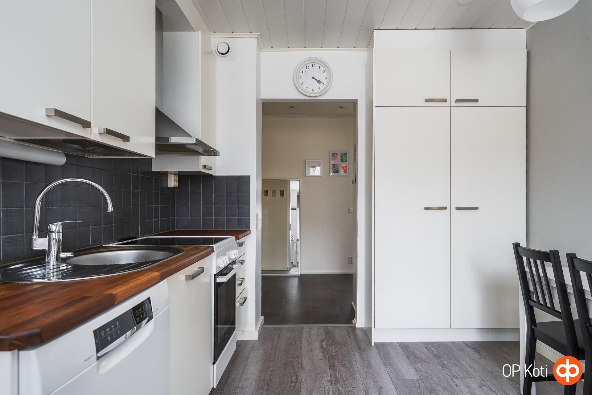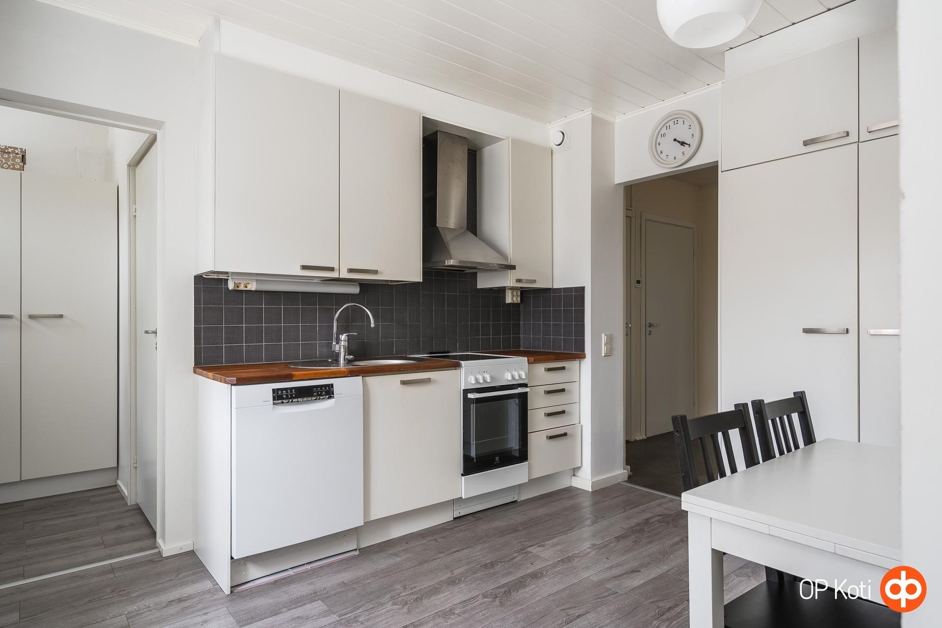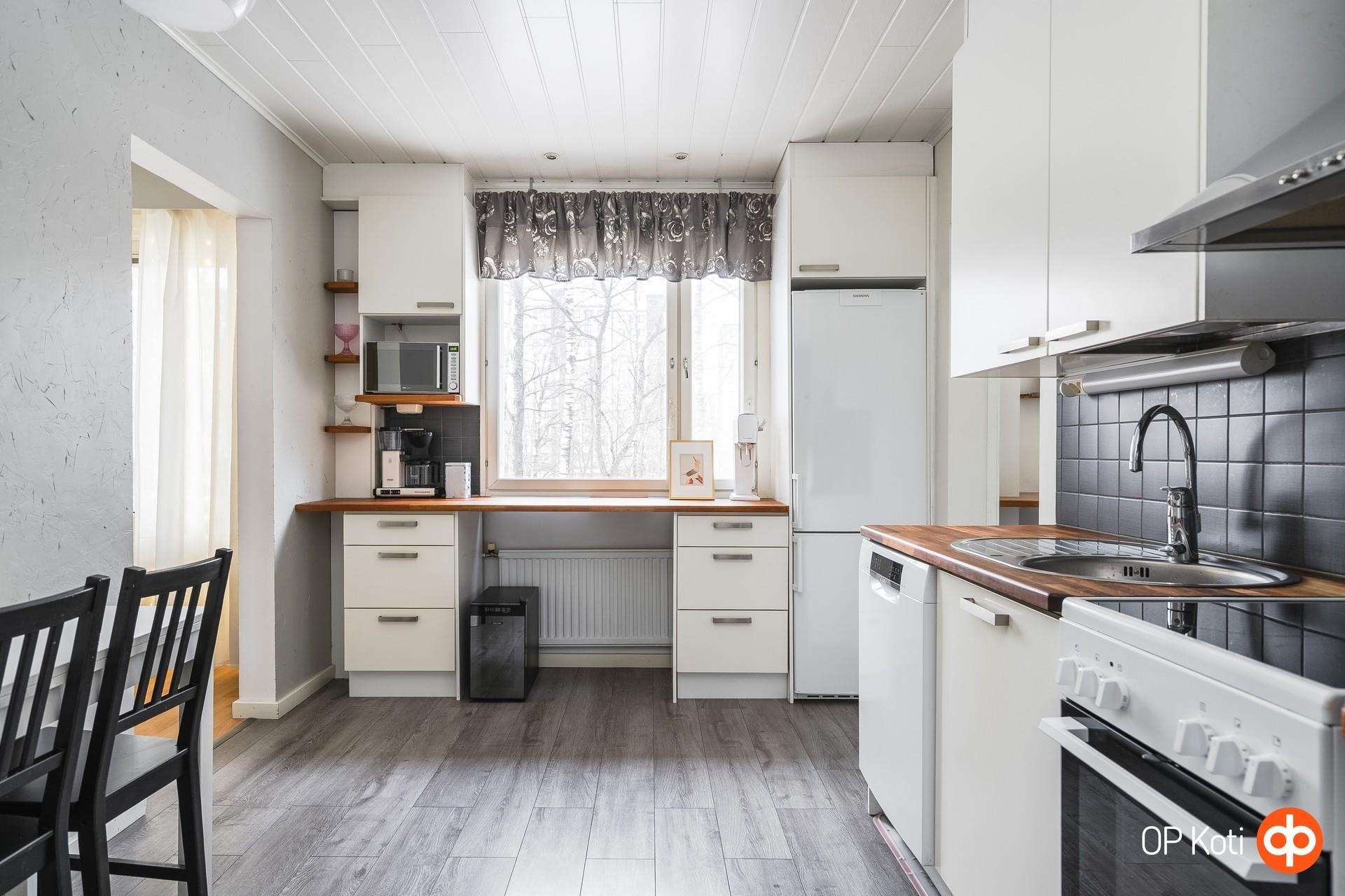 - Vaalean keittiön varusteisiin kuuluu Jääkaappipakastin, keraamisella tasolla varustettu lattialiesi, liesituuletin, astianpesukone, kaapistot sekä kiinteät valaisimet. Työtaso on kaunista puuta, joka viimeistelee keittiön lämpimän ja ajattoman ilmeen.