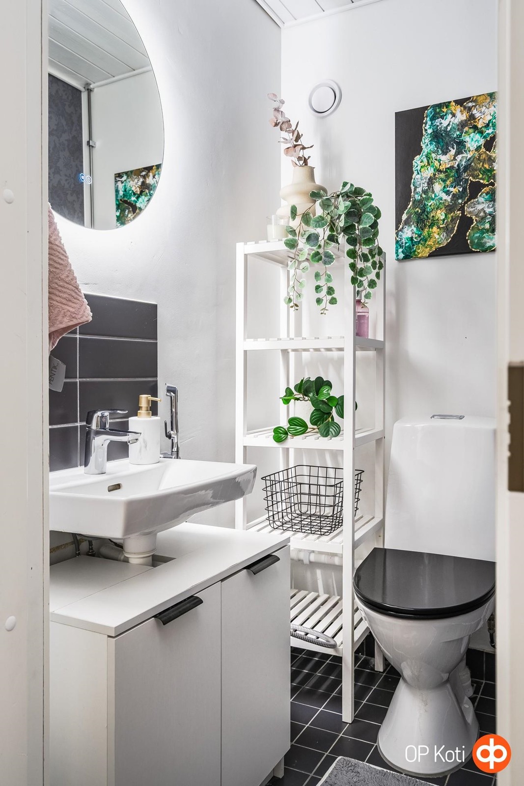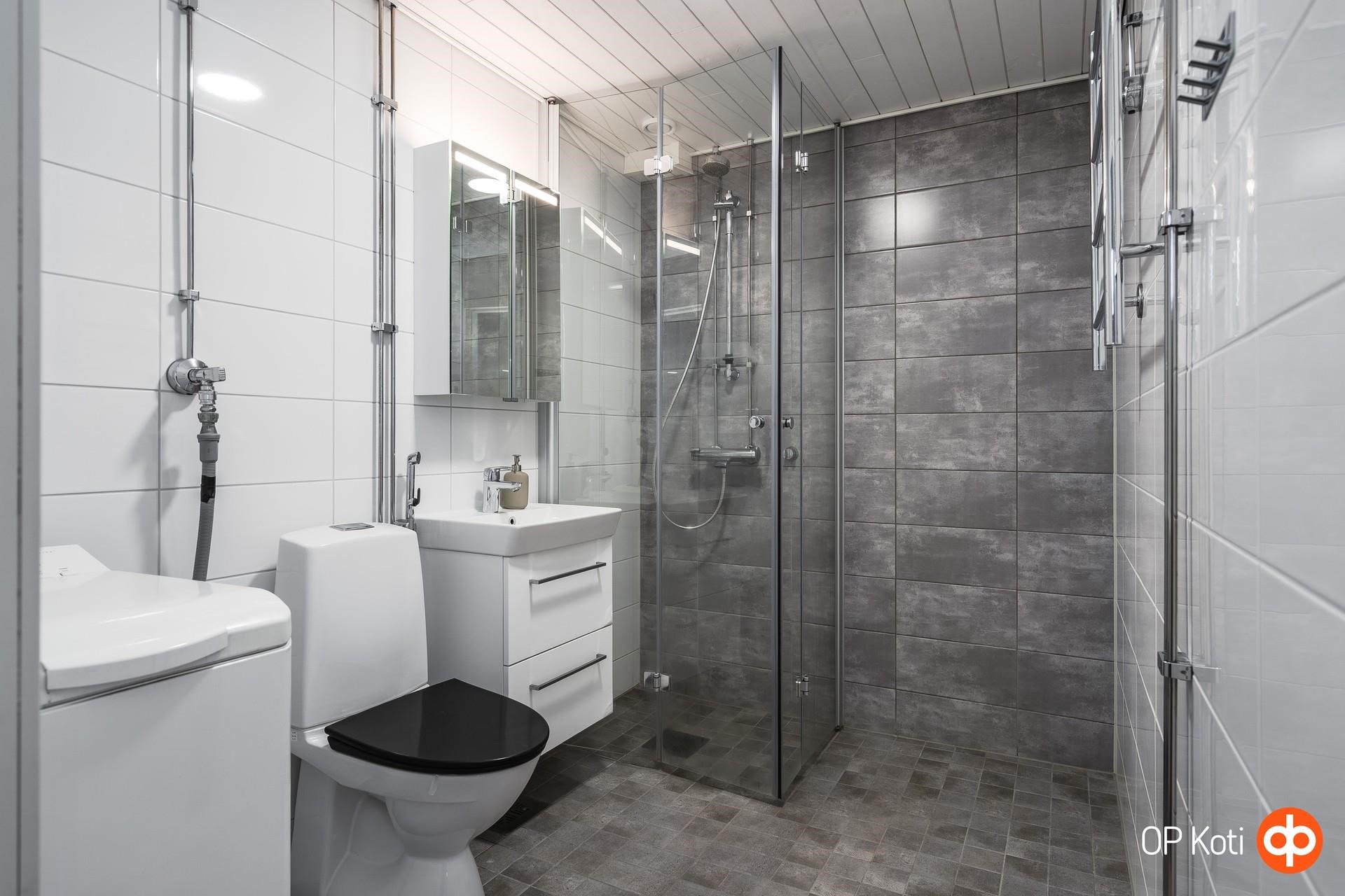 - Kylpyhuoneen varusteisiin kuuluu suihku ja suihkuseinä, peilikaappi, allaskaappi, pesukoneliitäntäm wc-istuin sekä sähköinen lattialämmitys. Tilassa on lisäksi vesikiertoinen pyyhelämmitin ja led-peilivalaisin. Kylpyhuone on remontoitu linjasaneerauksen yhteydessä, joten tekniikka ja pinnat ovat nykyaikaiset ja hyvin hoidettu. Erillisessä wc-tilassa on wc-istuin, LED-peili, jossa valaisin sekä kaapistot. Wc-tilan katto ja kalusteet on uusittu, joten tila on siisti ja moderni.t.