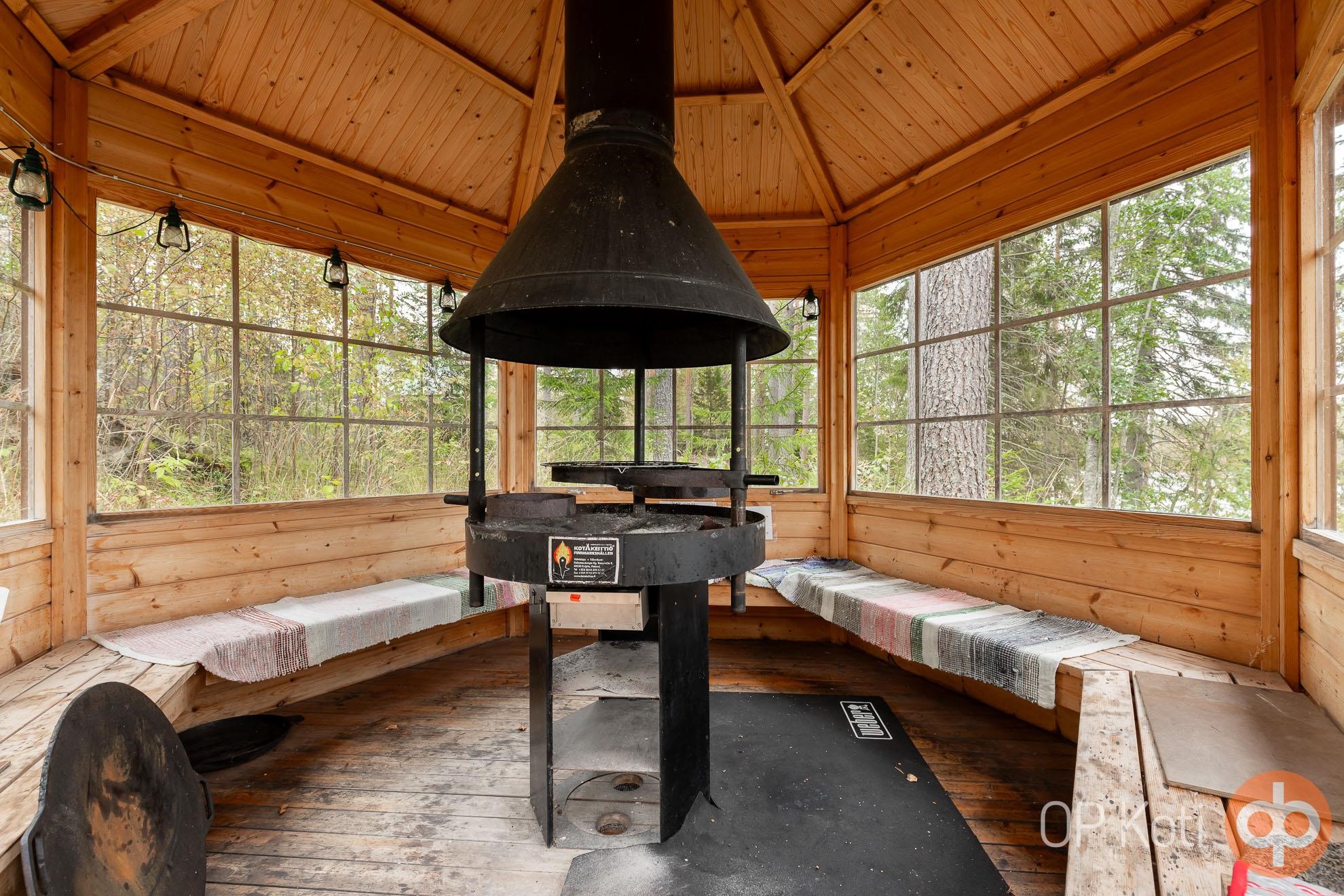 - Jääkaappipakastin, keraaminen liesi, liesituuletin, leivinuuni, mikroaaltouuni, astianpesukone, kaapistot, viinikaappi, kiinteät valaisimet, astiat, takka.
