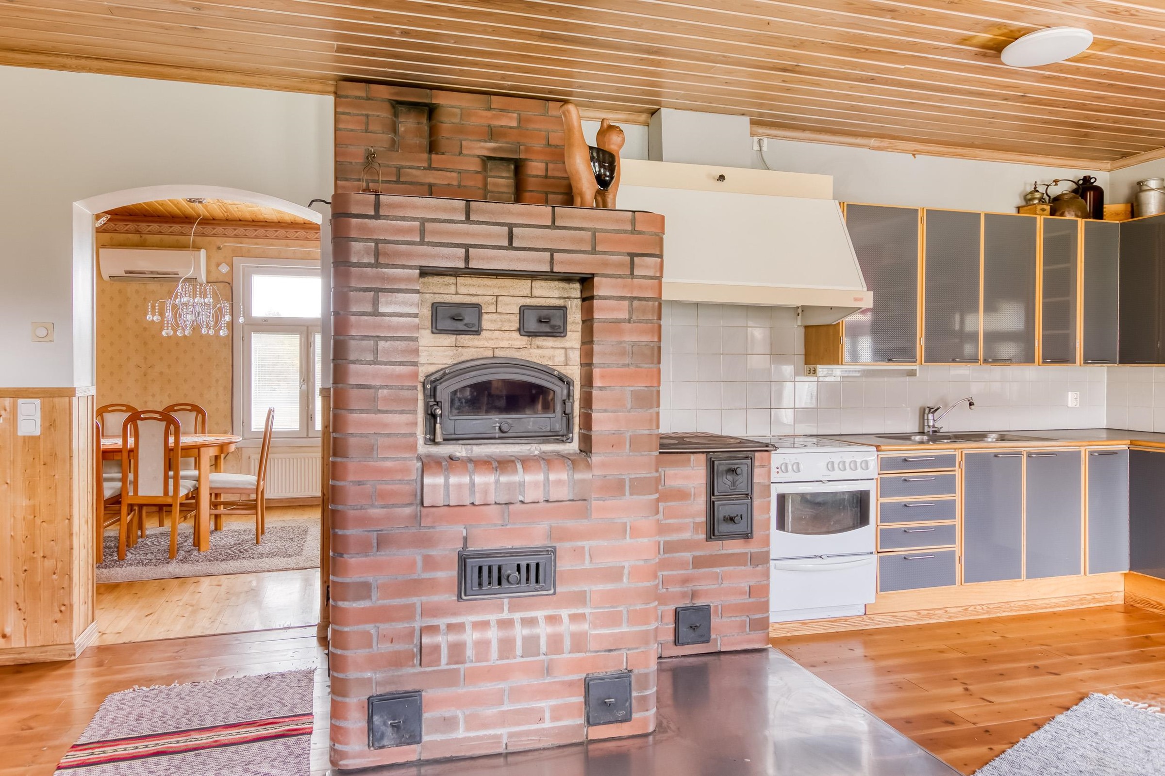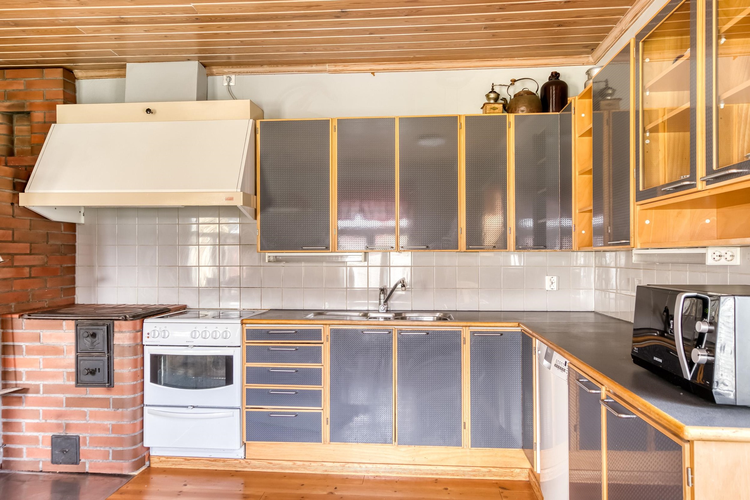 - Jääkaappi, keraaminen liesi, liesikupu, liesituuletin, leivinuuni, astianpesukone, kaapistot, Puuliesi.