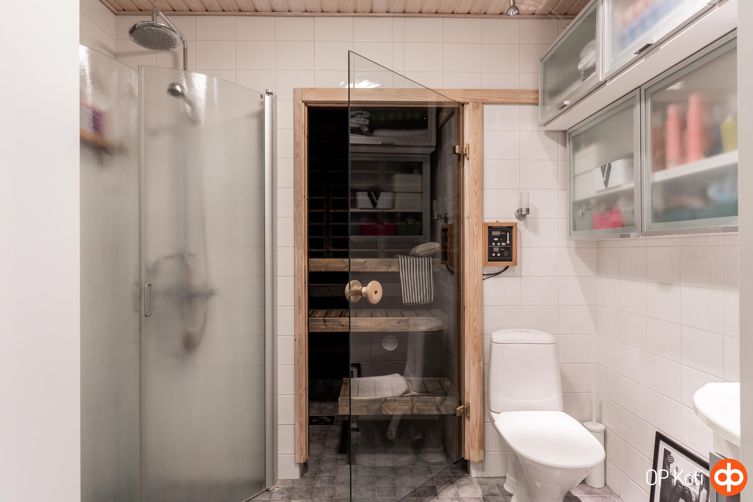 - Saunassa sähkökiuas, kylpyhuoneessa suihku, suihkuseinä, wc, lisäksi erillinen wc, peilikaappi, allaskaappi, pesukoneliitäntä, lattialämmitys, kiinteät valaisimet.