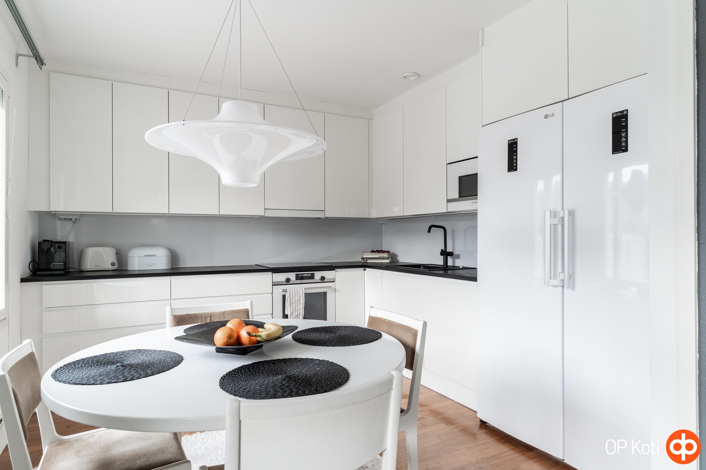 - Jääkaappipakastin, erillisuuni, induktioliesitaso, liesituuletin, mikroaaltouuni, astianpesukone, kaapistot, kiinteät valaisimet.