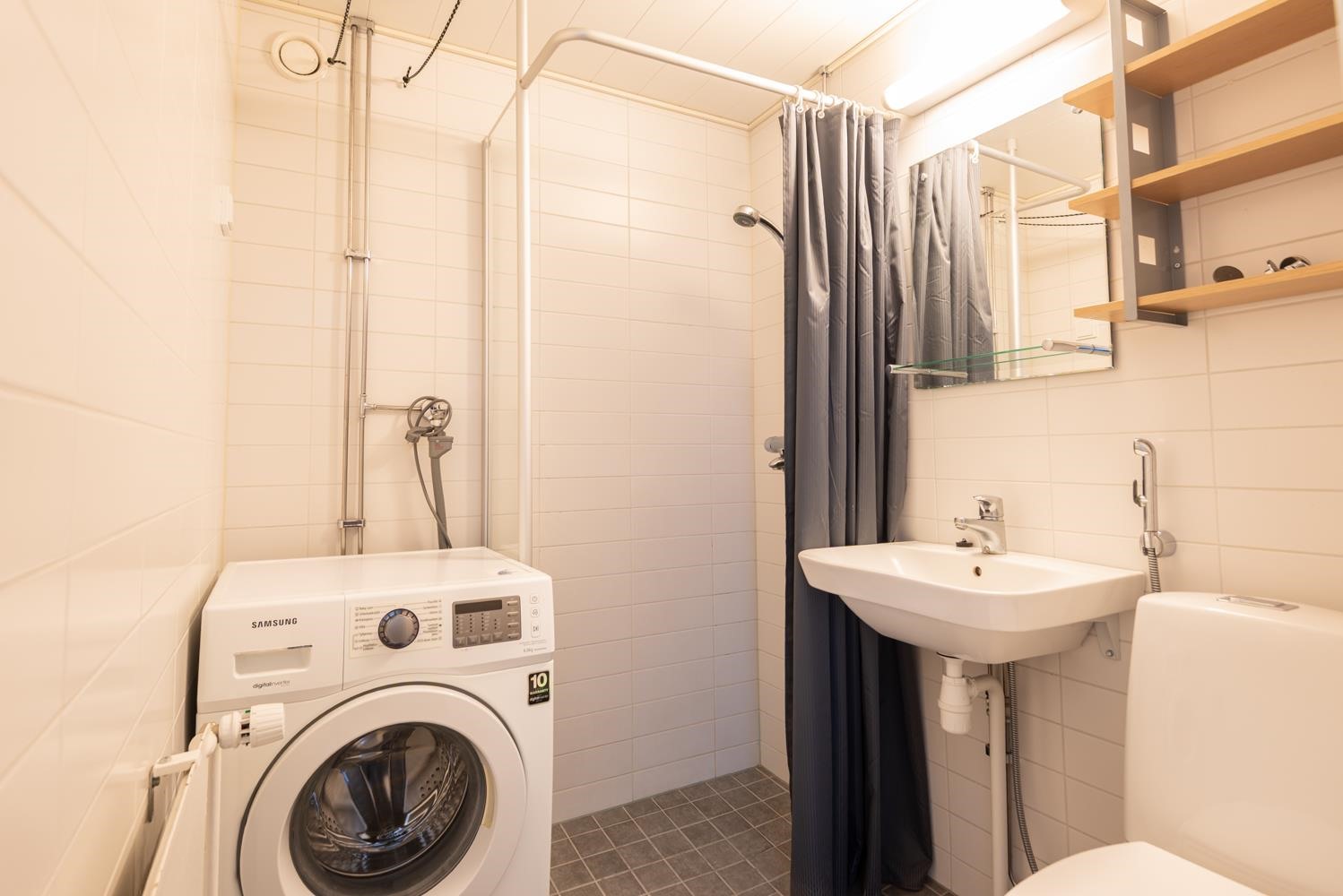 - Kylpyhuone, suihku, peilit, pesukoneliitäntä, kiinteät valaisimet. pyykinpesukone