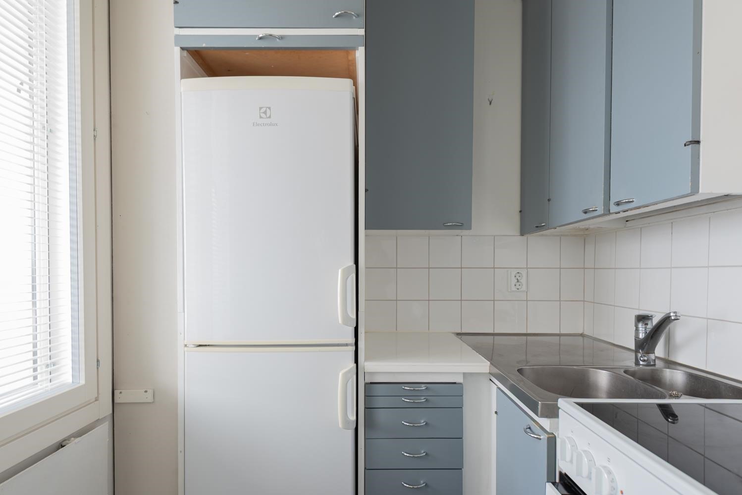 - Jääkaappipakastin, lattialiesi, kaapistot.