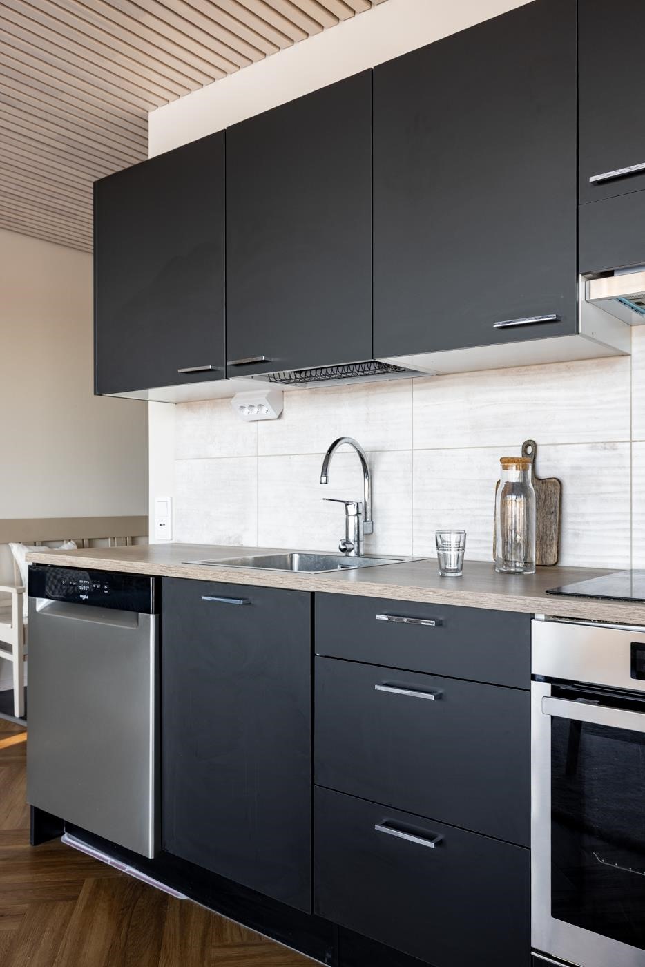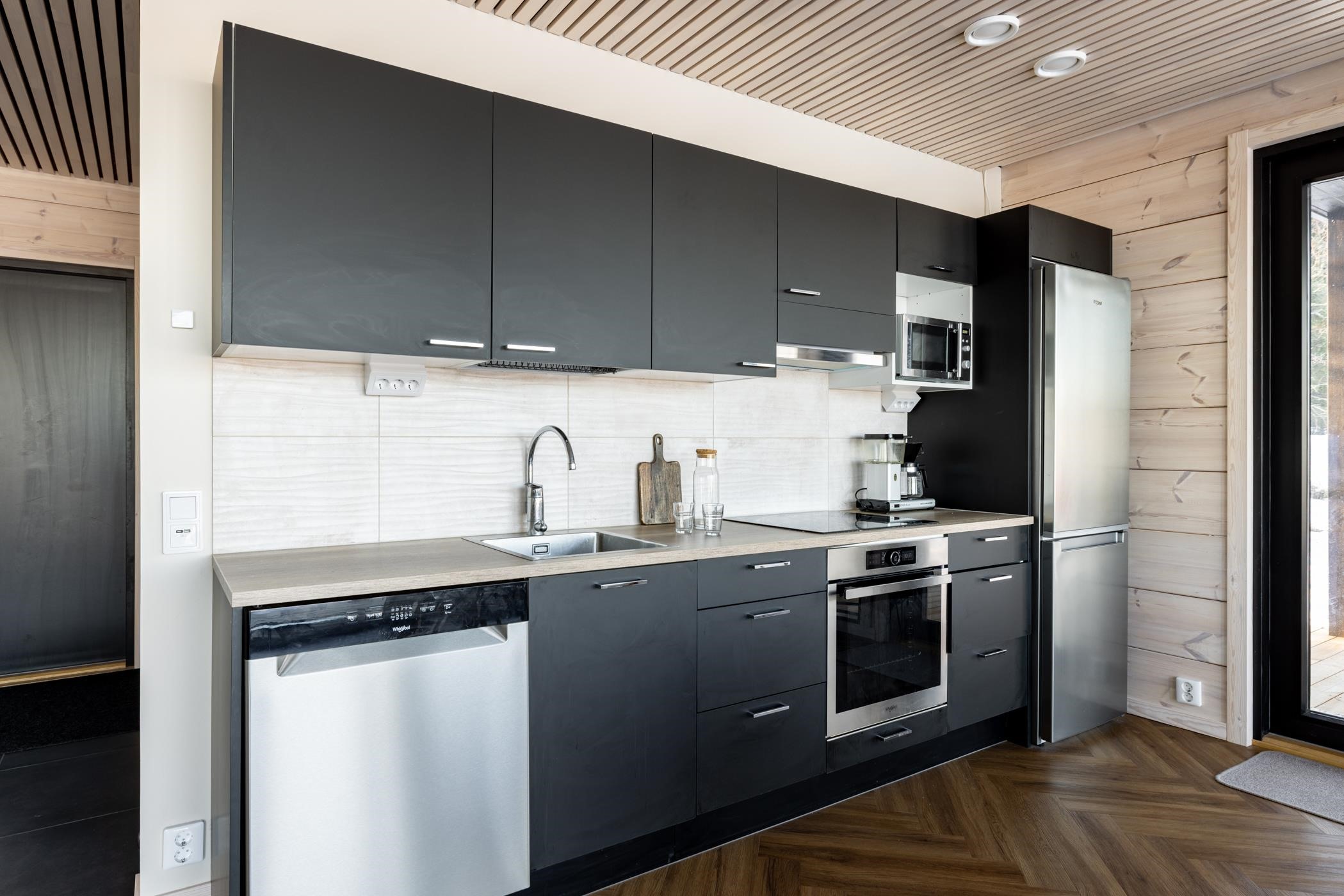 - Keittiön varusteina on jääkaappipakastin, erillisuuni, liesitaso (induktio), liesituuletin, mikroaaltouuni sekä astianpesukone.