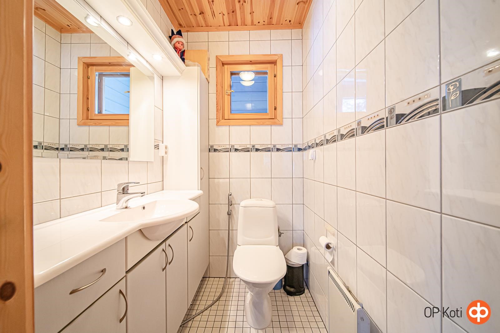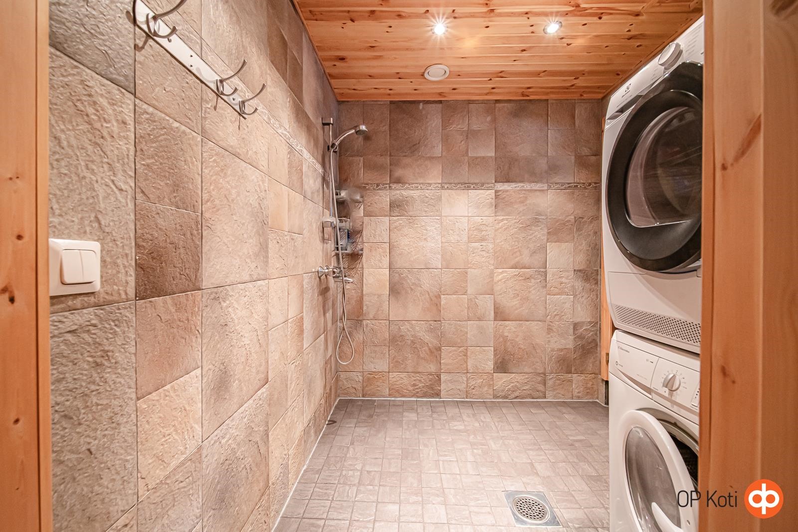 - Sauna, sähkökiuas, kylpyhuone, erillinen wc, suihku, peilikaappi, kaapit, allaskaappi, pesukoneliitäntä, lattialämmitys, kiinteät valaisimet. Lattialämmitys koko alakerrassa, yläkerrassa sähköpatterit. Sähköpatterit myös alakerran wc ja eteistilassa.