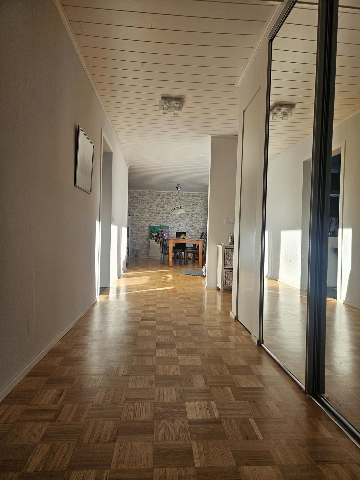 Keittiö: vinyyli, tapetti. Olohuone: parketti, tapetti. Makuuhuone 1: laminaatti, maali-tapetti. Makuuhuone 2: laminaatti, maali-tapetti. Makuuhuone 3: laminaatti, maali-tapetti. Sauna: laatta, paneeli. Kylpyhuone: laatta. Eteinen: parketti, tapetti. Wc: vinyyli, tapetti.