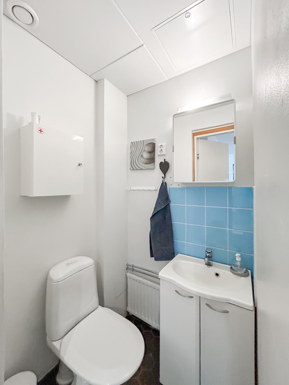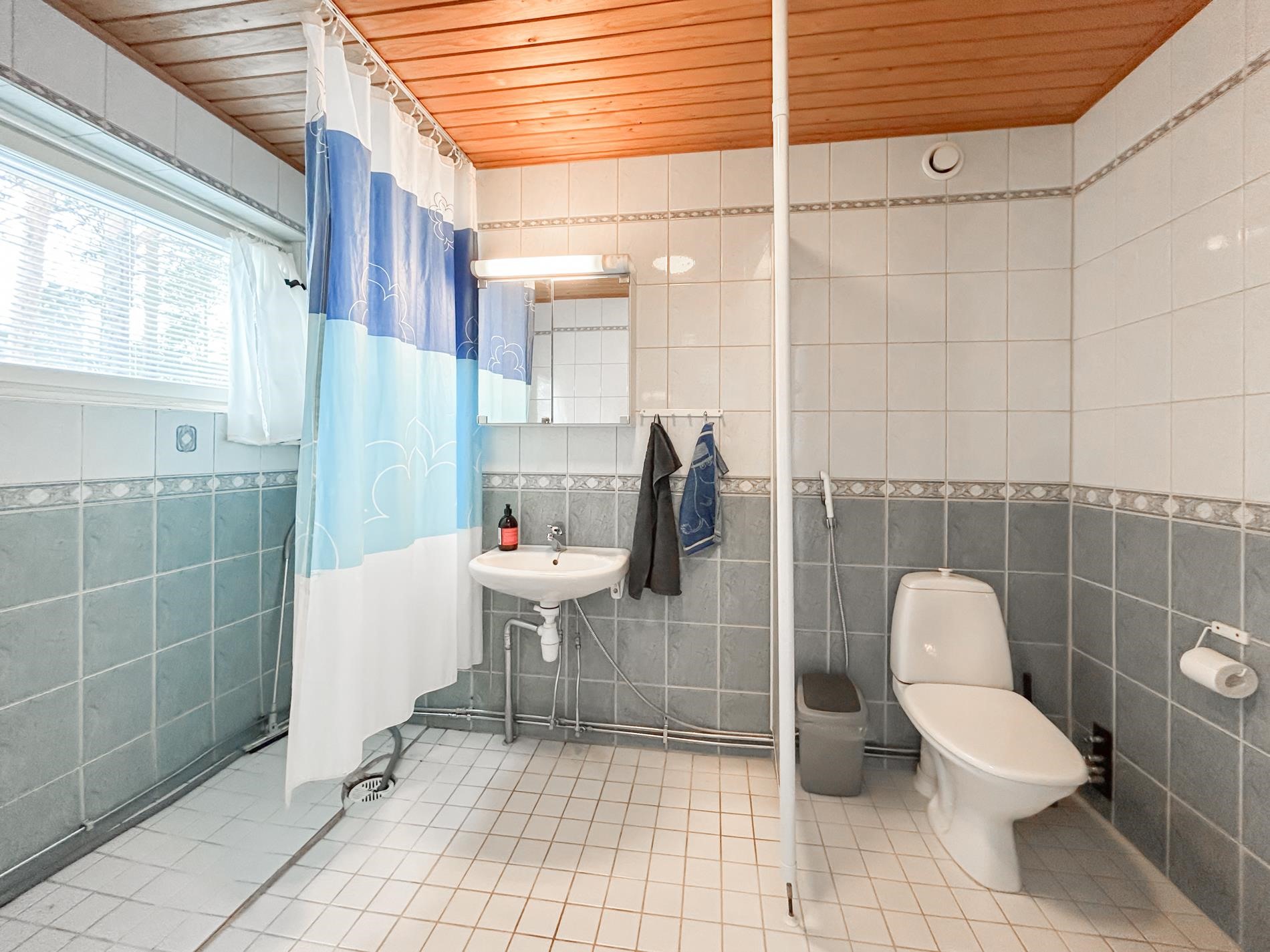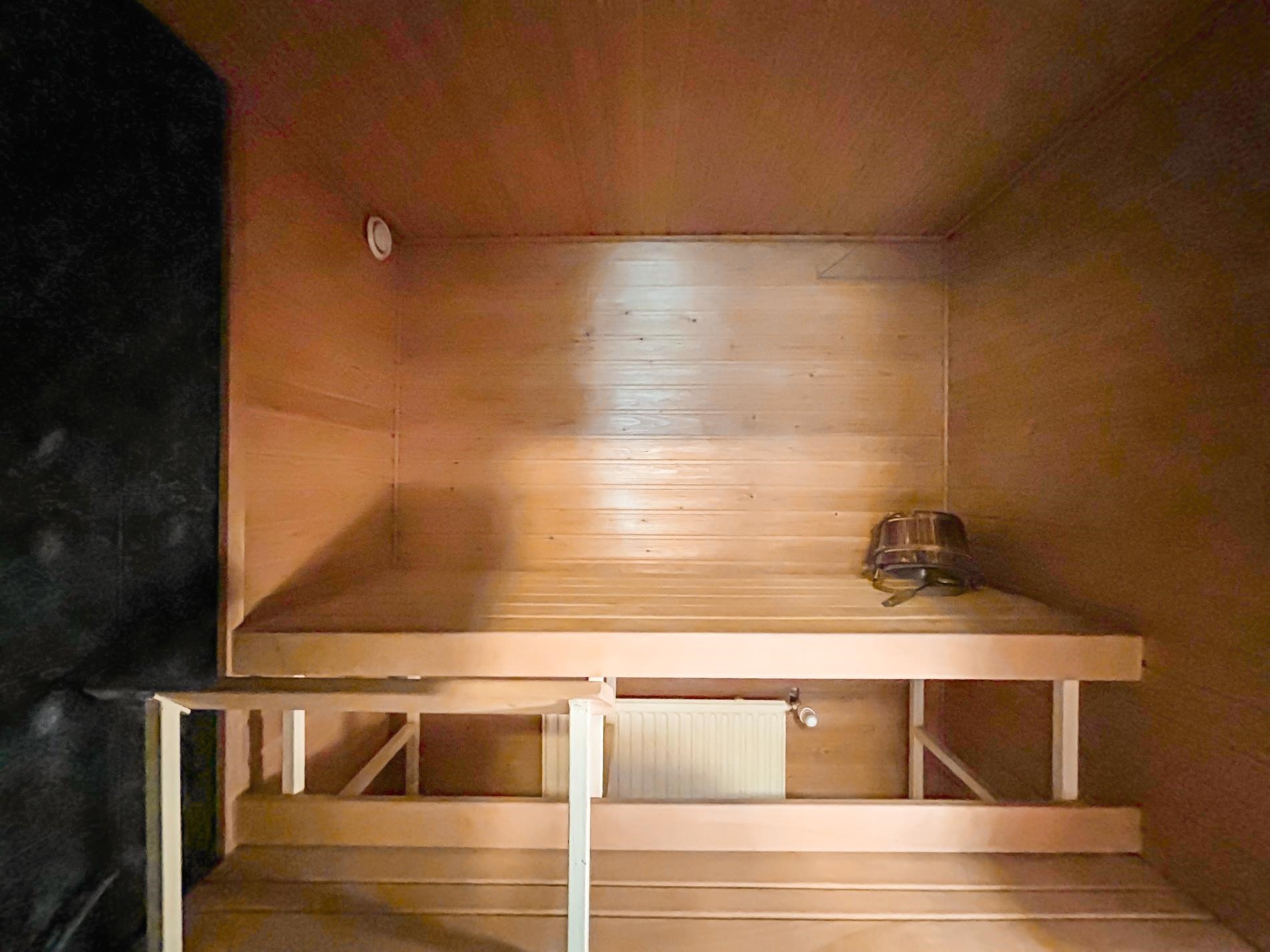 - Sauna, sähkökiuas, kylpyhuone, erillinen wc, suihku, peilikaappi, allaskaappi, pesukoneliitäntä.