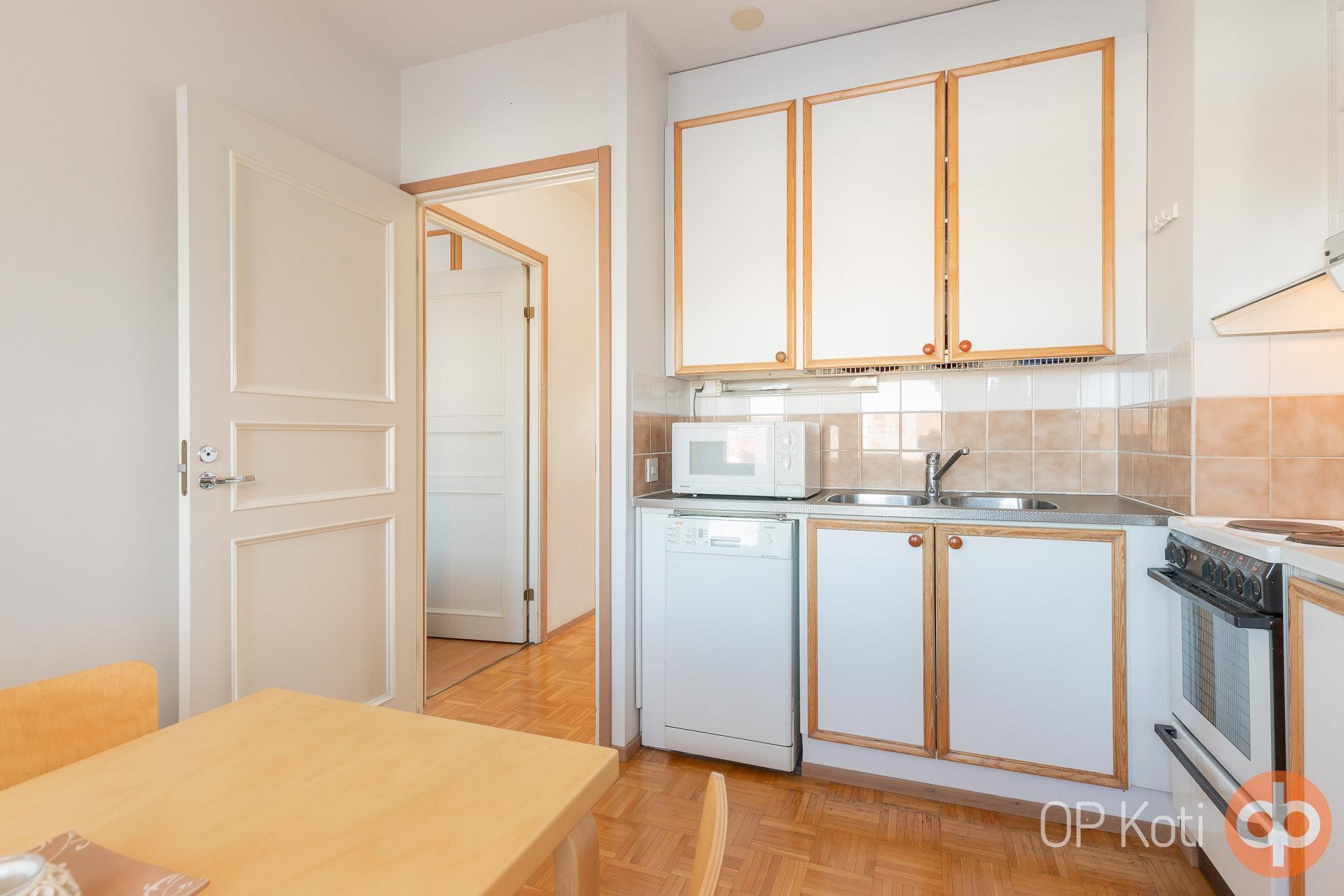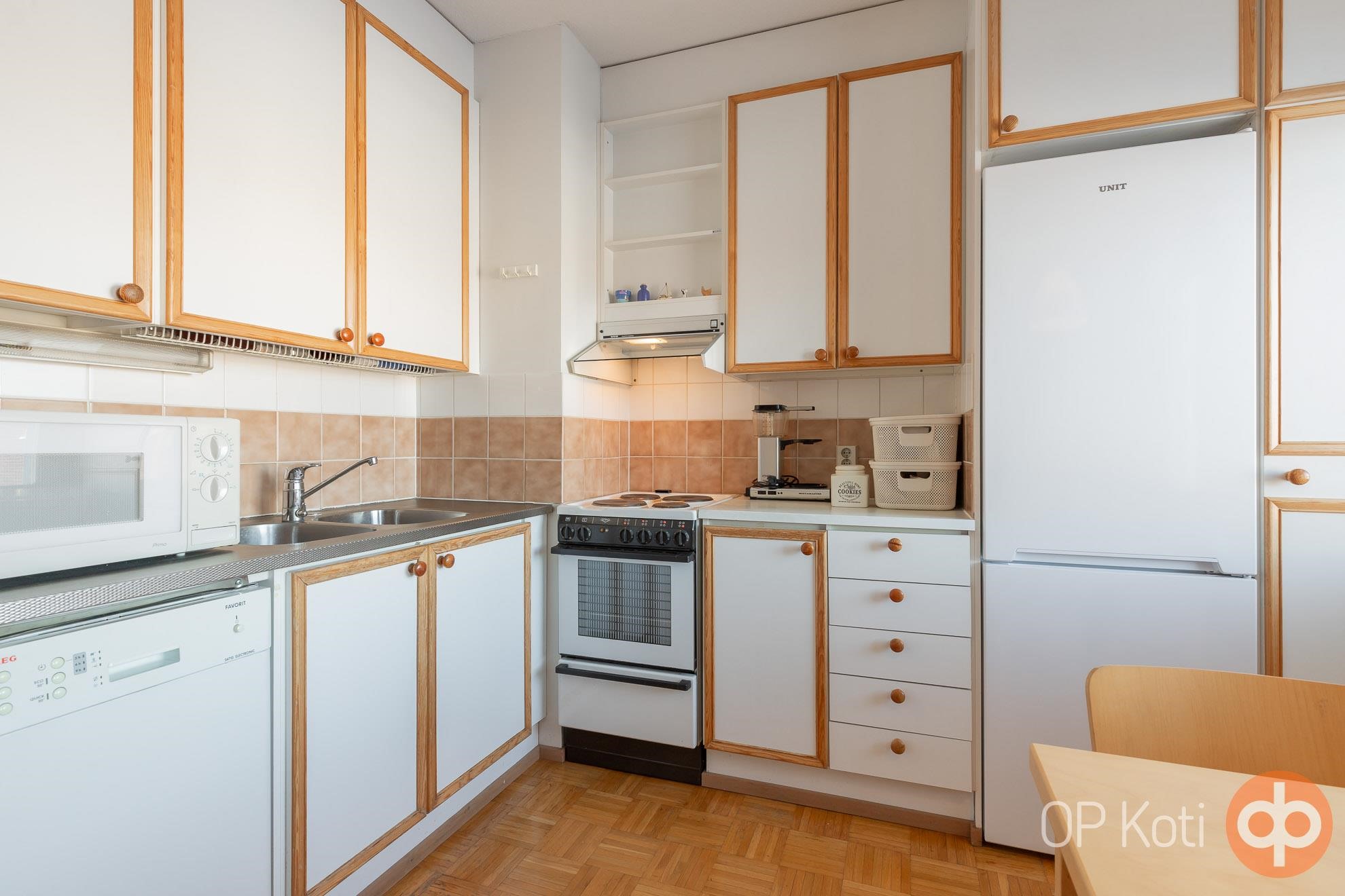 - Jääkaappipakastin, sähköliesi, liesituuletin, astianpesukone (kapea malli), kaapistot.