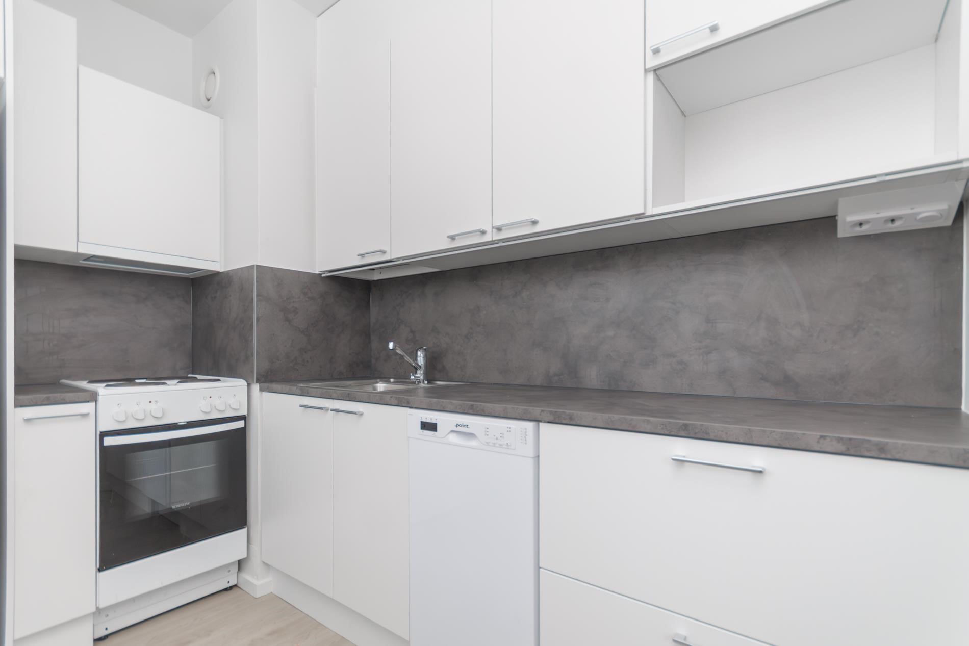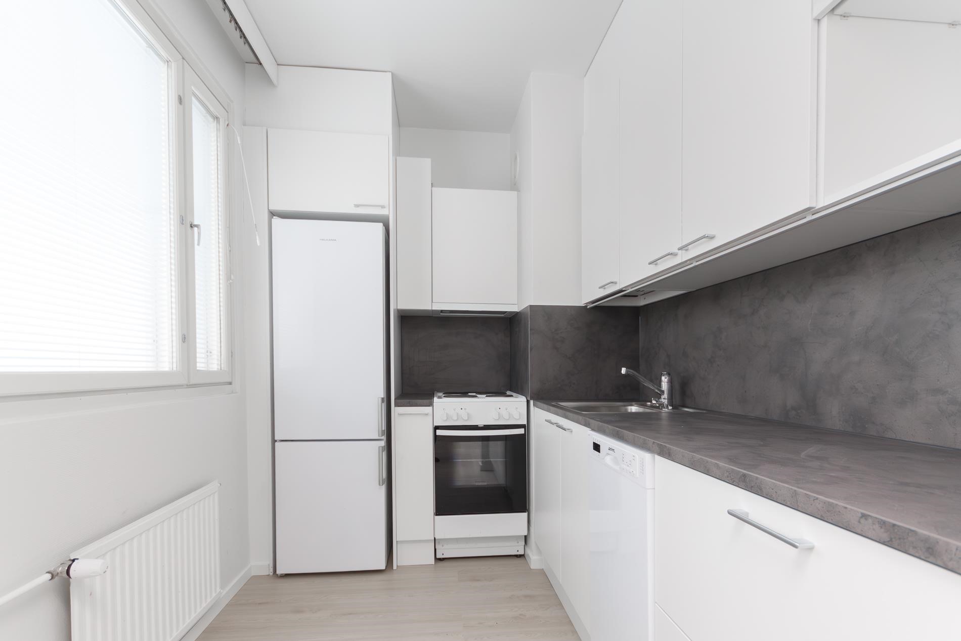 - Jääkaappipakastin, sähköliesi, liesituuletin aktiivihiilisuodatin, astianpesukone, kaapistot, kiinteät valaisimet.