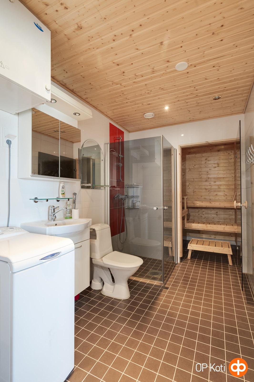 - Sauna, sähkökiuas, kylpyhuone, suihku, suihkuseinä, peilikaappi, pesukoneliitäntä, lattialämmitys, kiinteät valaisimet.