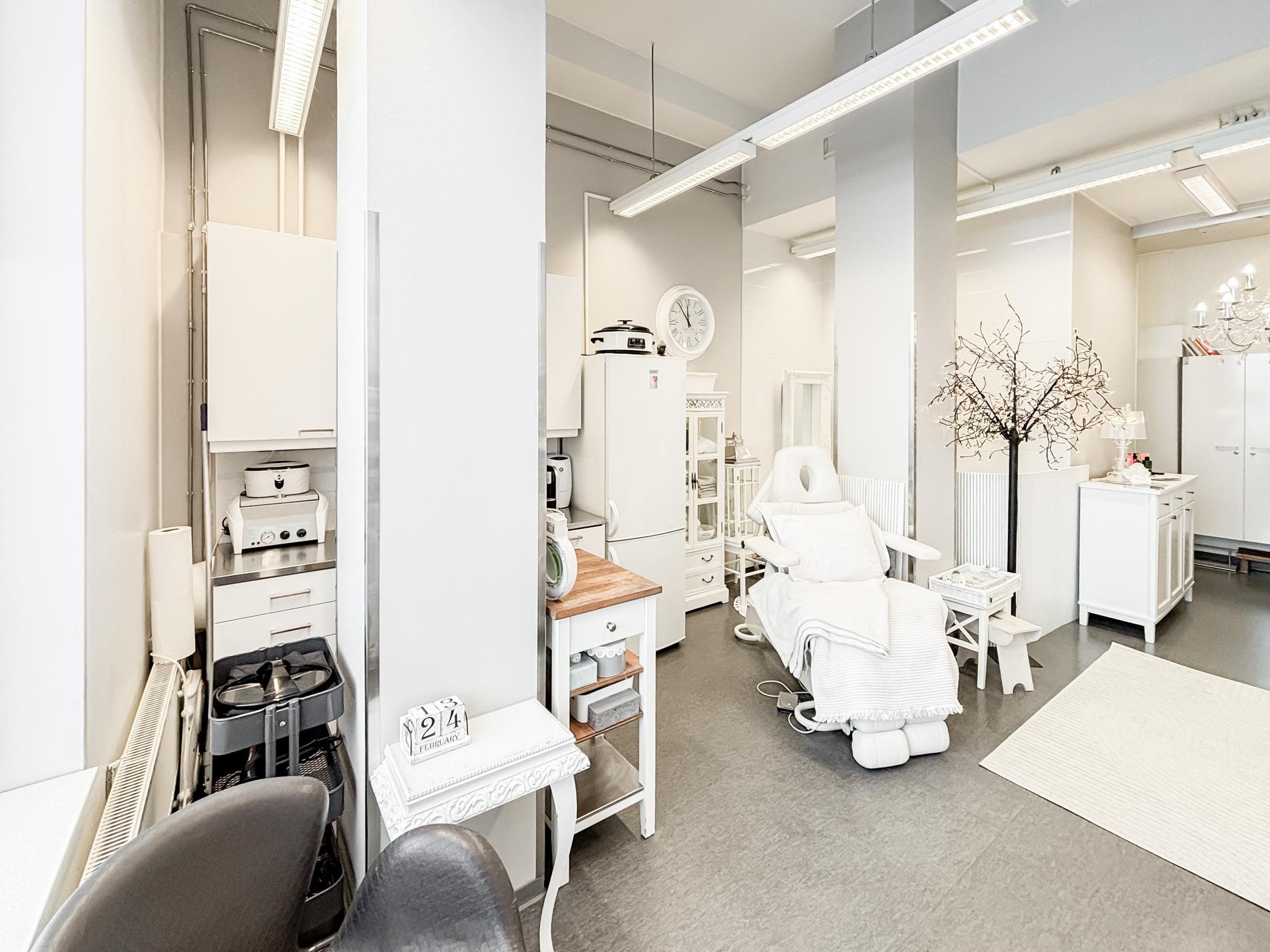 Sisätilat ovat lähes uudenveroisessa kunnossa. Raikkaat pinnat ja huoliteltu kokonaisuus luovat modernin ja edustavan ympäristön monenlaiseen yritystoimintaan. Tila soveltuu loistavasti esimerkiksi kauneus ja hyvinvointialalle toimistoksi studioksi tai showroomiksi.