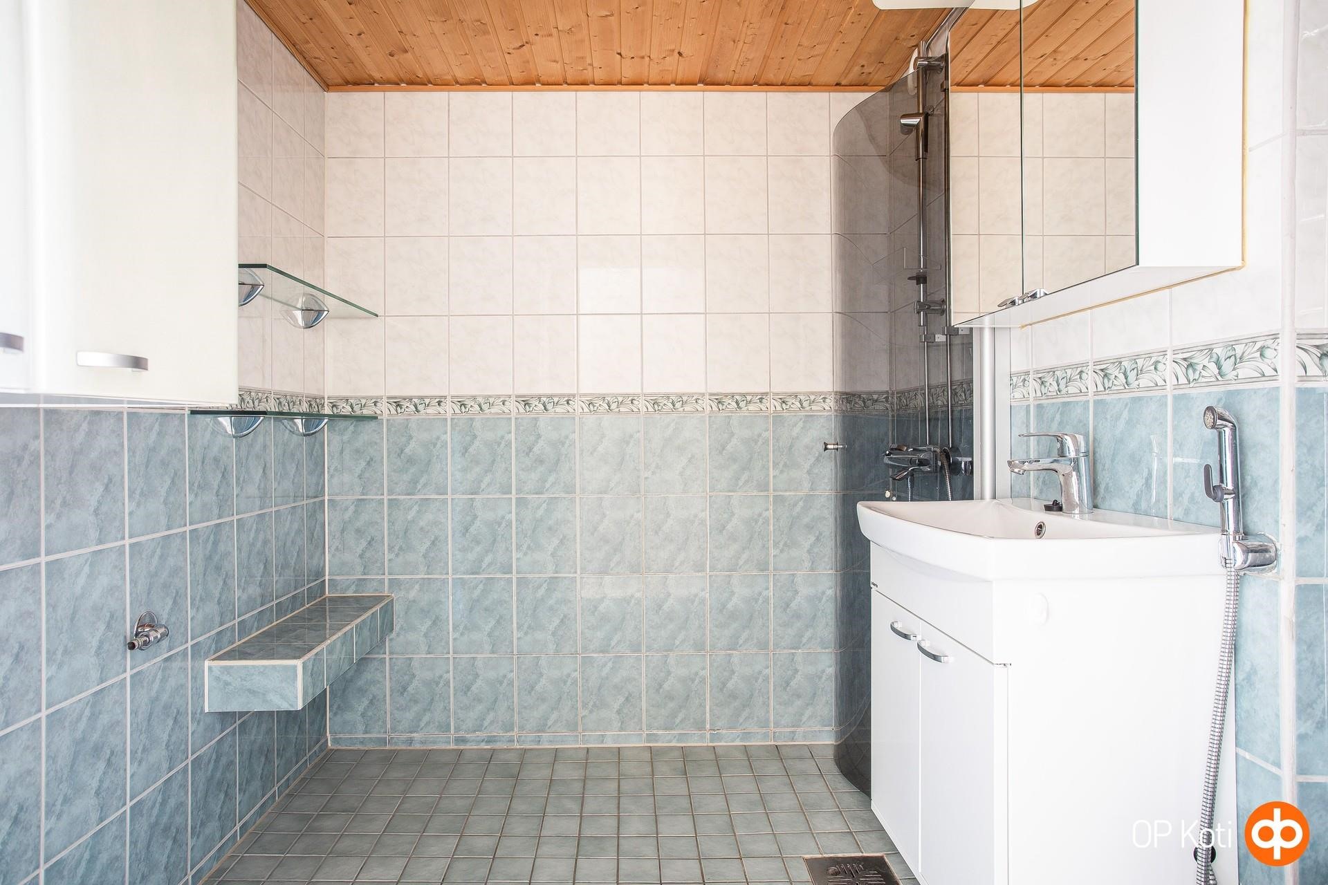 - Kylpyhuone, suihku, suihkuseinä, peilikaappi, allaskaappi, pesukoneliitäntä, lattialämmitys.