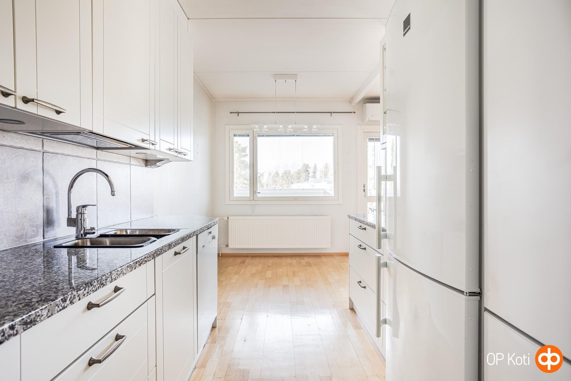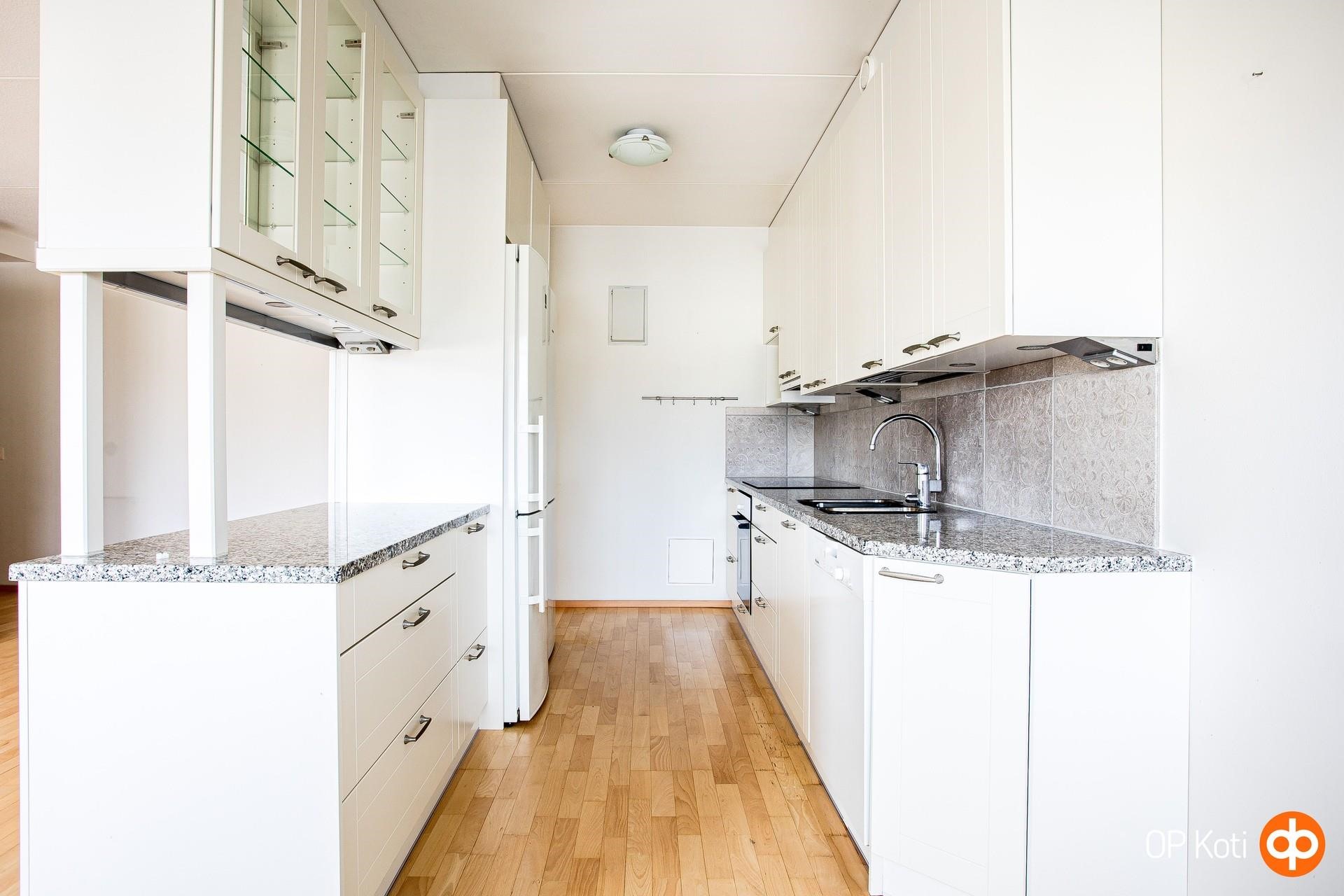 - Jääkaappi Täyskorkea,, pakastekaappi täyskorkea, erillisuuni, induktioliesi, liesituuletin, astianpesukone, kaapistot Puustelli, kiinteät valaisimet. Keittiö remontoitu 2000-luvun alkupuolella.