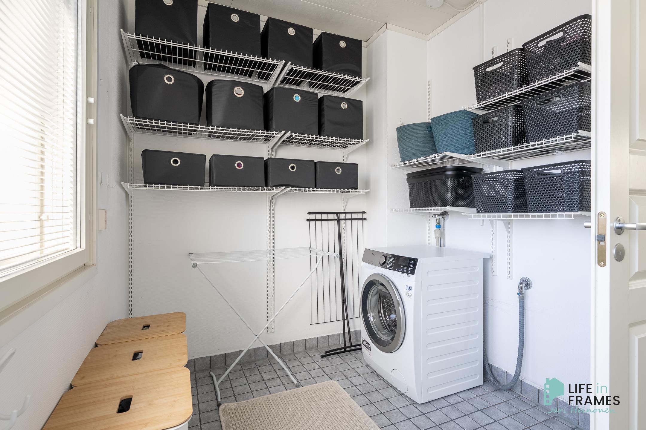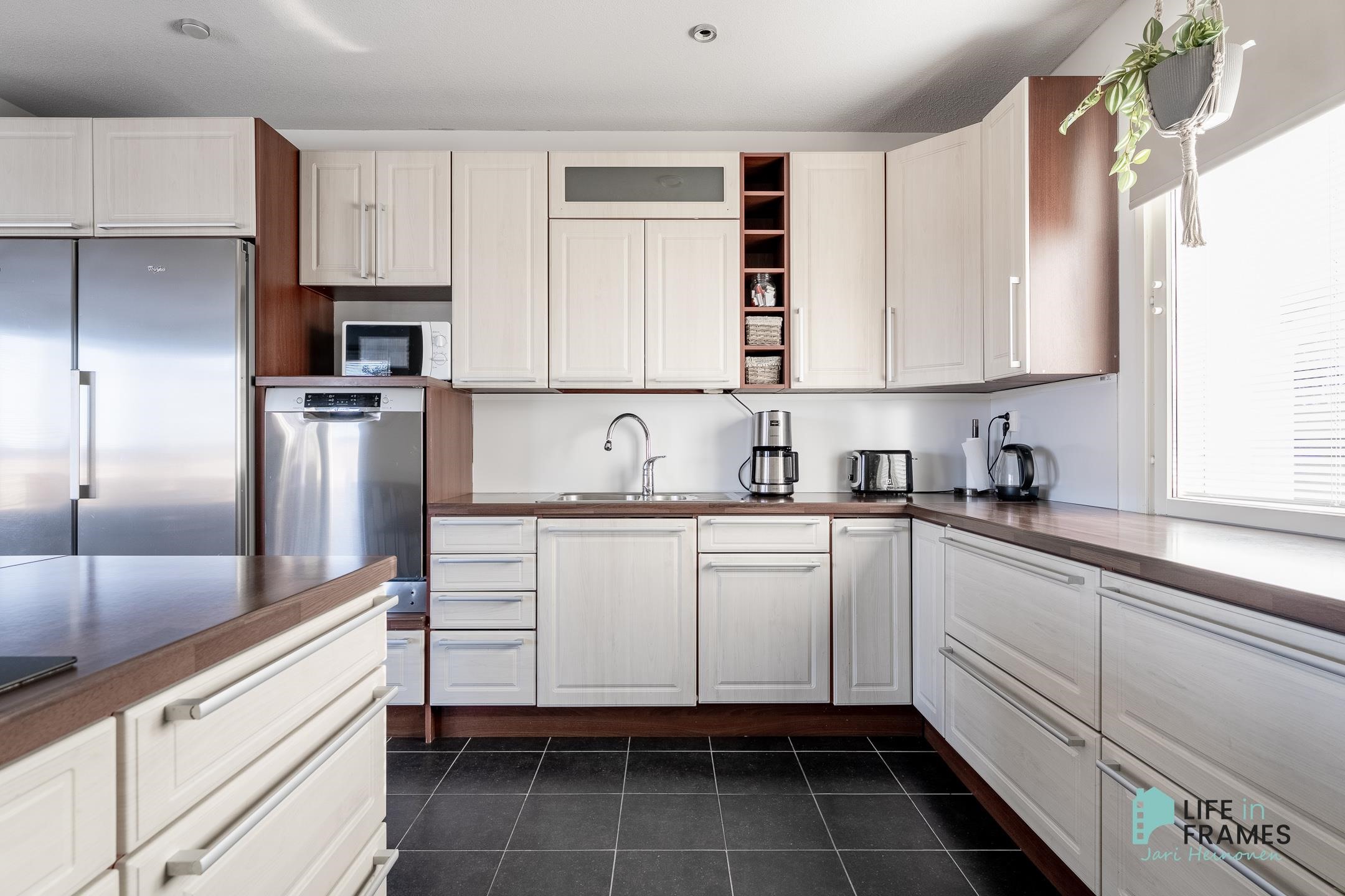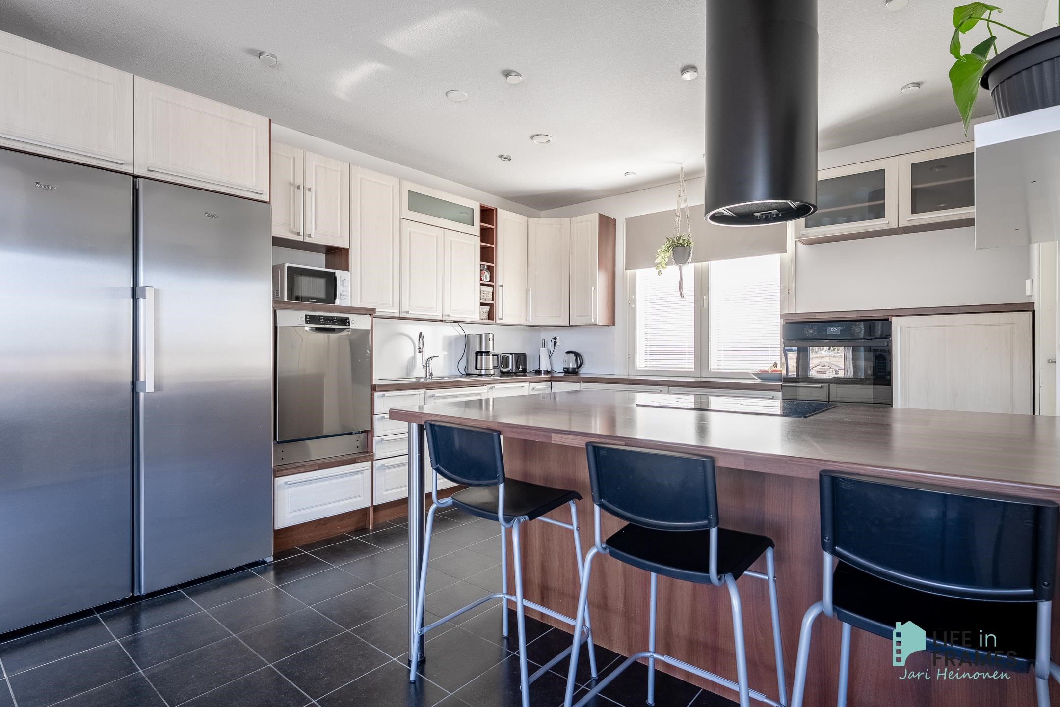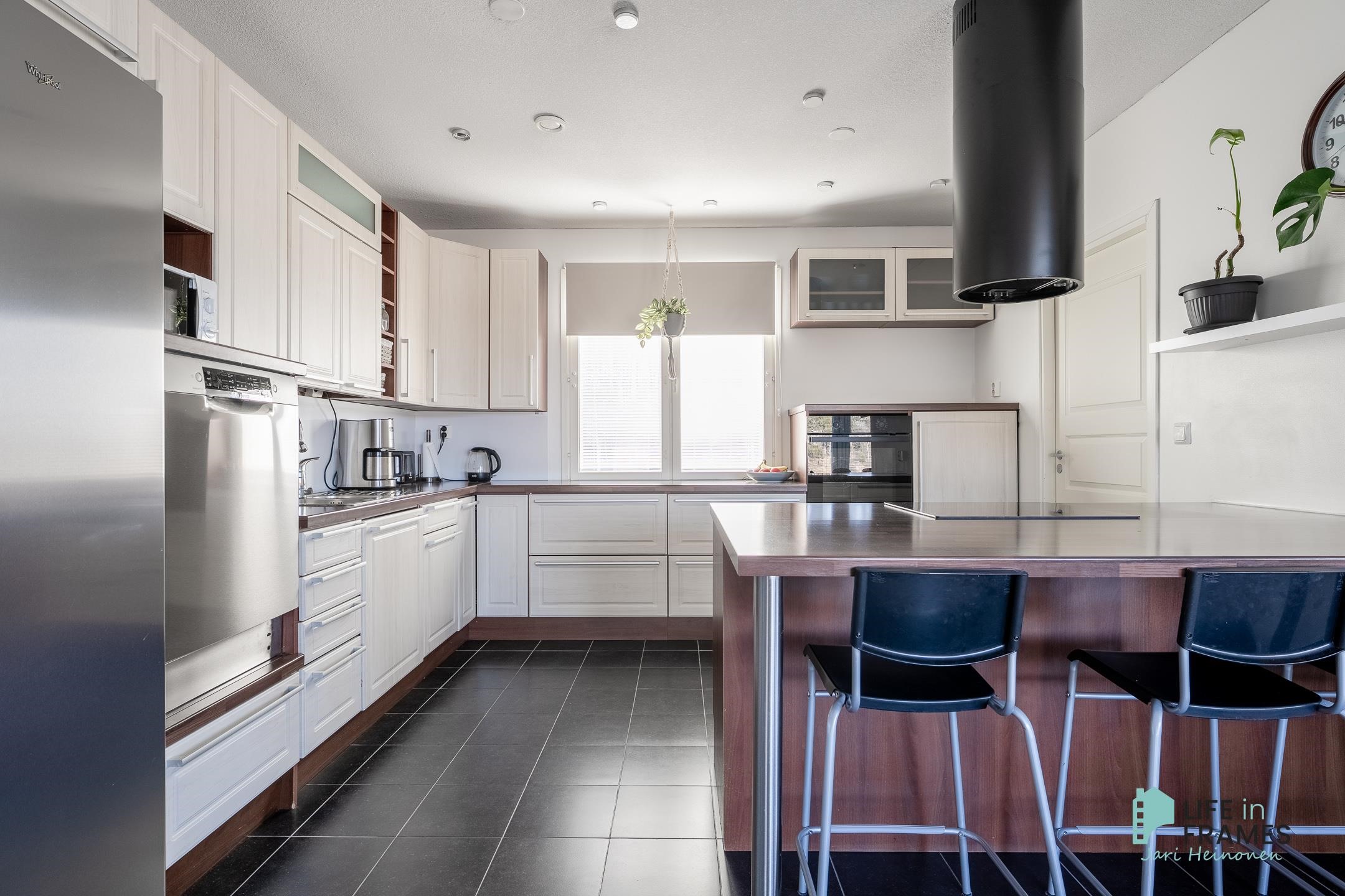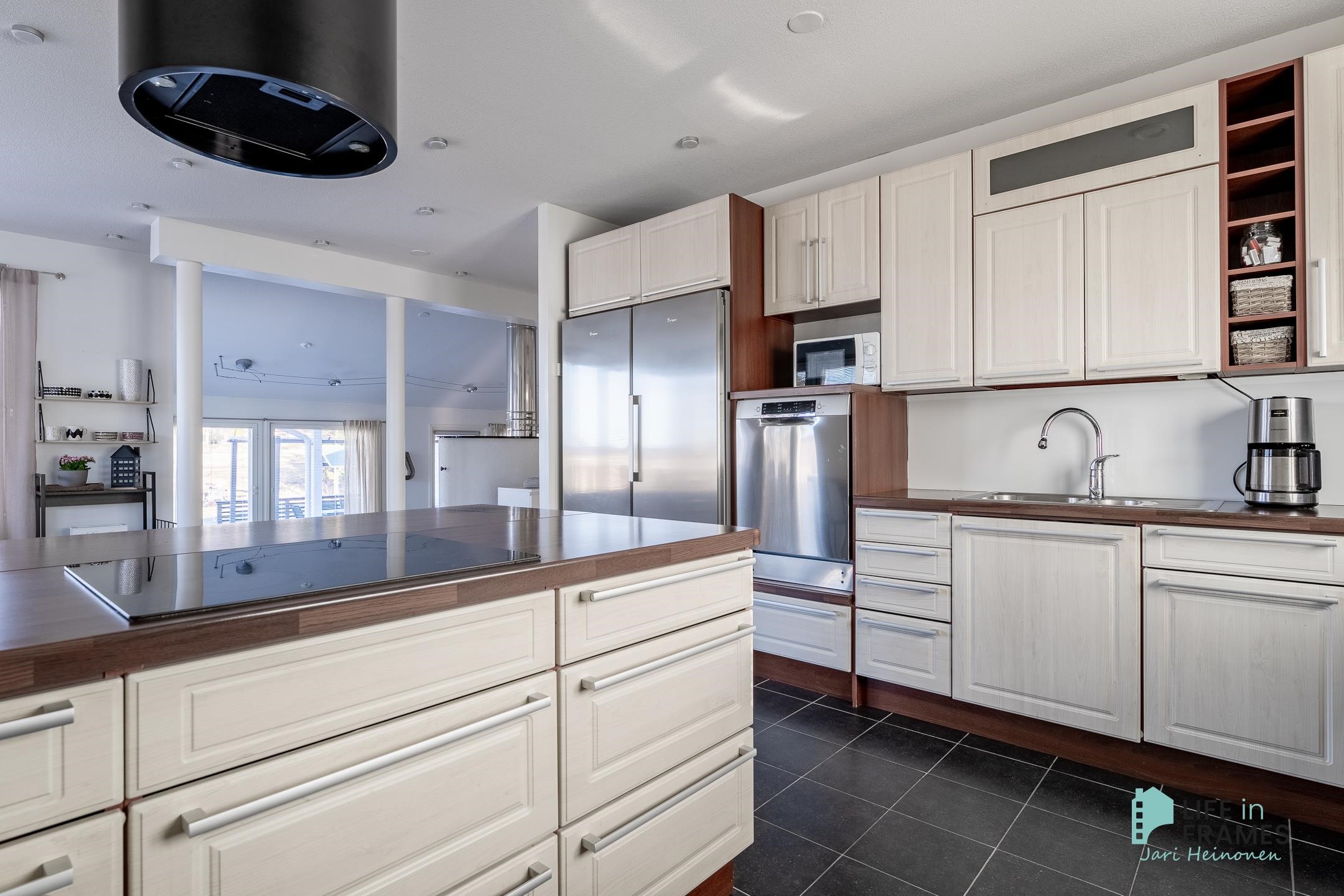 - Jääkaappi (2016), pakastekaappi (2016), erillisuuni, liesitaso, keraaminen liesi (2018), liesituuletin (2025), astianpesukone, kaapistot, kiinteät valaisimet.