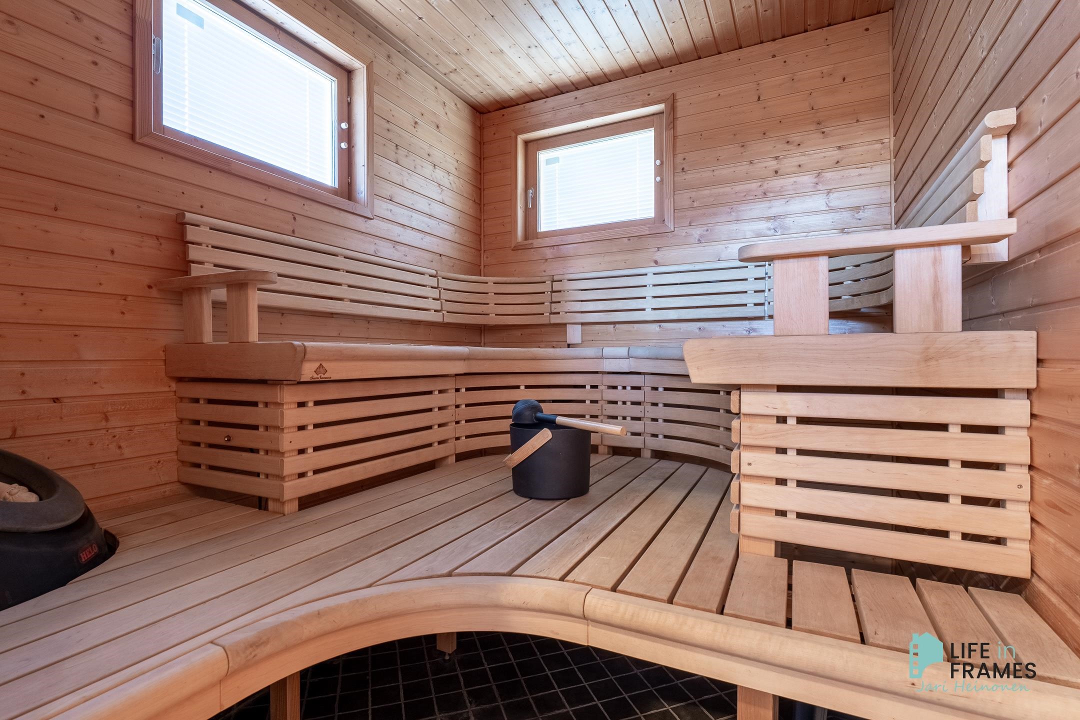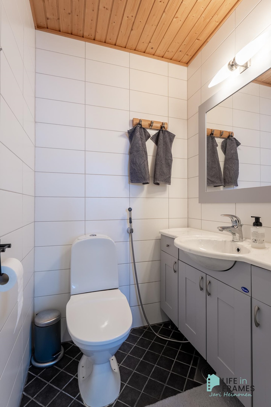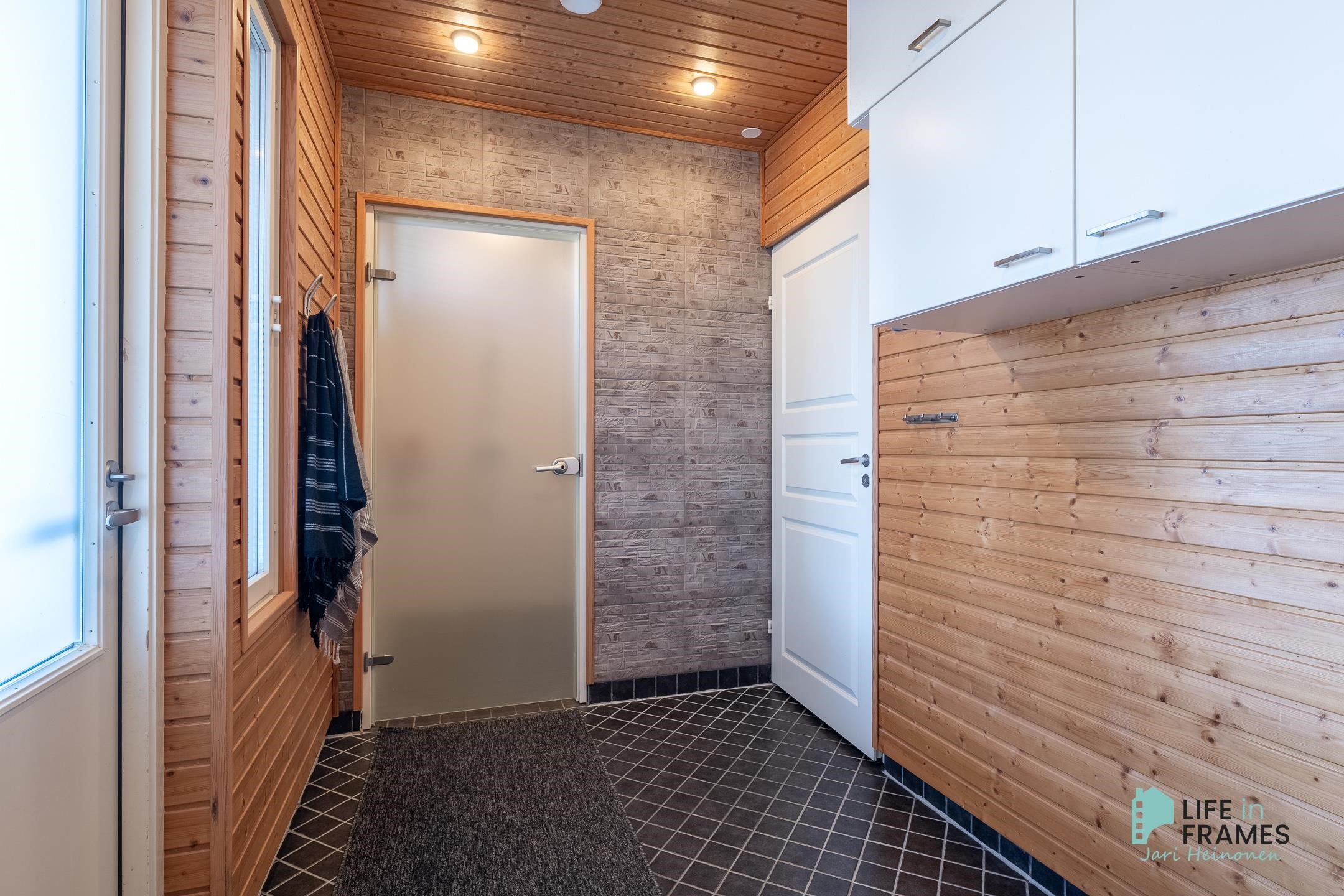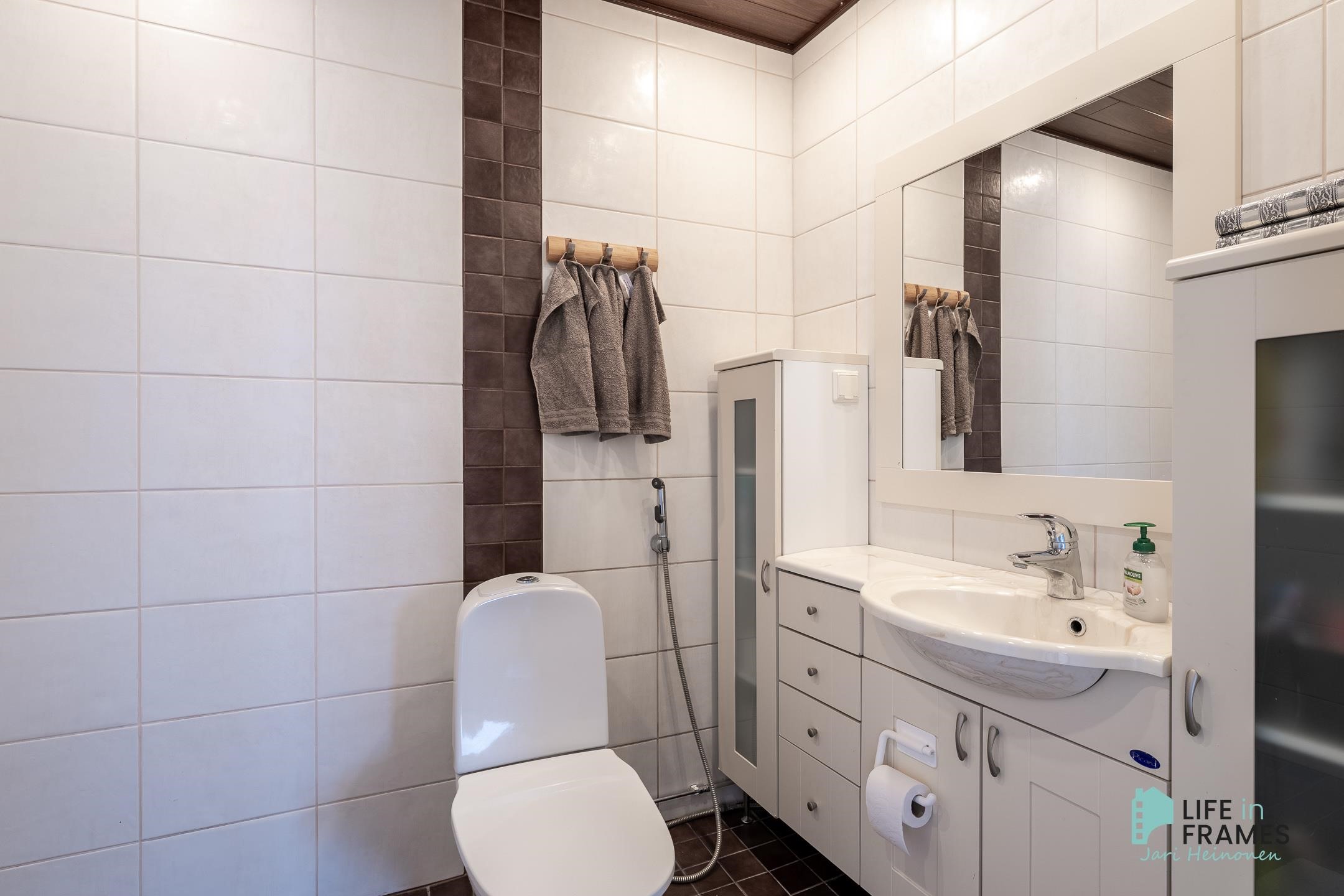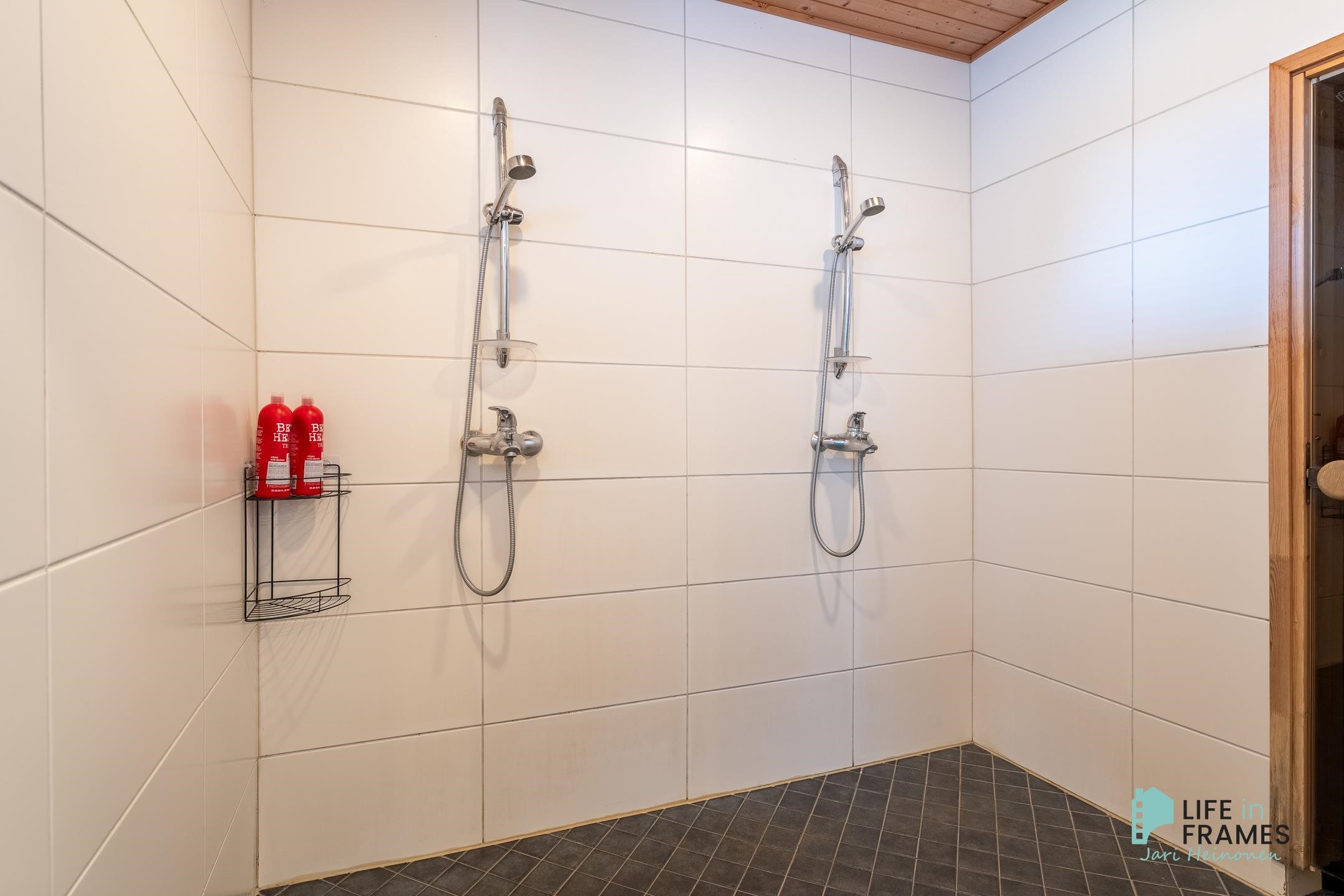 - Sauna, sähkökiuas, kylpyhuone, erillinen wc (x2), suihku (x2), peilit, kaapit, allaskaappi, pesukoneliitäntä, lattialämmitys, kiinteät valaisimet.
