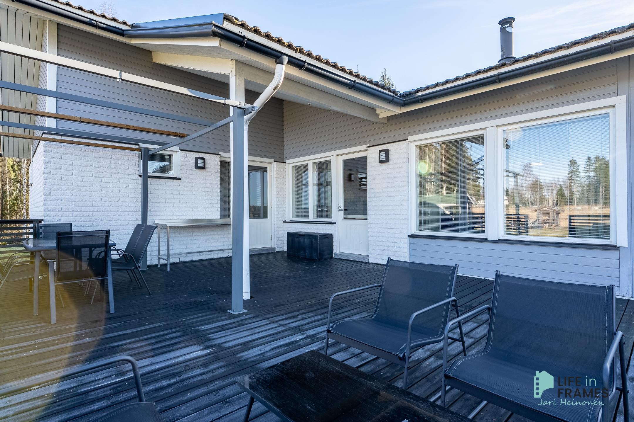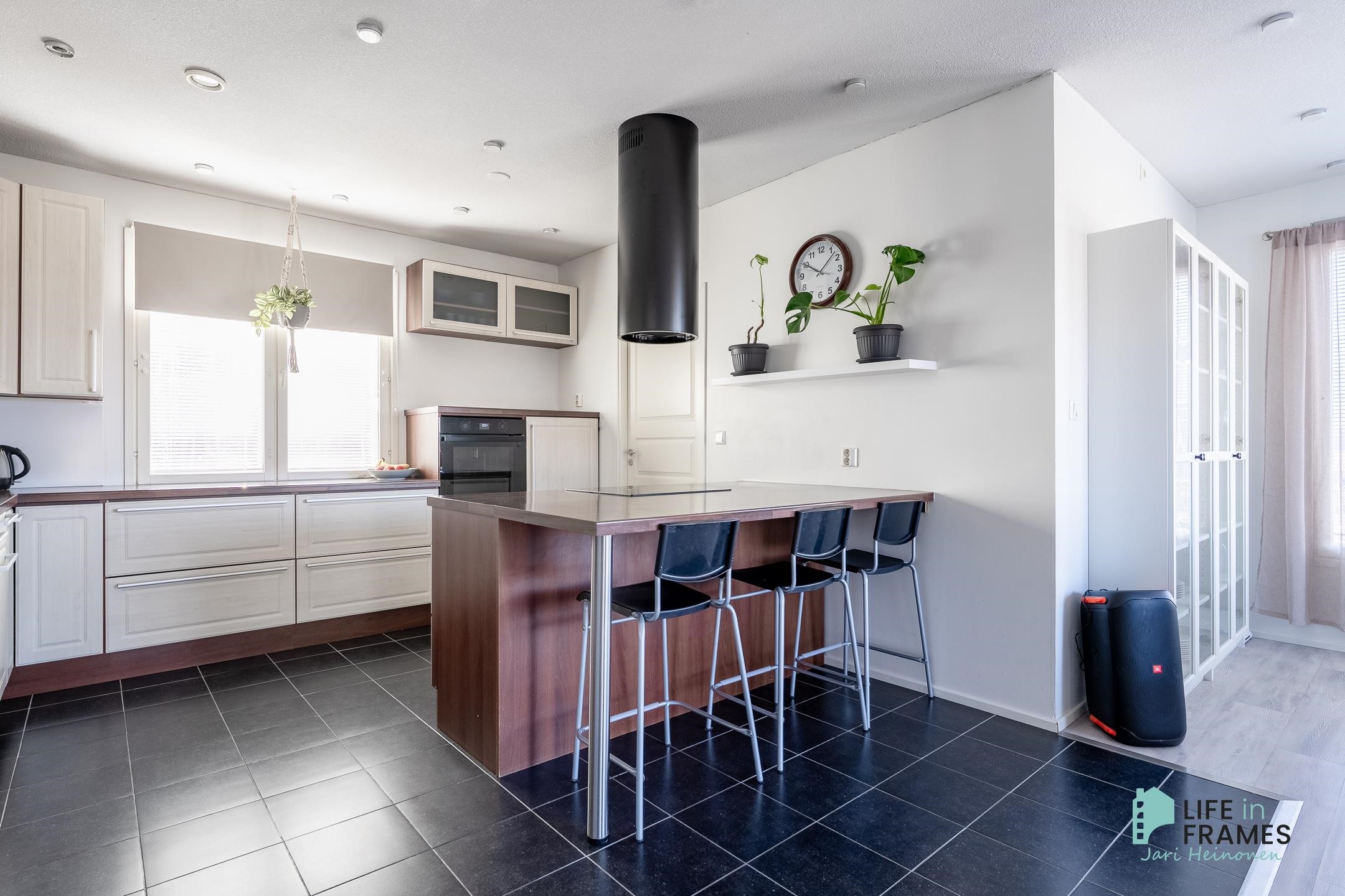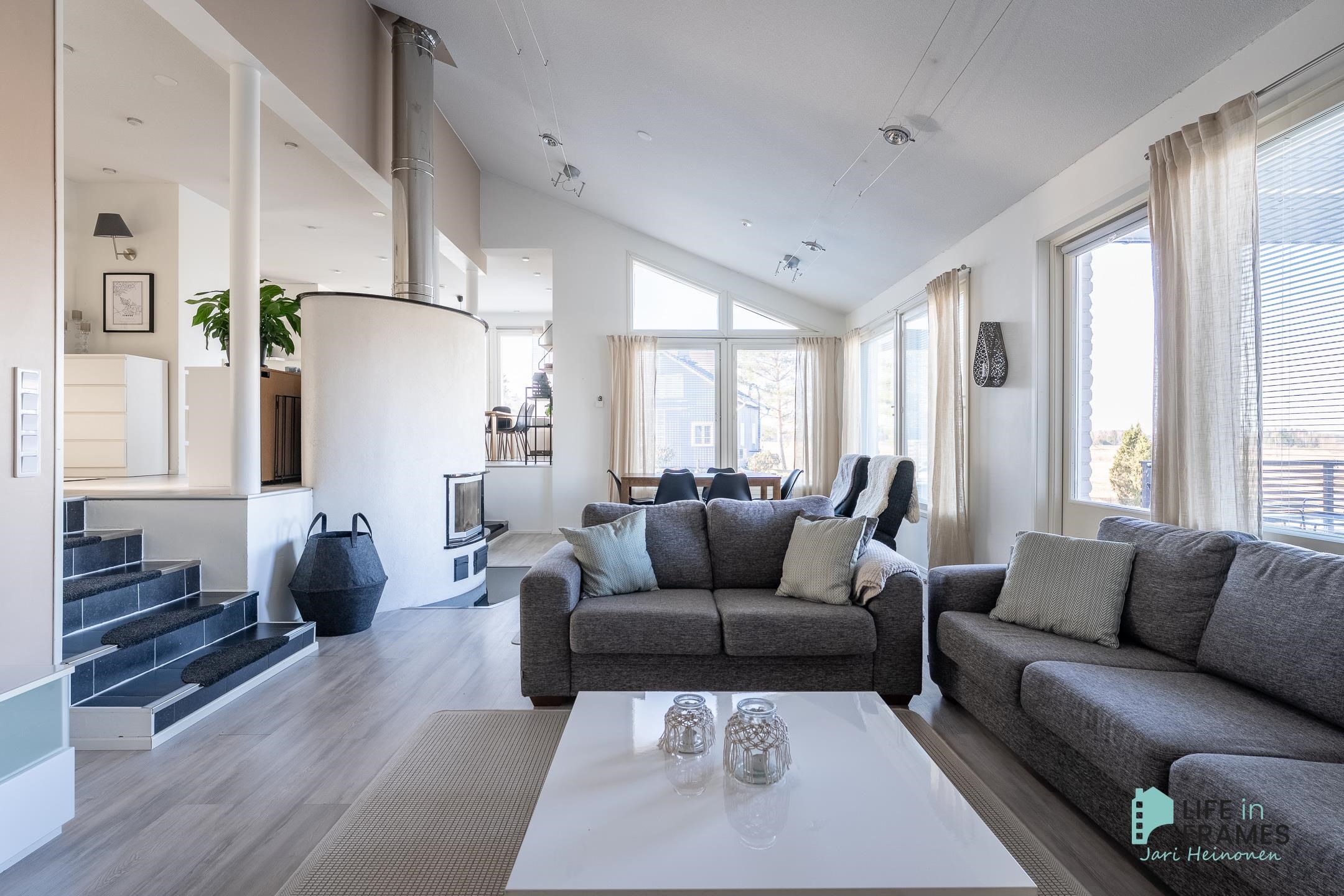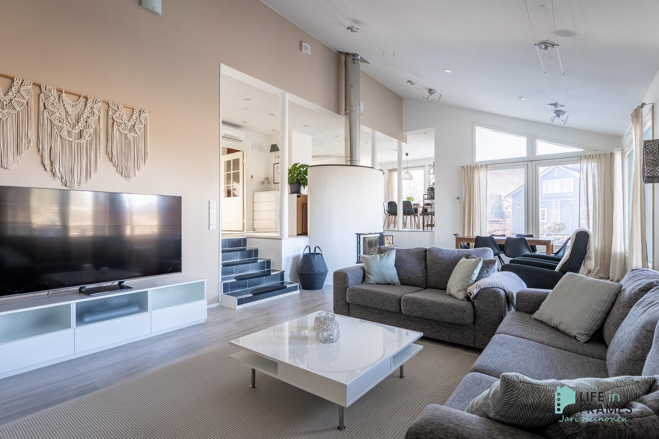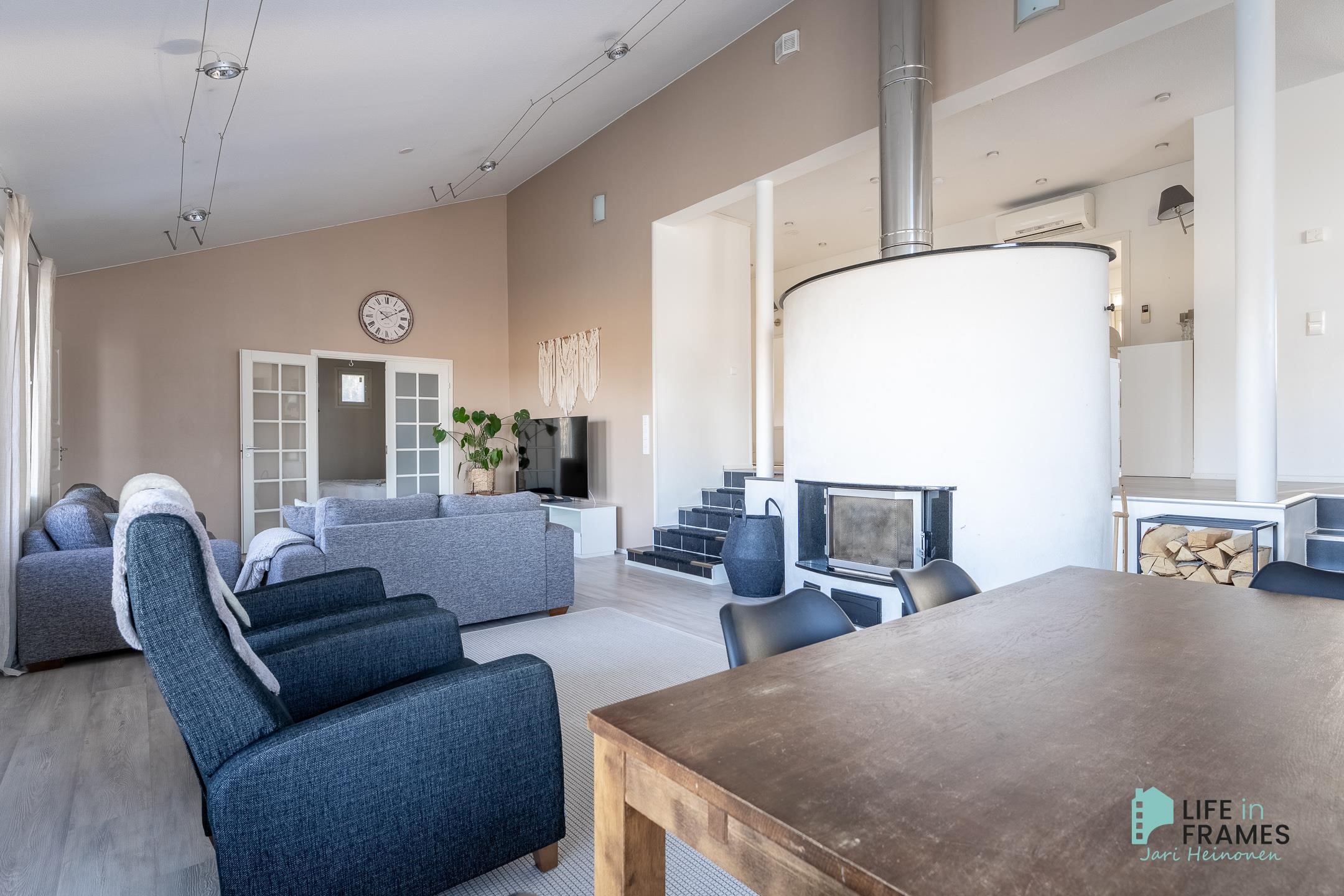 Pohjaratkaisu on toimiva ja talossa on useampi makuuhuone, mikä tarjoaa jokaiselle perheenjäsenelle omaa rauhaa. Kodin sydämenä on ehdottomasti avoin keittiön, ruokailutilan ja olohuoneen muodostama kokonaisuus. Tilan keskiössä on upea varaava takka, joka toimii niin lämmön lähteenä kuin tunnelman luojanakin. Keittiössä mahtuu kokkailemaan useampikin kokki ja ruokapöydälle on oma paikkansa valoisassa erkkerissä. Muutaman askelman alempana sijaitsevan olohuoneen viistokatto tuo avaruutta koko tilaan. Olohuone jatkuu luontevasti reilunkokoiselle terassille.