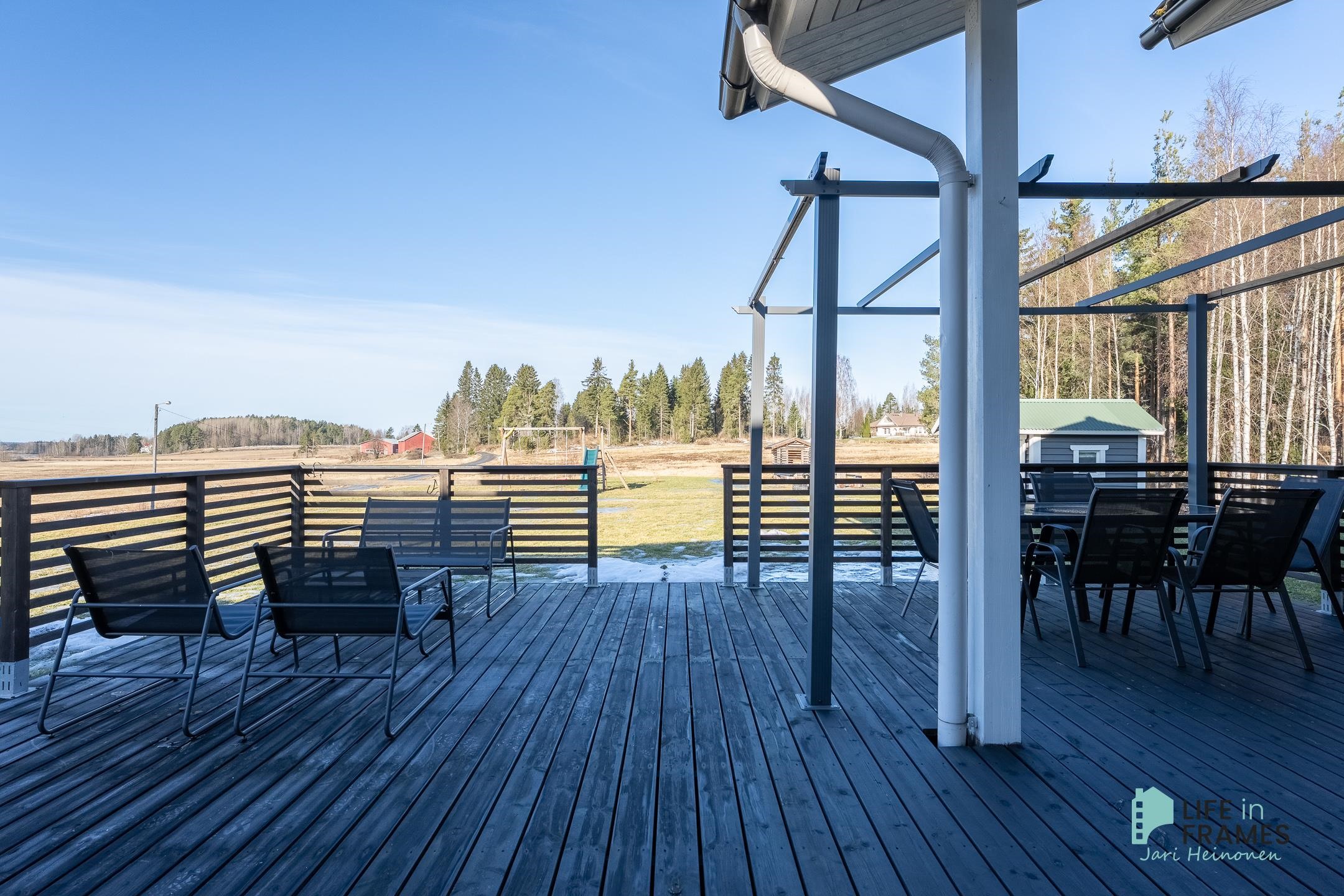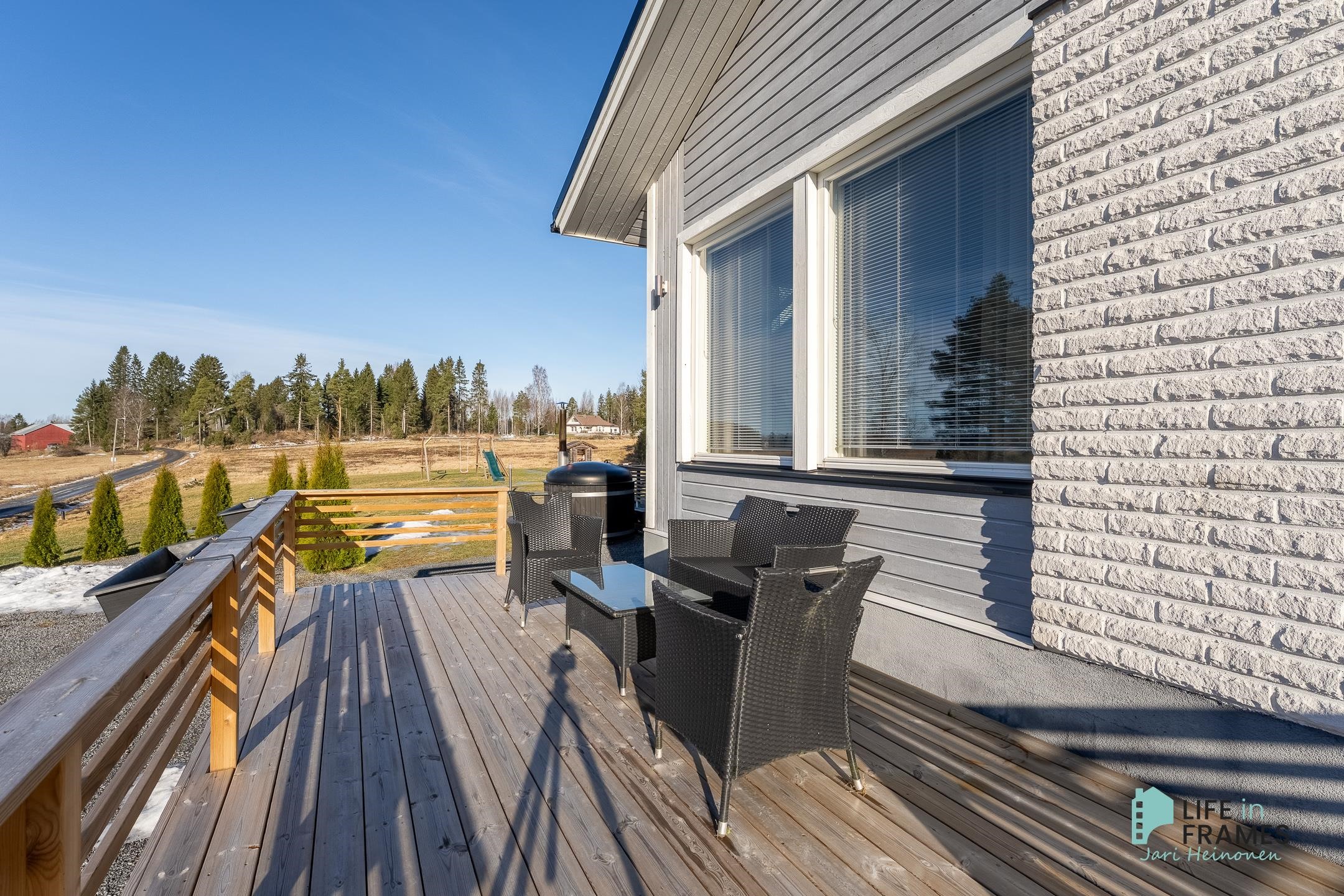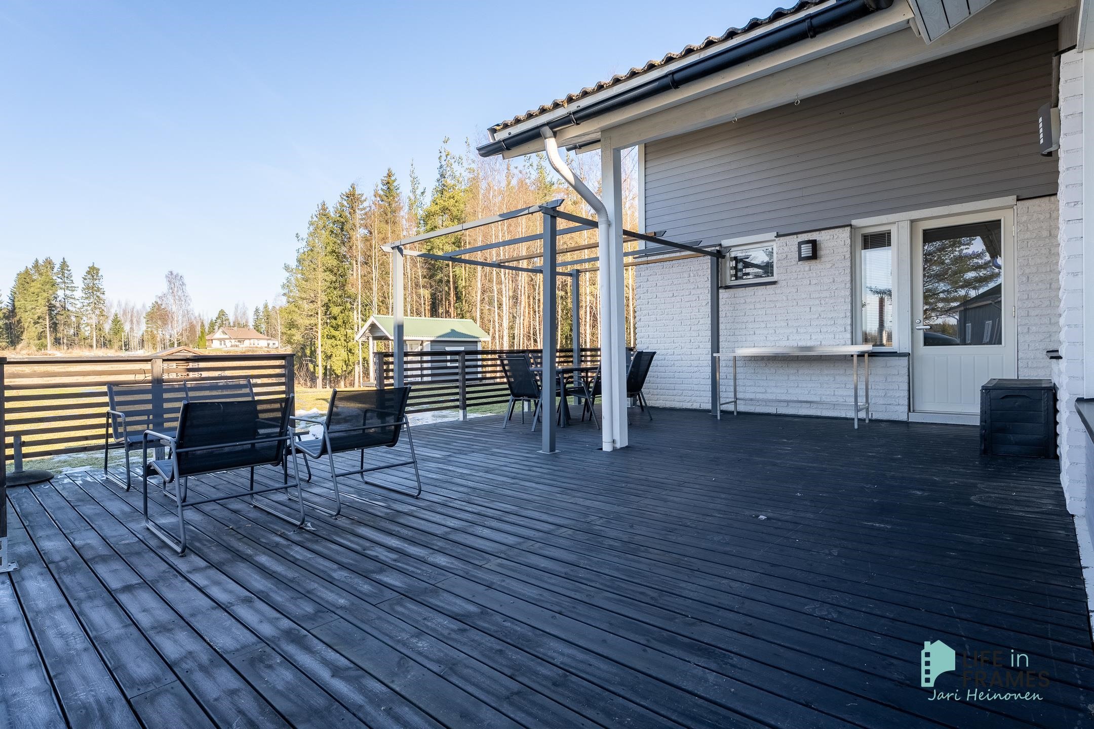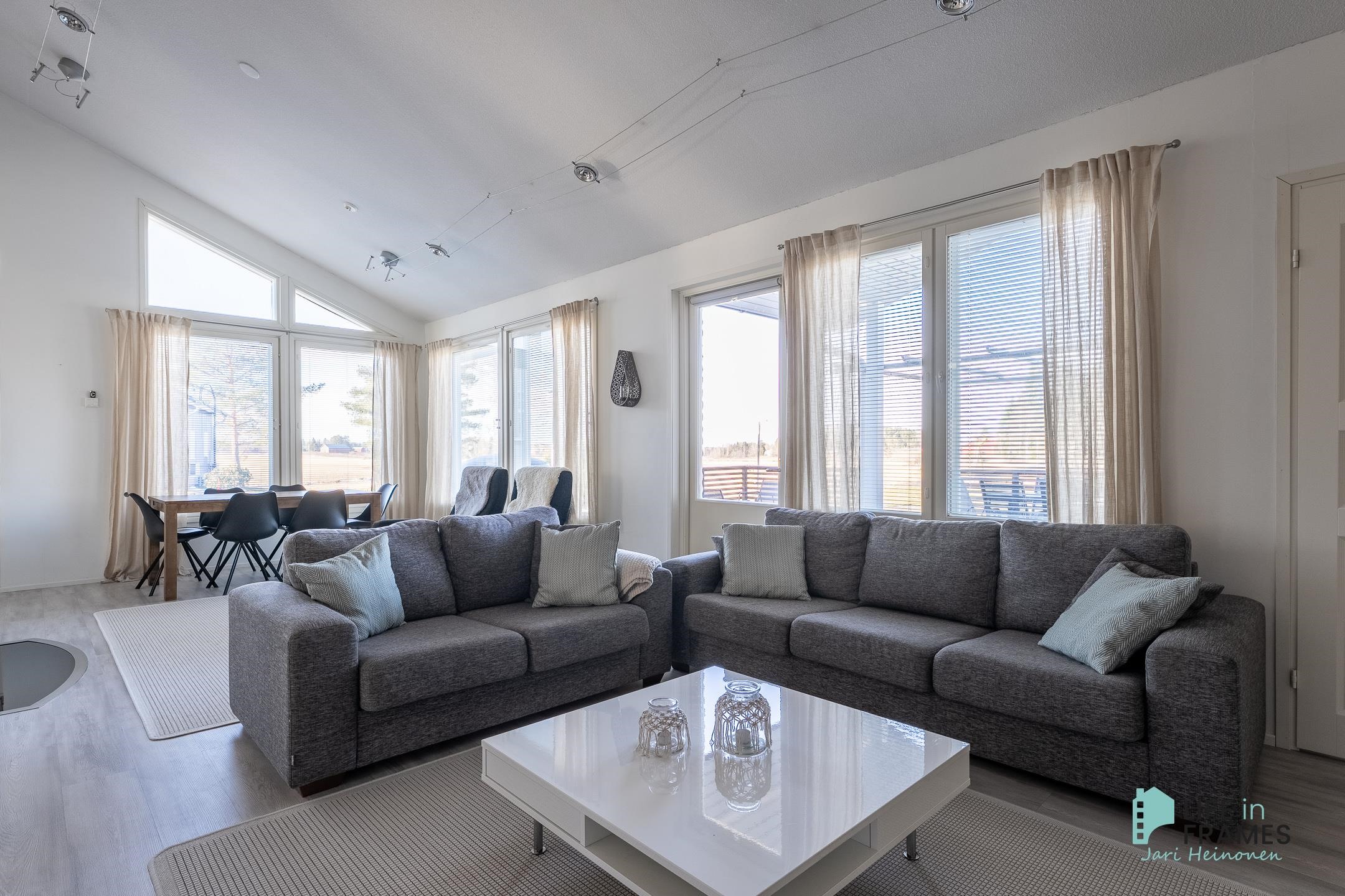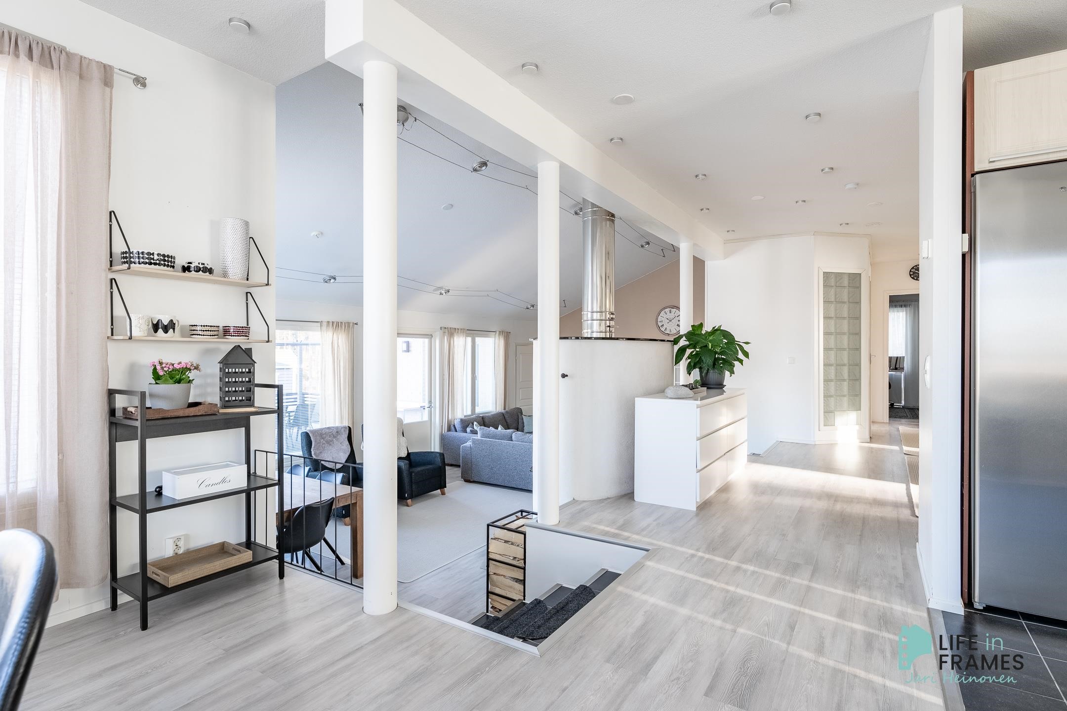 Pohjaratkaisu on toimiva ja talossa on useampi makuuhuone, mikä tarjoaa jokaiselle perheenjäsenelle omaa rauhaa. Kodin sydämenä on ehdottomasti avoin keittiön, ruokailutilan ja olohuoneen muodostama kokonaisuus. Tilan keskiössä on upea varaava takka, joka toimii niin lämmön lähteenä kuin tunnelman luojanakin. Keittiössä mahtuu kokkailemaan useampikin kokki ja ruokapöydälle on oma paikkansa valoisassa erkkerissä. Muutaman askelman alempana sijaitsevan olohuoneen viistokatto tuo avaruutta koko tilaan. Olohuone jatkuu luontevasti reilunkokoiselle terassille.