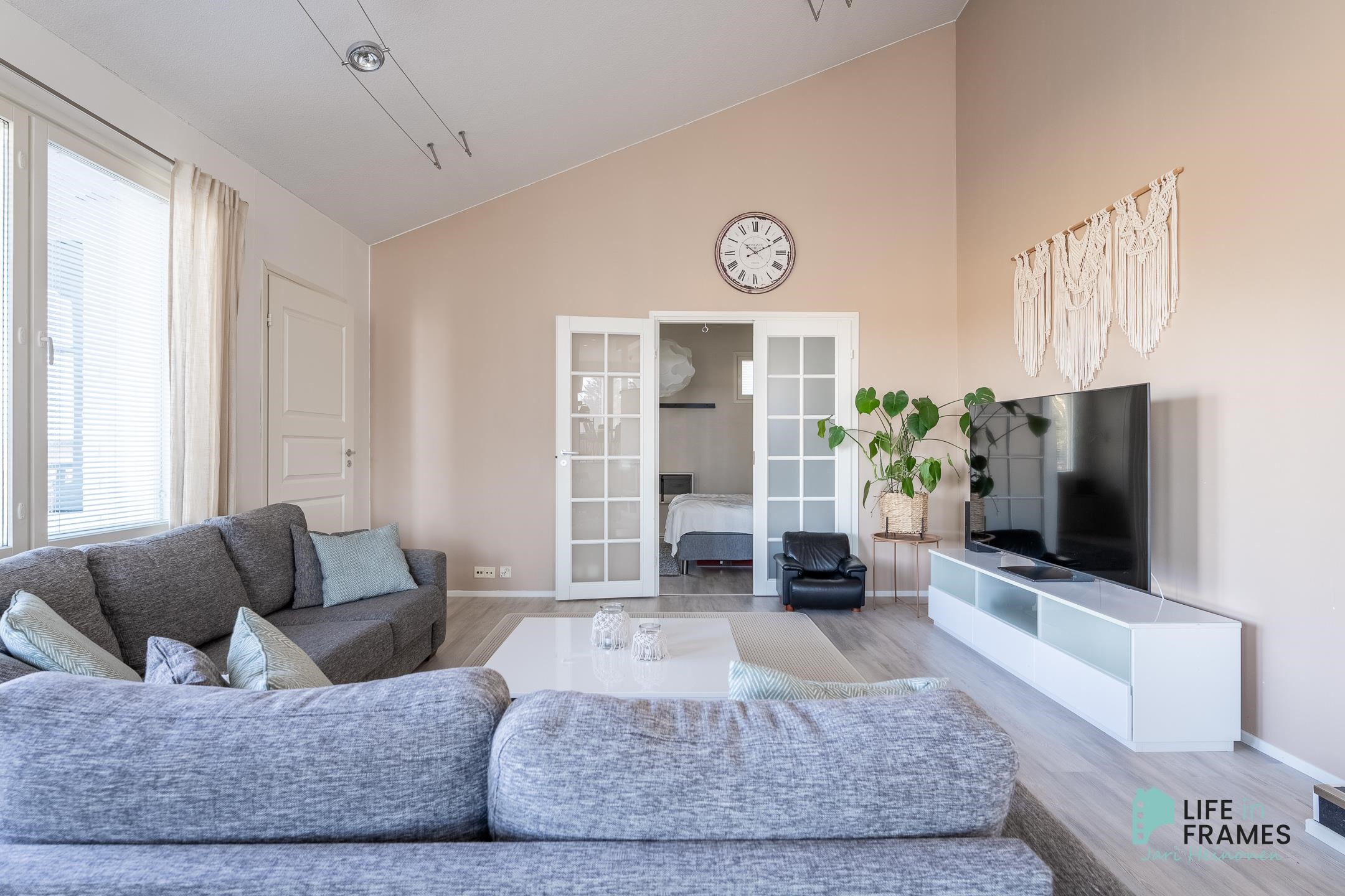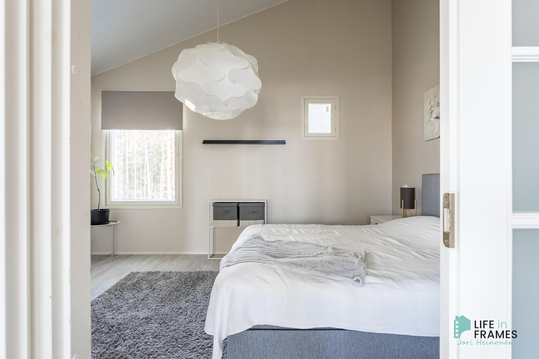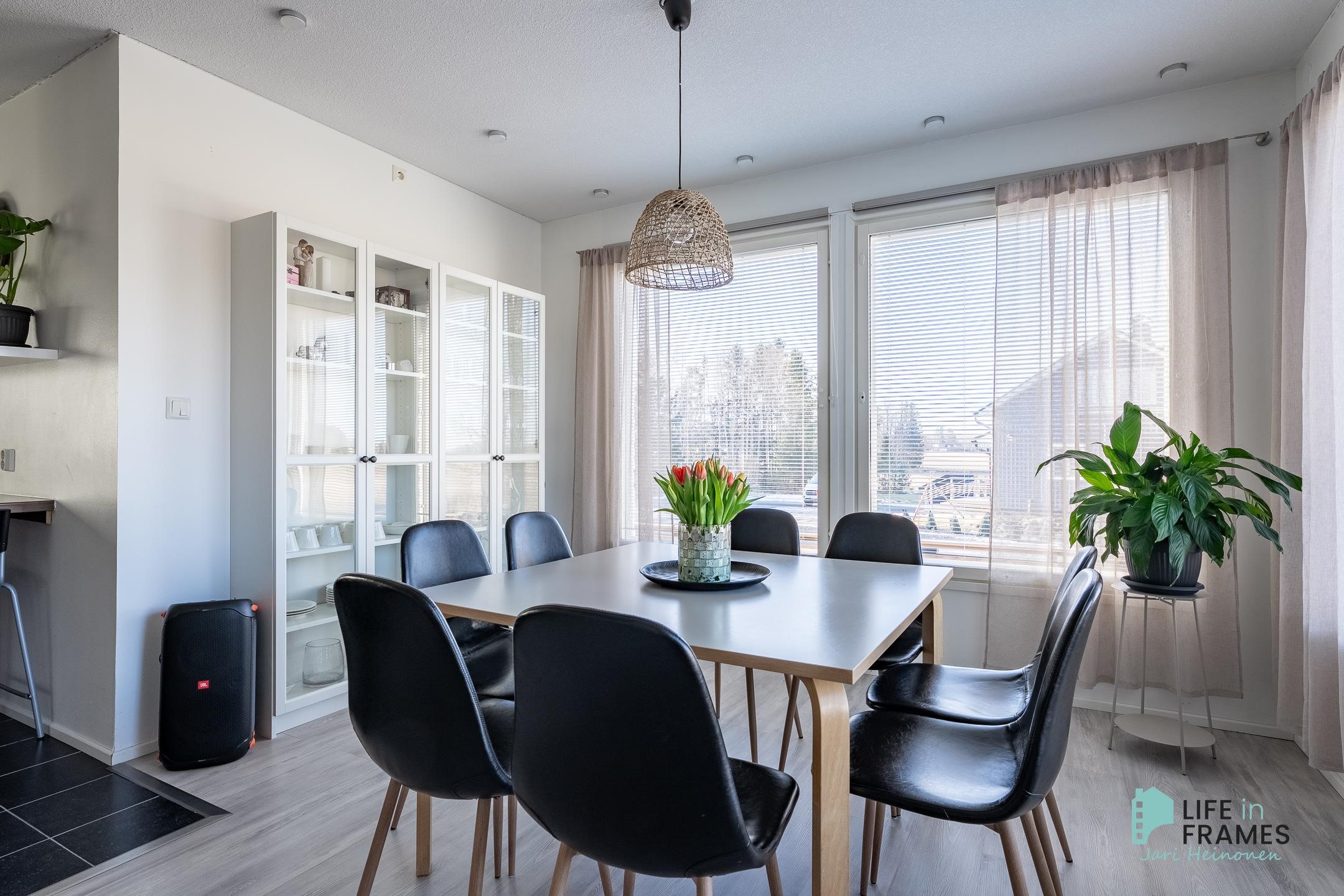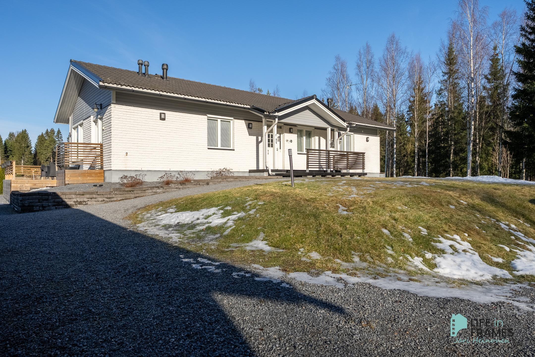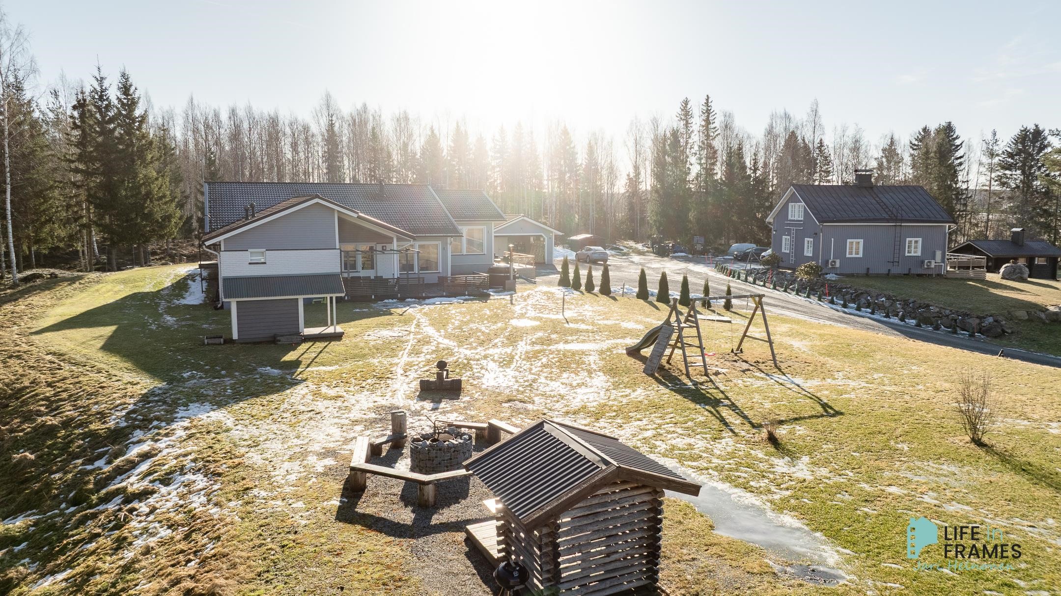 Pohjaratkaisu on toimiva ja talossa on useampi makuuhuone, mikä tarjoaa jokaiselle perheenjäsenelle omaa rauhaa. Kodin sydämenä on ehdottomasti avoin keittiön, ruokailutilan ja olohuoneen muodostama kokonaisuus. Tilan keskiössä on upea varaava takka, joka toimii niin lämmön lähteenä kuin tunnelman luojanakin. Keittiössä mahtuu kokkailemaan useampikin kokki ja ruokapöydälle on oma paikkansa valoisassa erkkerissä. Muutaman askelman alempana sijaitsevan olohuoneen viistokatto tuo avaruutta koko tilaan. Olohuone jatkuu luontevasti reilunkokoiselle terassille.