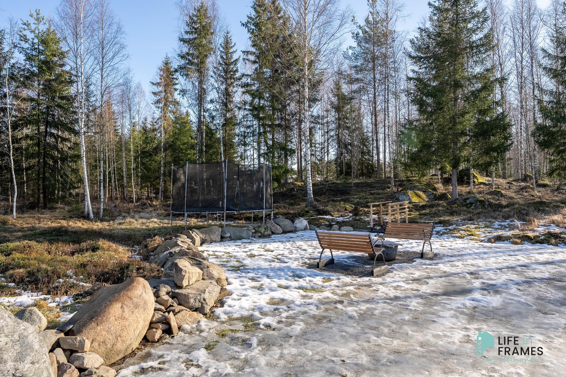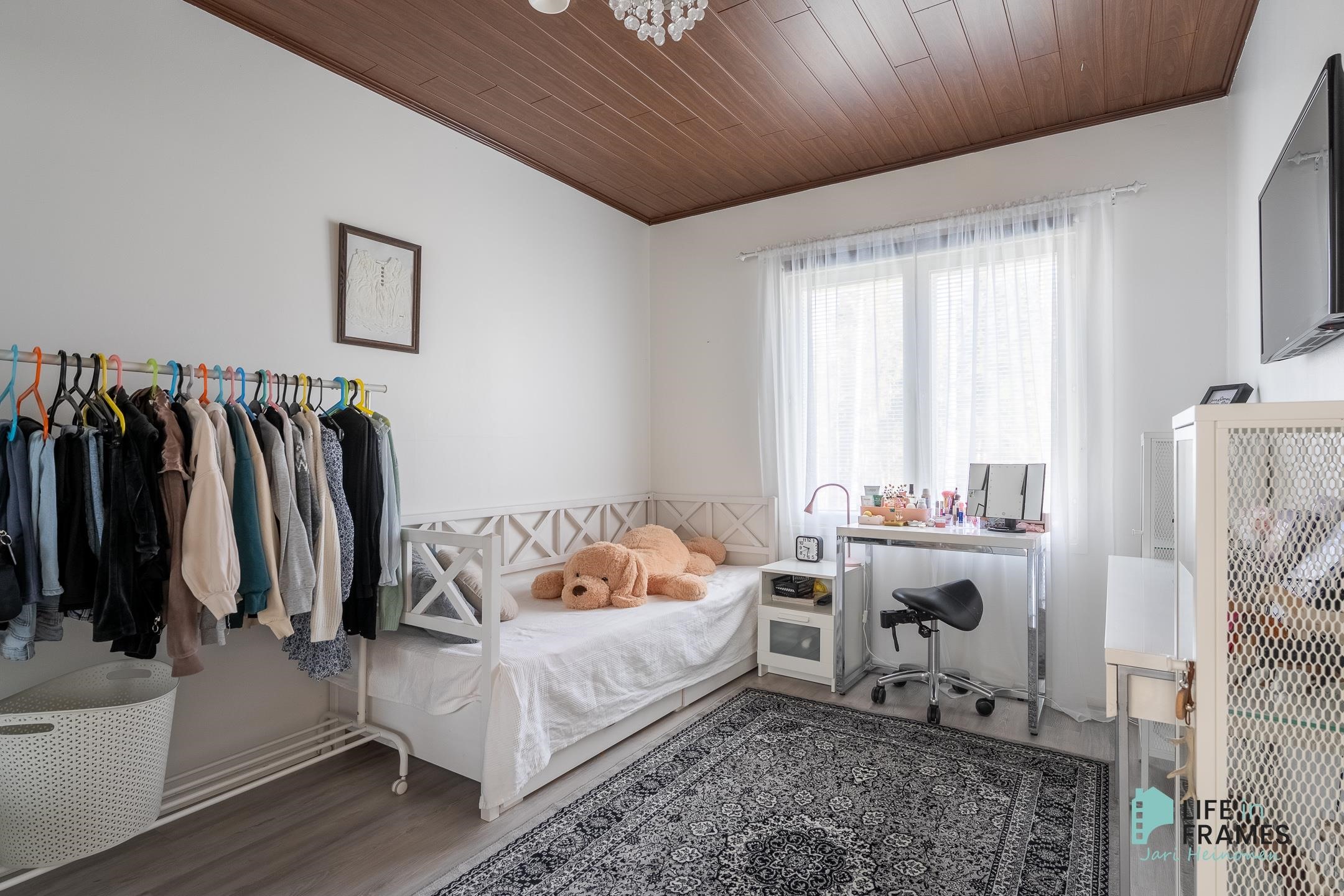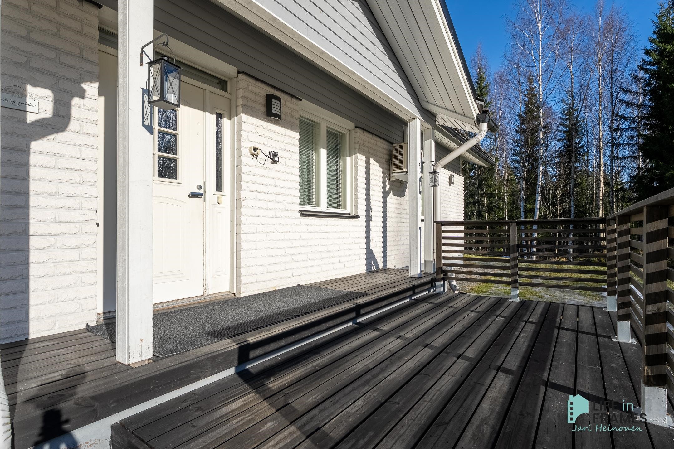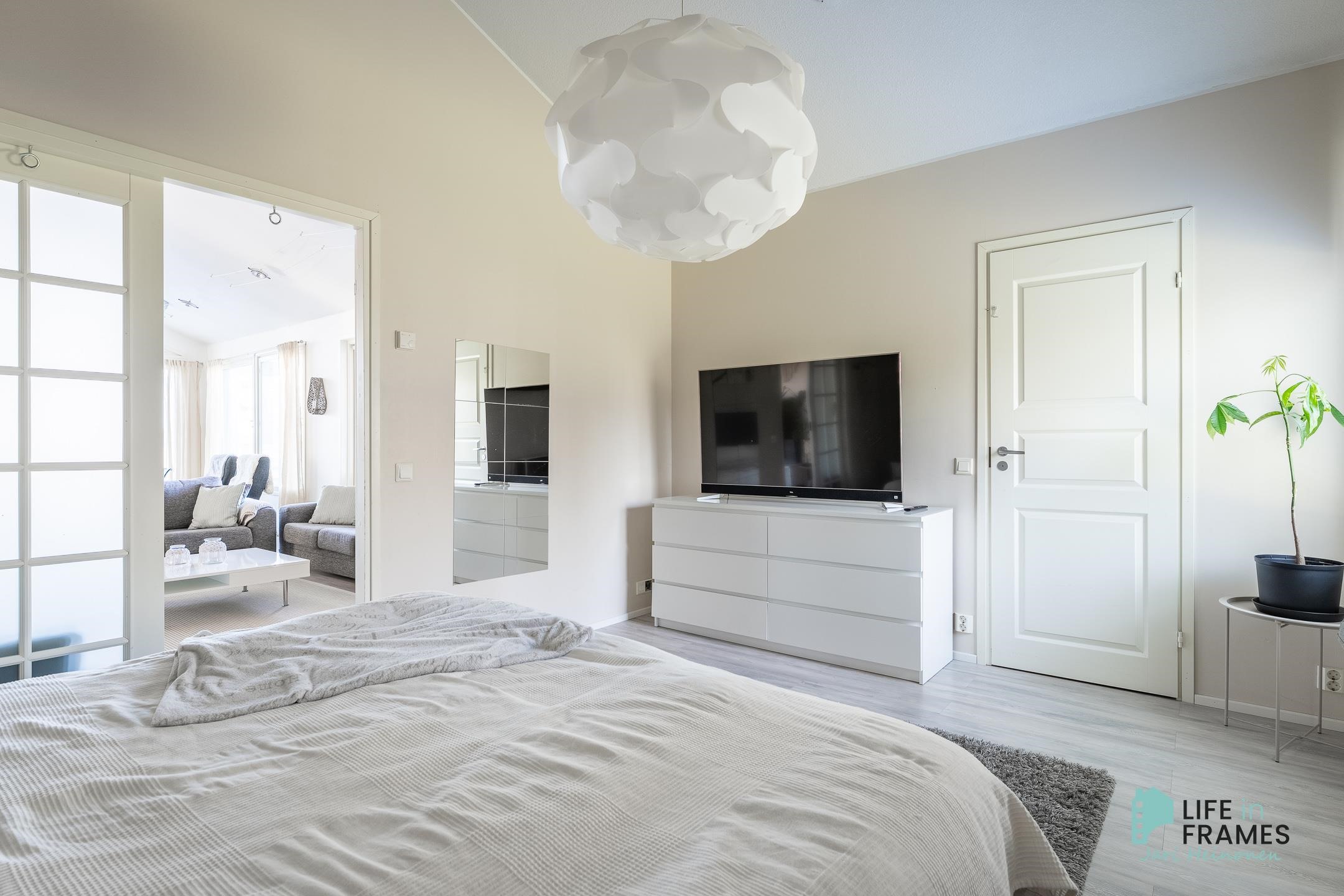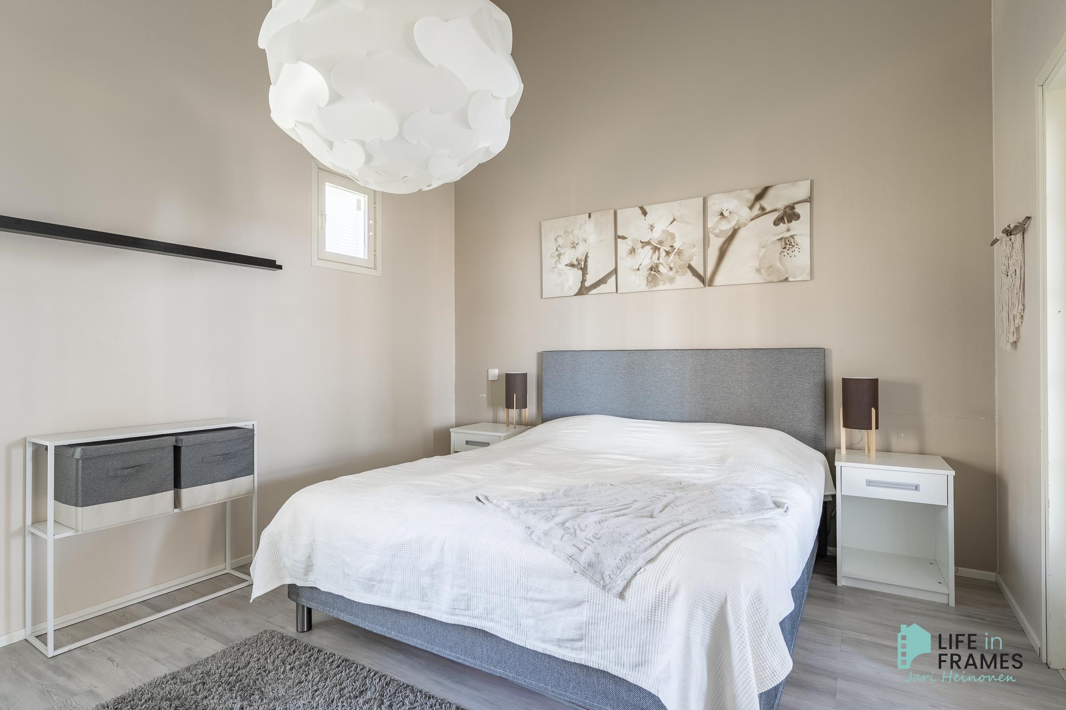 Pohjaratkaisu on toimiva ja talossa on useampi makuuhuone, mikä tarjoaa jokaiselle perheenjäsenelle omaa rauhaa. Kodin sydämenä on ehdottomasti avoin keittiön, ruokailutilan ja olohuoneen muodostama kokonaisuus. Tilan keskiössä on upea varaava takka, joka toimii niin lämmön lähteenä kuin tunnelman luojanakin. Keittiössä mahtuu kokkailemaan useampikin kokki ja ruokapöydälle on oma paikkansa valoisassa erkkerissä. Muutaman askelman alempana sijaitsevan olohuoneen viistokatto tuo avaruutta koko tilaan. Olohuone jatkuu luontevasti reilunkokoiselle terassille.