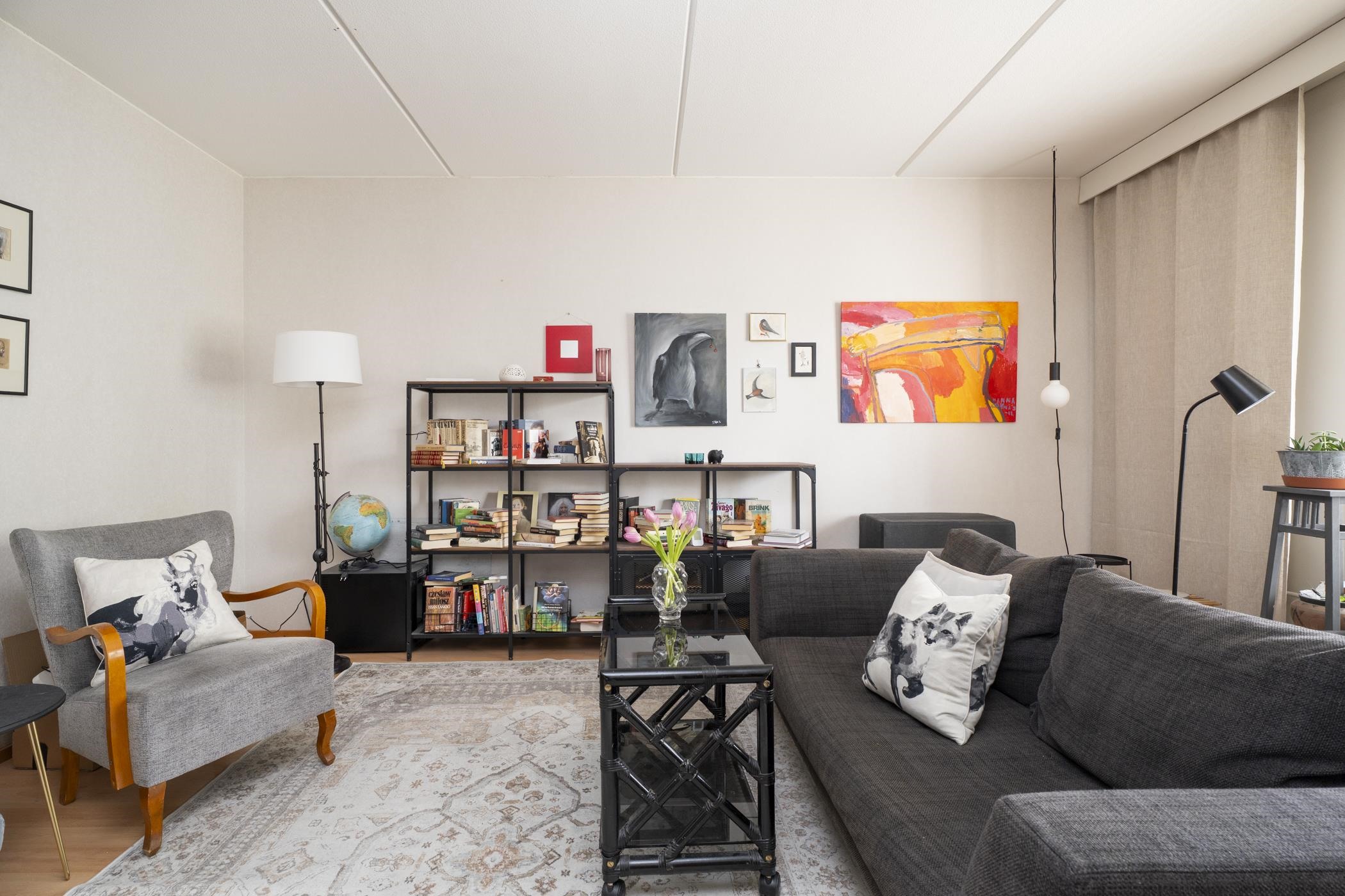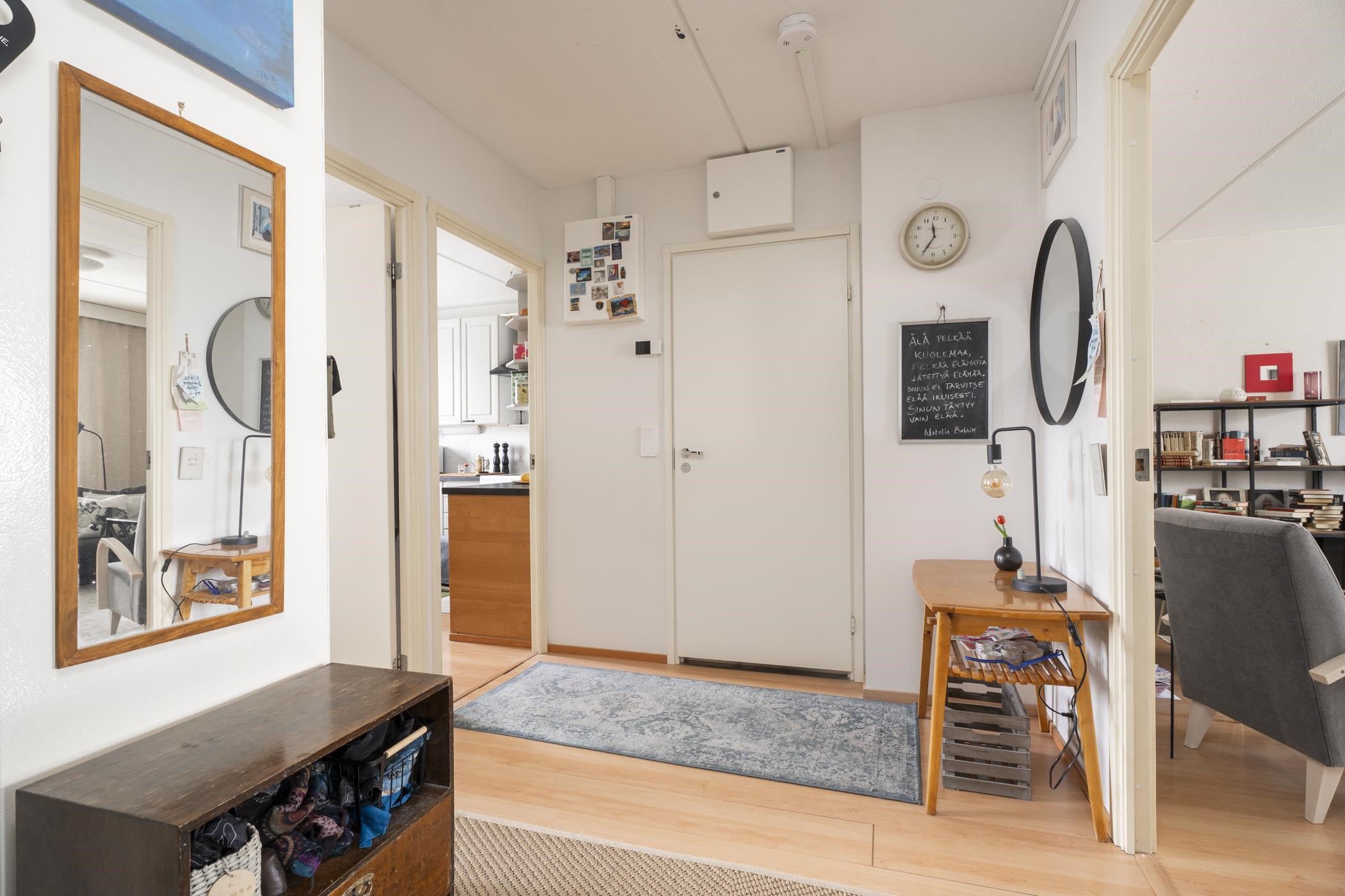 Keittiö: laminaatti, maali. Olohuone: laminaatti, tapetti/maali. Makuuhuone 1: laminaatti, tapetti/maali. Makuuhuone 2: laminaatti, tapetti/maali. Kylpyhuone: laatta, laatta. Eteinen: laminaatti, maali.