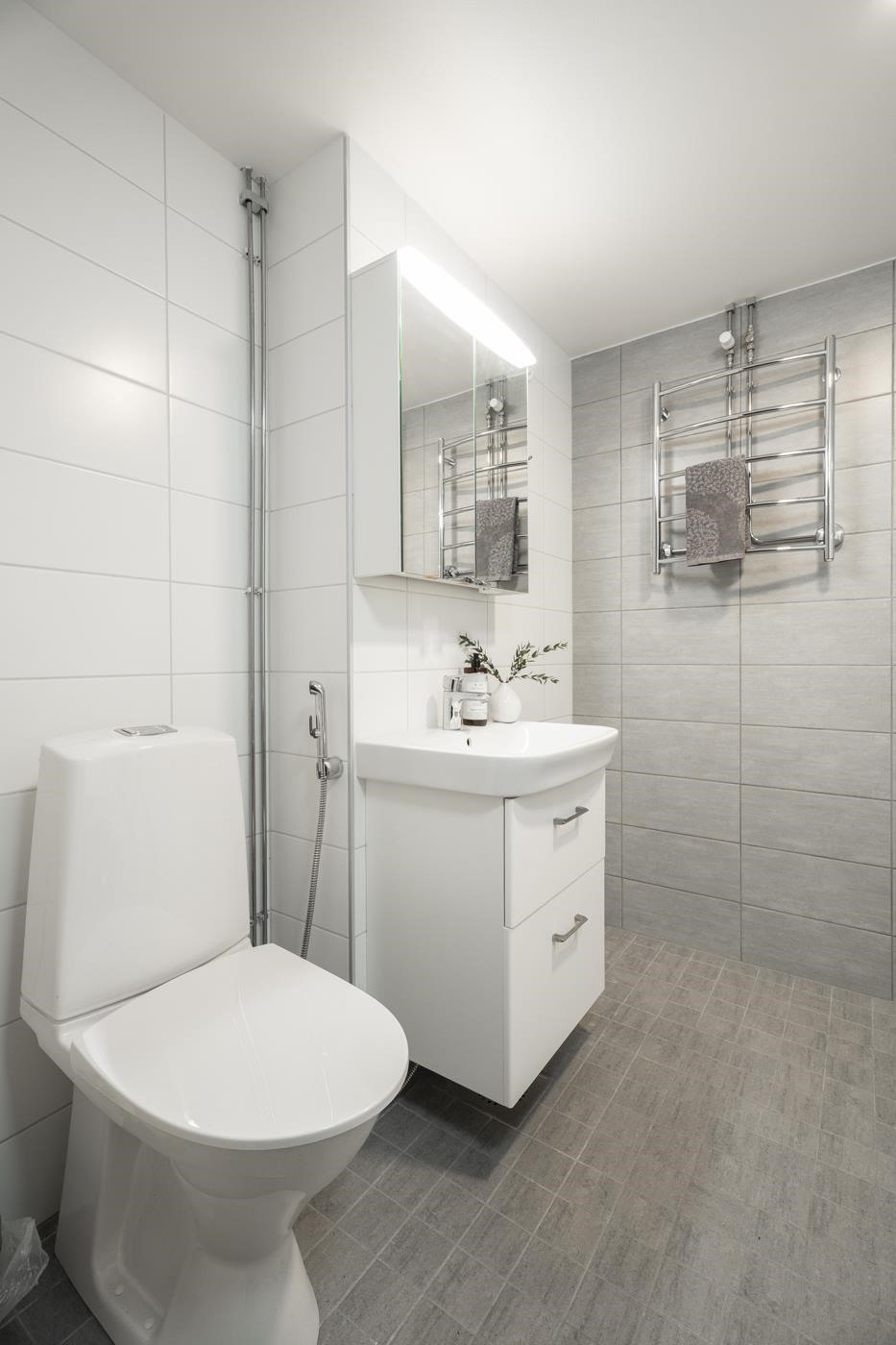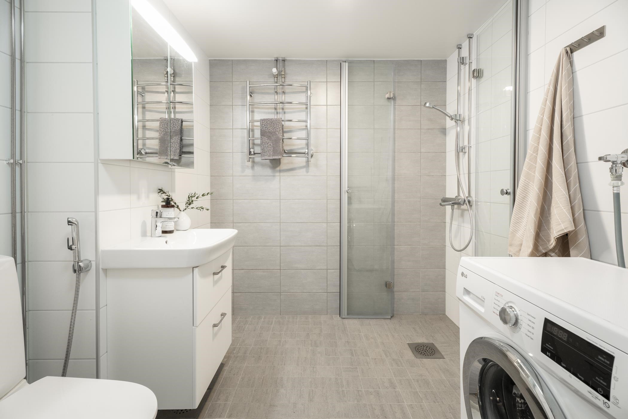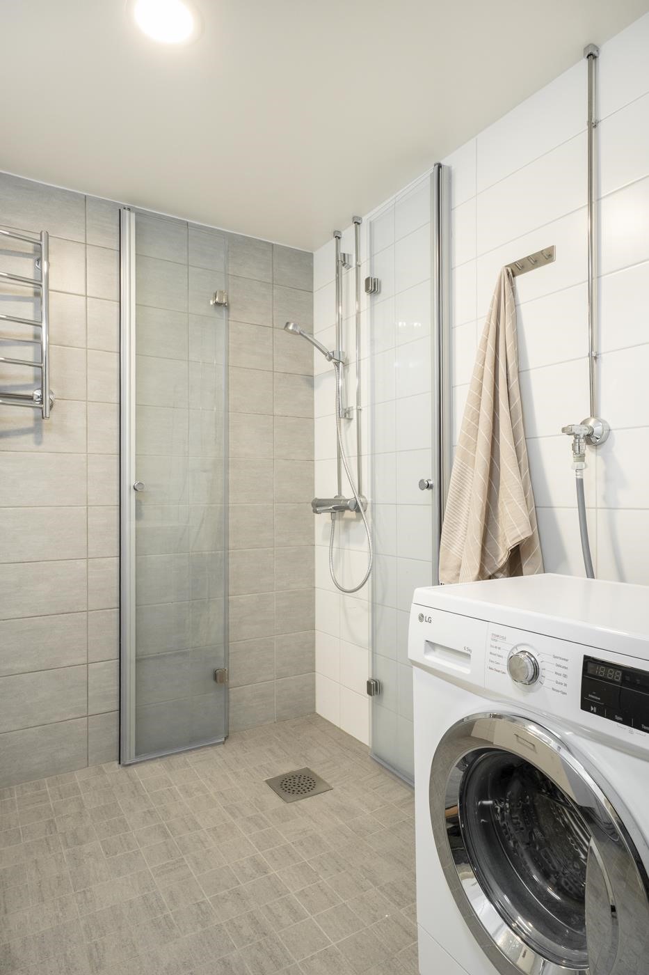 - Kylpyhuoneessa suihku, suihkuseinä, peilikaappi, allaskaappi, pesukoneliitäntä, lattialämmitys, kiinteät valaisimet, pyyhekuivain. Kylpyhuone uusittu putkiremontin yhteydessä.
