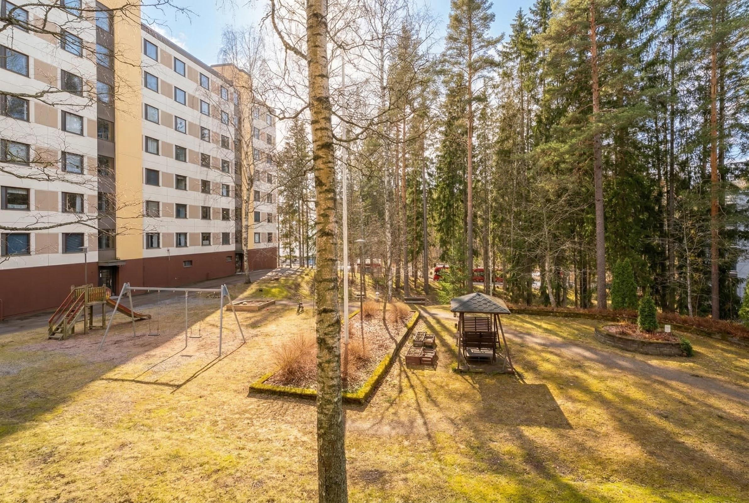 Tästä kodista on Halkoniemen ja Suomensaaren uimarannoille ja viihtyisille lenkkipoluille matkaa alle kilometri. Lielahden kattavat palvelut ovat kolmen kilometrin päässä ja bussin päätepysäkki on lähellä ja ratikkalinjan päätepysäkki aivan talon nurkalla.
