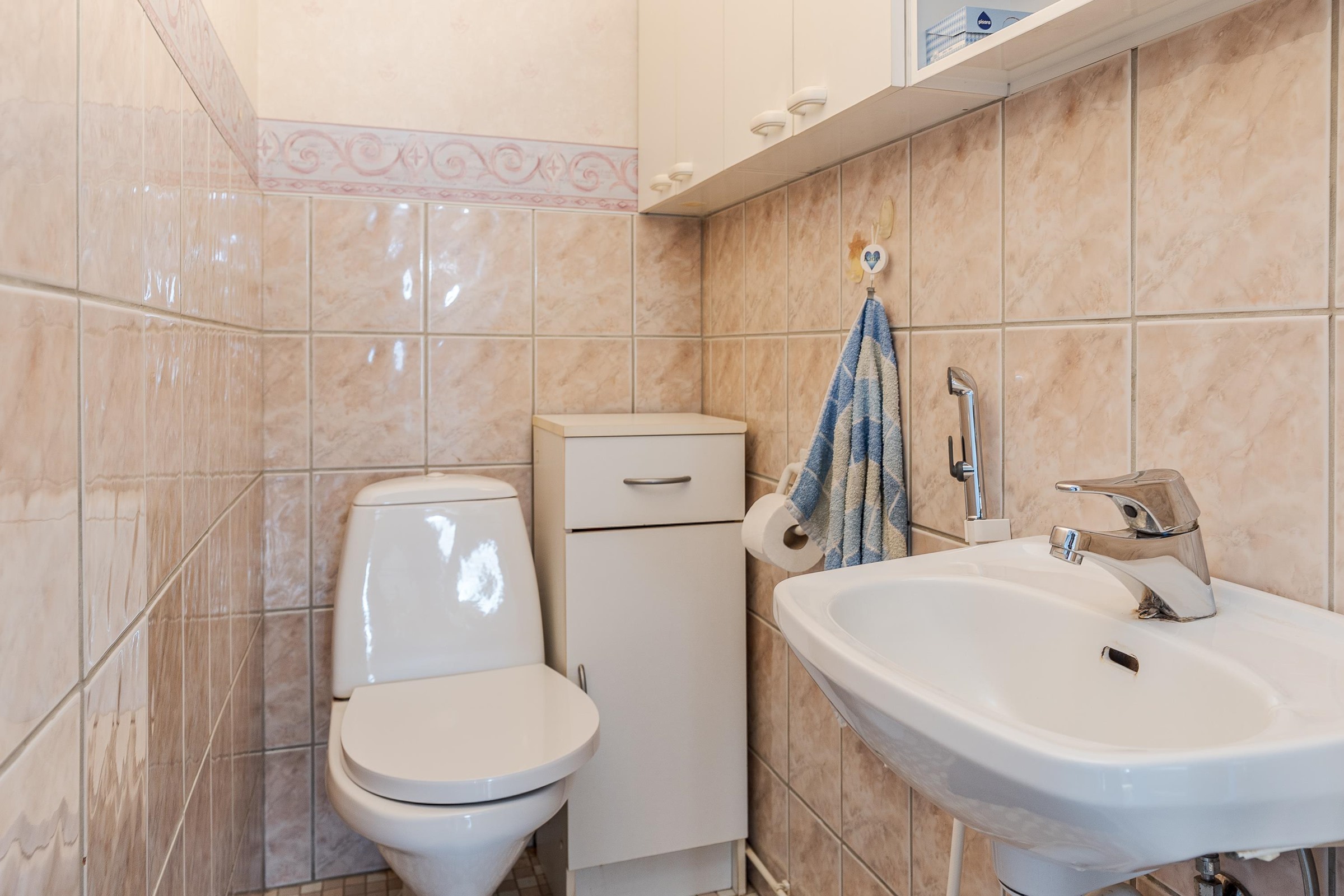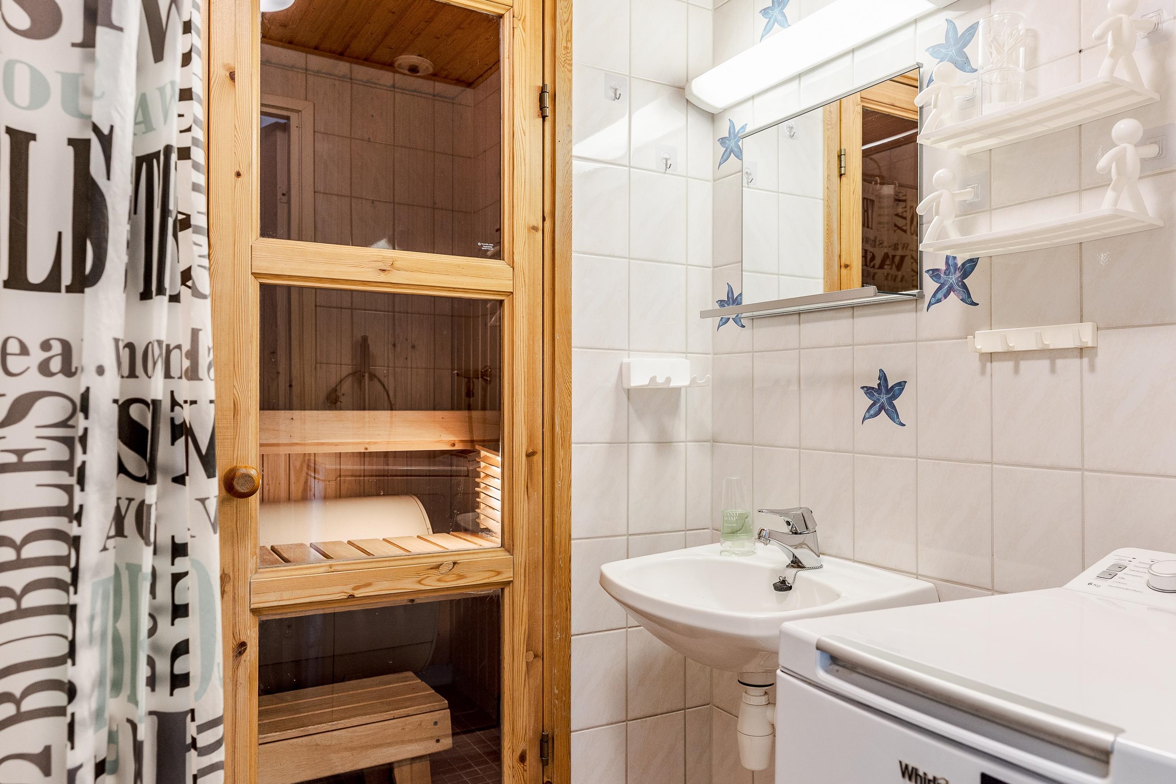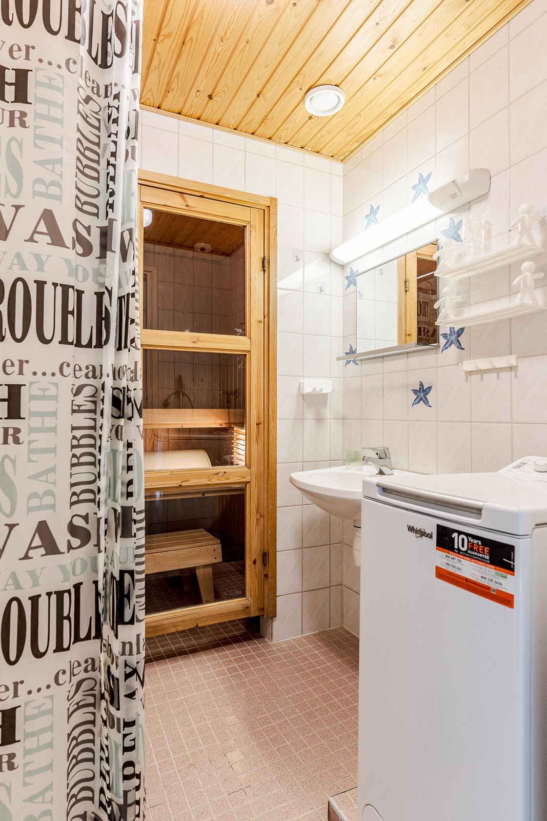 - Sauna (saunaa ei käytetty viimeiseen seitsämään vuoteen), sähkökiuas, kylpyhuone, erillinen wc, suihku, peilit, peilikaappi, kaapit, pesukoneliitäntä kylpyhuoneessa, lattialämmitys kylpyhuoneessa, kiinteät valaisimet.