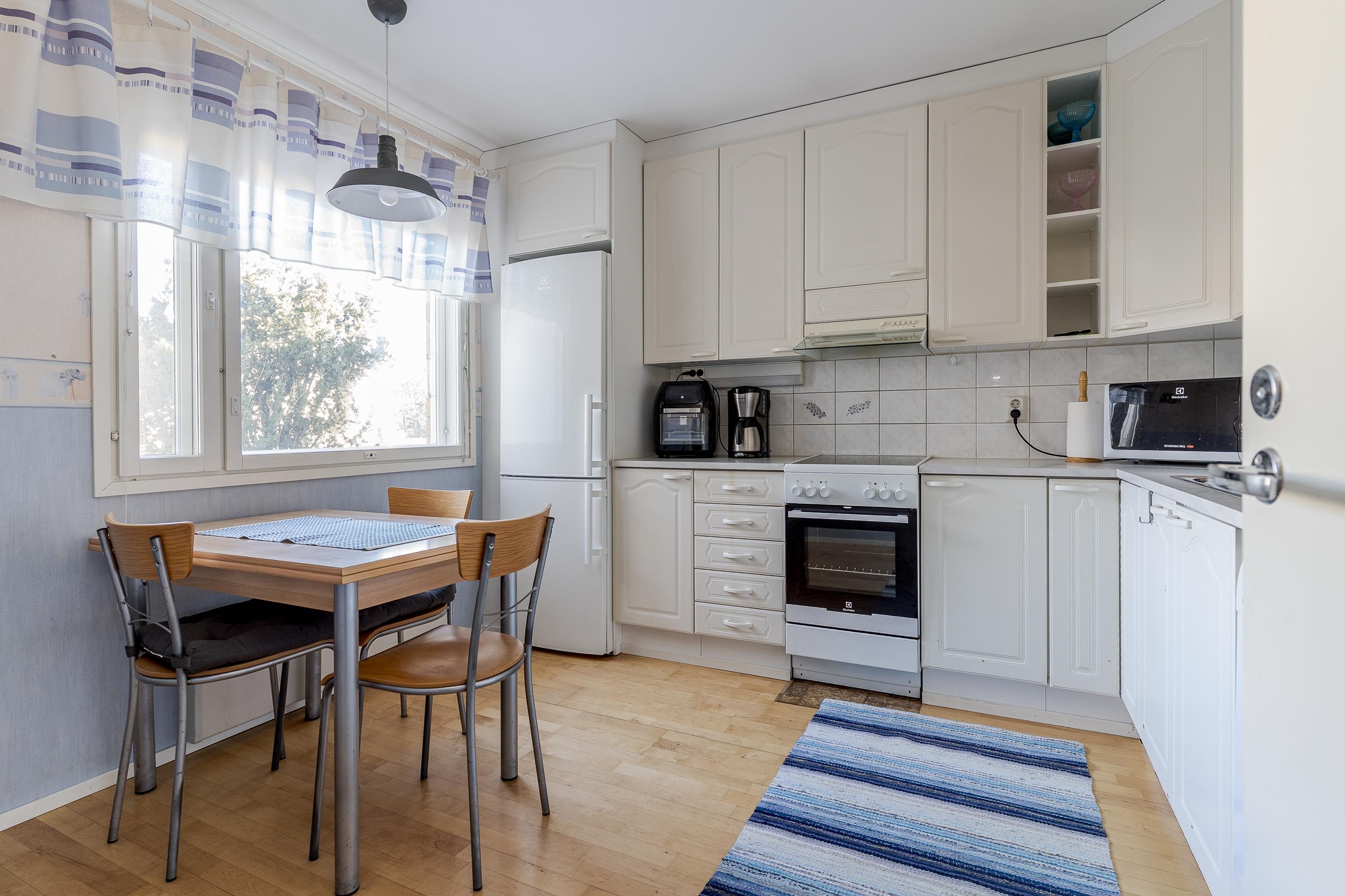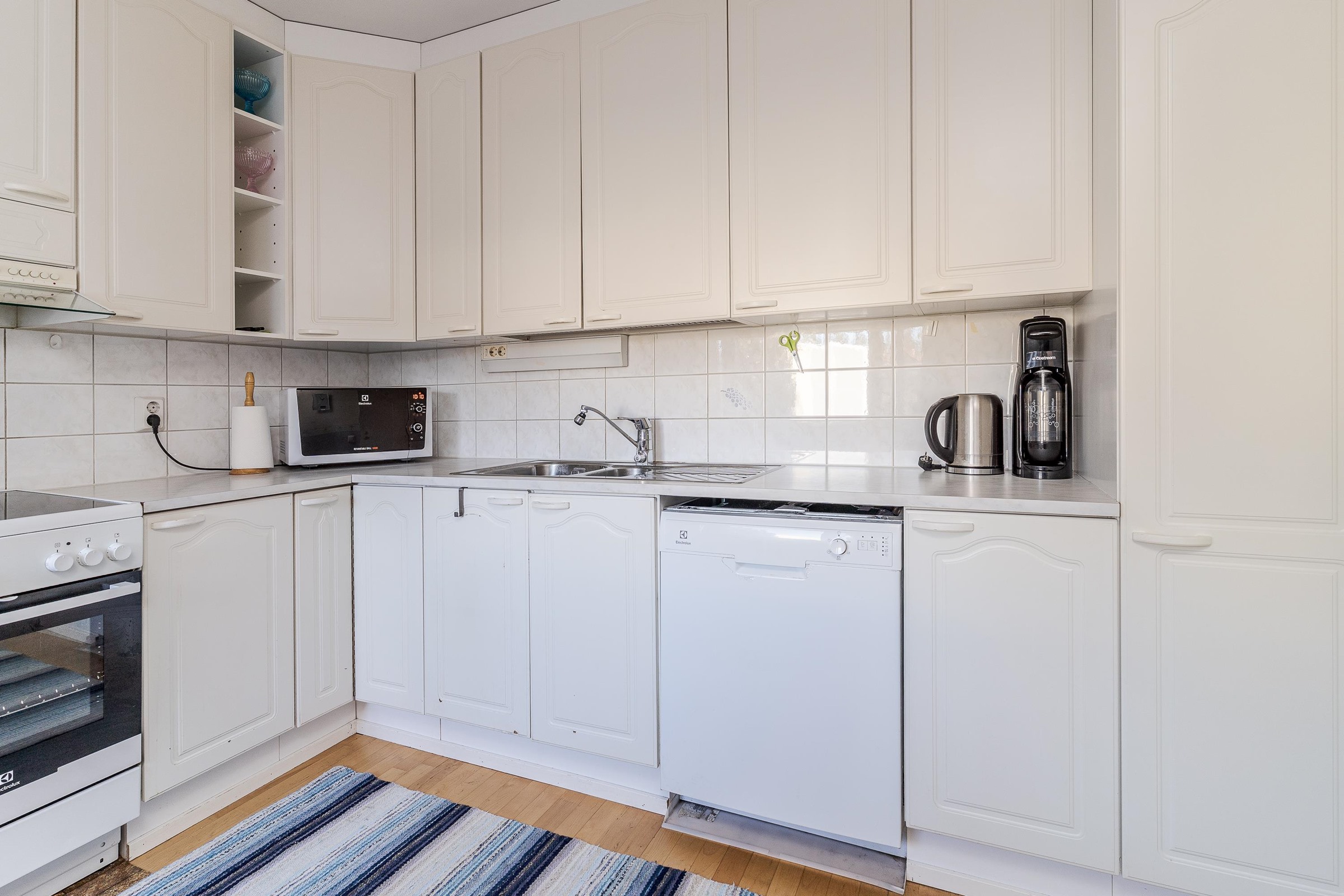 - Jääkaappipakastin, keraaminen liesi, liesituuletin, astianpesukone, kaapistot, kiinteät valaisimet.