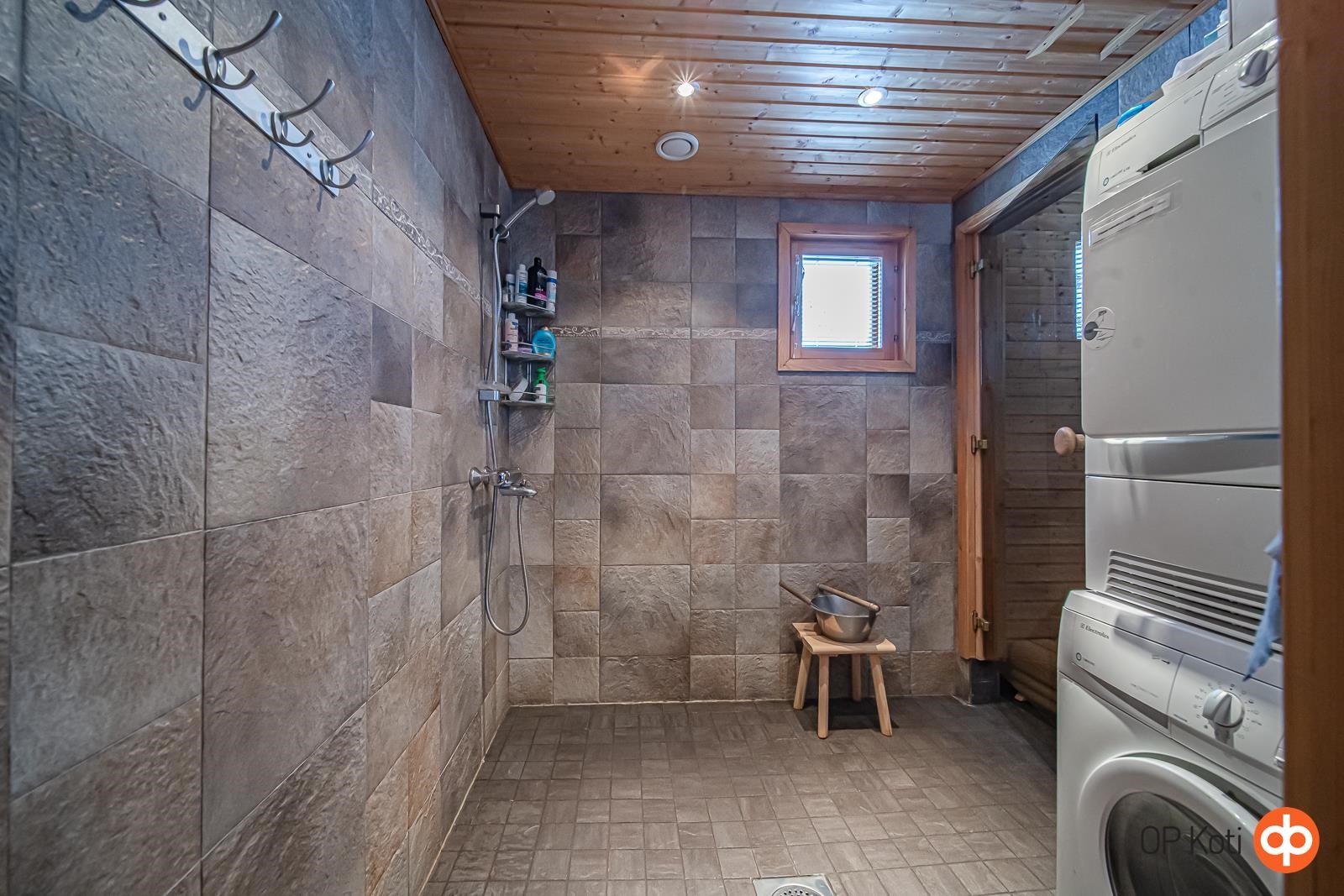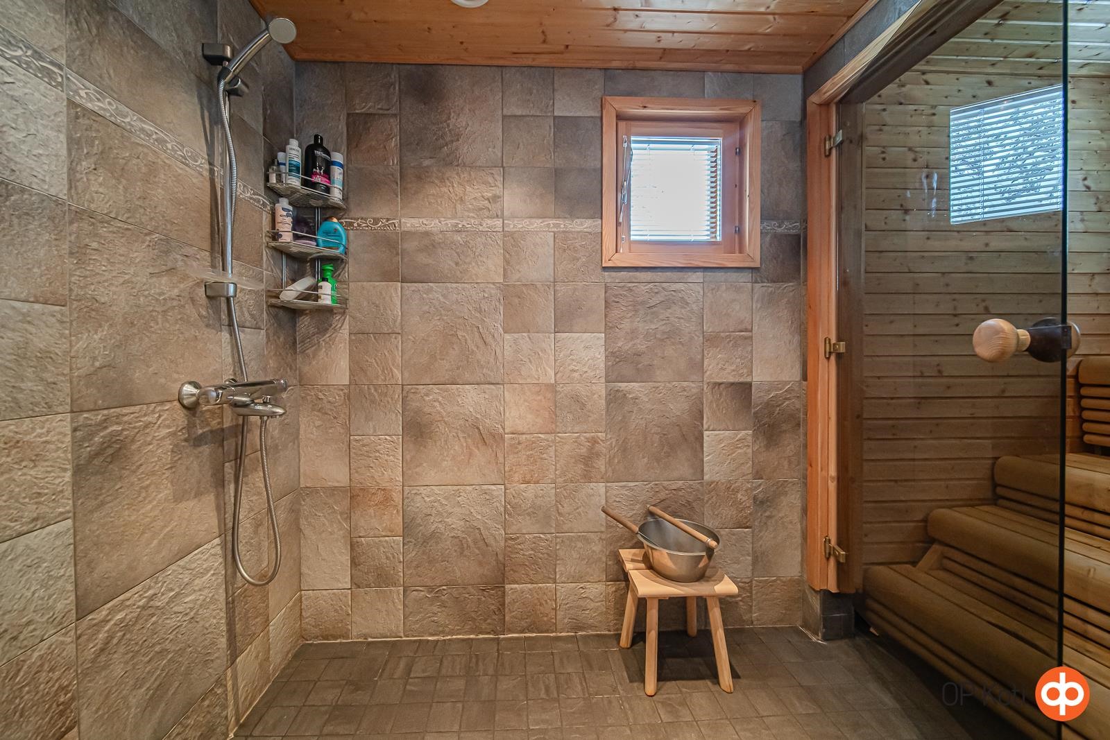 - Sauna, sähkökiuas, kylpyhuone, erillinen wc, suihku, peilikaappi, kaapit, allaskaappi, pesukoneliitäntä, lattialämmitys, kiinteät valaisimet. Lattialämmitys koko alakerrassa, yläkerrassa sähköpatterit. Sähköpatterit myös alakerran wc ja eteistilassa.