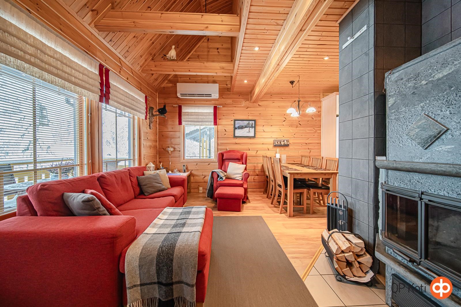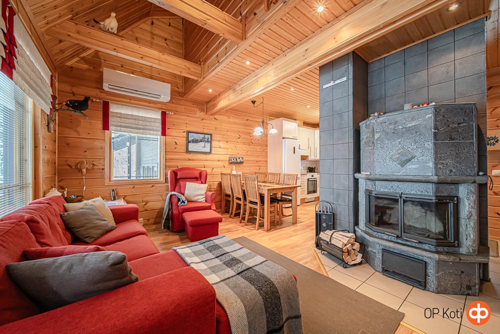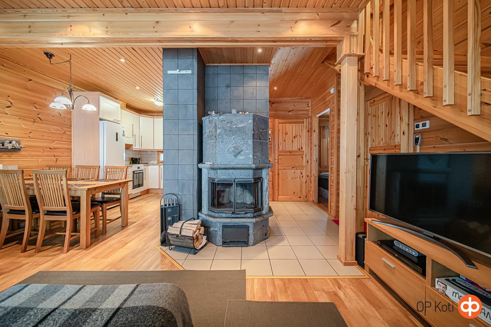 Huoneistossa on toimiva pohjaratkaisu ja modernit varusteet. Alakerrassa on valoisa tupakeittiö, makuuhuone, kylpyhuone, sauna ja erillinen wc. Yläkerrassa sijaitsevat makuualkovit tarjoavat mukavat nukkumatilat useammallekin yöpyjälle. Keittiössä on kaikki tarvittava ruoanlaittoon - jääkaappipakastin, keraaminen liesi, astianpesukone ja mikroaaltouuni. Olohuoneessa varaava takka luo viihtyisyyttä, ja sauna tarjoaa pehmeät löylyt ulkoilupäivän jälkeen. Huoneiston yhteydessä on terassi ja piha, joissa voit nauttia Lapin luonnosta.